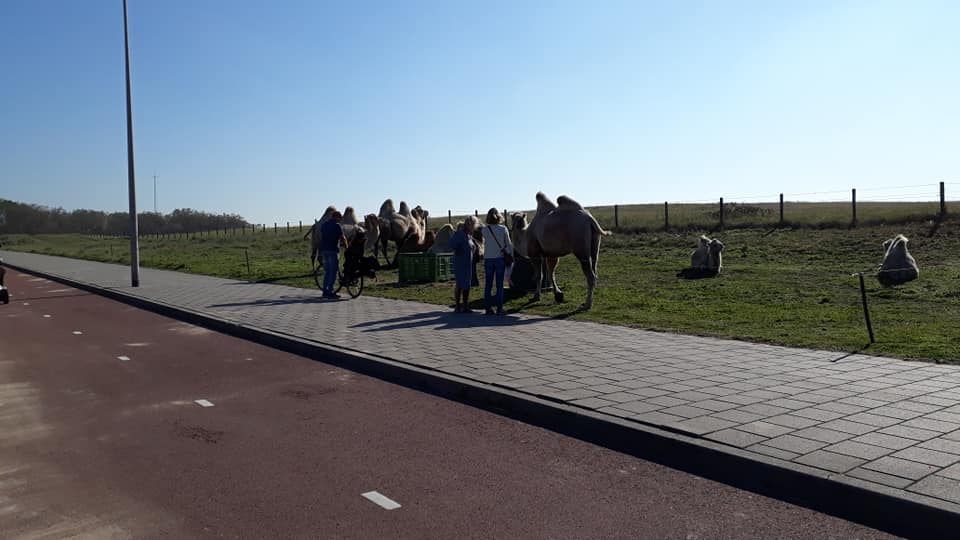 We gaan het die middag zelf bekijken, op loopafstand van huis. Vreugdekreten als ze het bovenste stukje van het circus boven de duinen zien uitkomen. Wat een prachtlocatie is dit! En ja hoor, daar staan de kamelen, met twee kamelenkinderen, en heel veel fietsers die even stoppen. Komt dat zien.