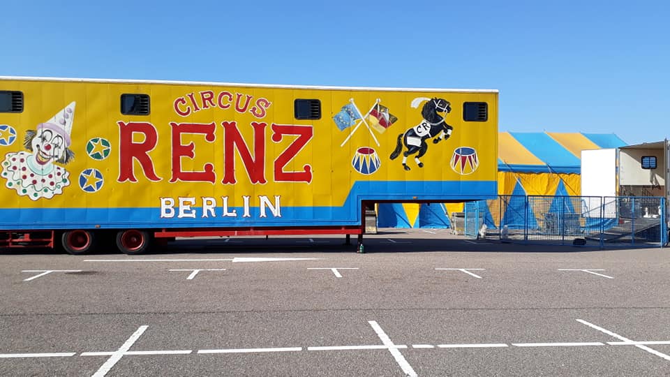 Bij Circus Renz Berlin lijkt het net of de tijd 30 jaar stil heeft gestaan. Hoewel er in de hele circuswereld van alles aan het veranderen is, blijft hier gewoon alles hetzelfde. Muziek komt uit 2 grote boxen achter de coulissen vandaan en staat best hard. Of het lijkt zo, want we zitten vlak naast een van die boxen. En het moet ook wel hard, want de zijkanten van de tent kaatsen geen geluid terug, veel van het geluid verdwijnt dus naarmate je verder de tent in loopt. Eigenlijk zouden we aan de andere kant moeten gaan zitten, maar hier bovenaan loopt het al snel vol, dus we blijven zitten. Het belichtingssysteem is ook al 30 jaar hetzelfde, behalve dat de gewone lampen zijn vervangen door led lichten. Lekker eenvoudig en dat volstaat. In de piste geen zeil, dus dat betekent dat er wordt begonnen met een dierenact. Maar eerst komt een van oor tot oor stralende clown het publiek opwarmen met een klapact. Zijn lange puntschoenen worden bewonderd door de meiden.
