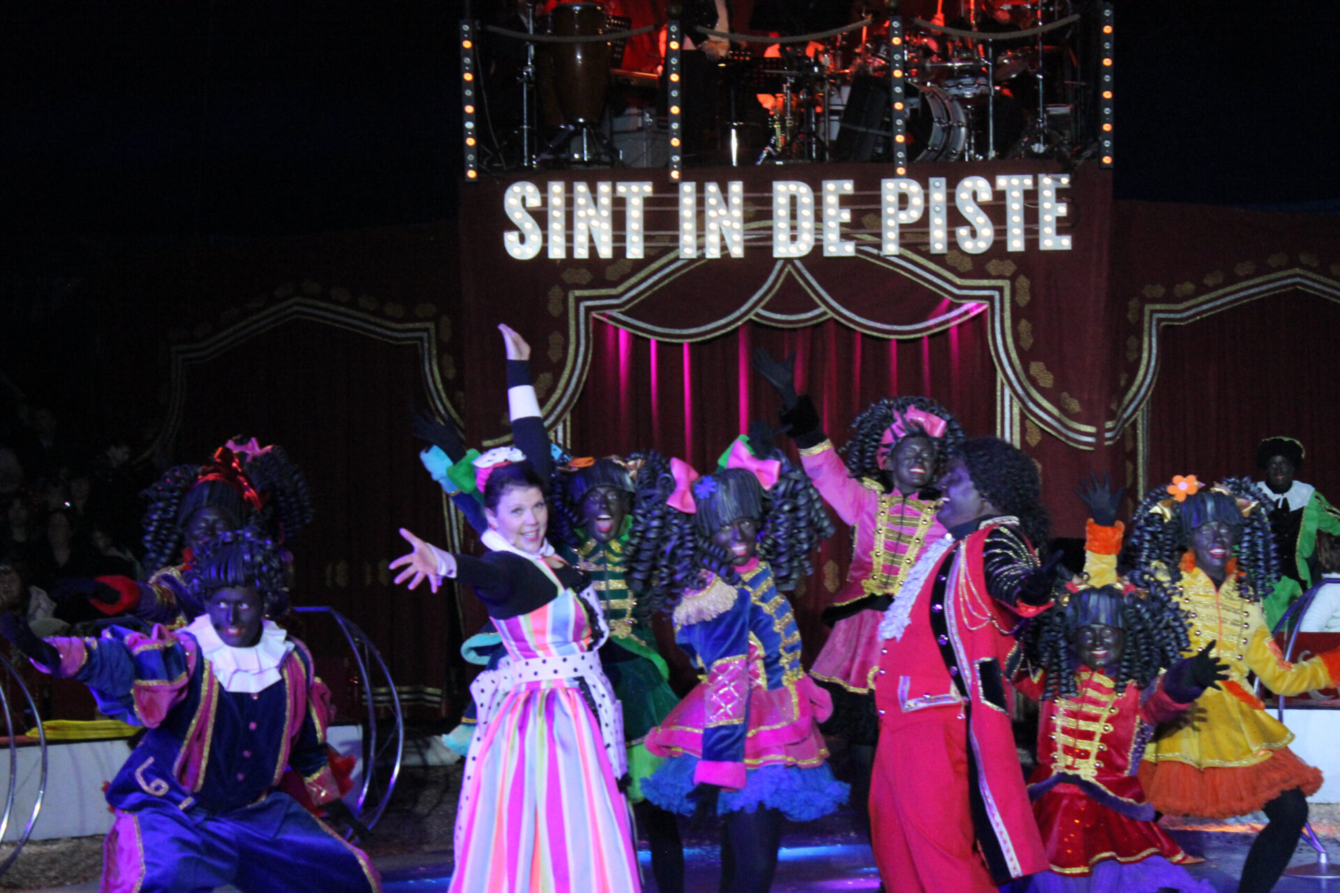 Dit jaar zagen we in het anderhalf uur durende indrukwekkende, spektakelprogramma behalve de Sint, de kerstman, verschillende typetjes, een ballet en zo’n 60 Zwarte Pieten de navolgende artiesten: