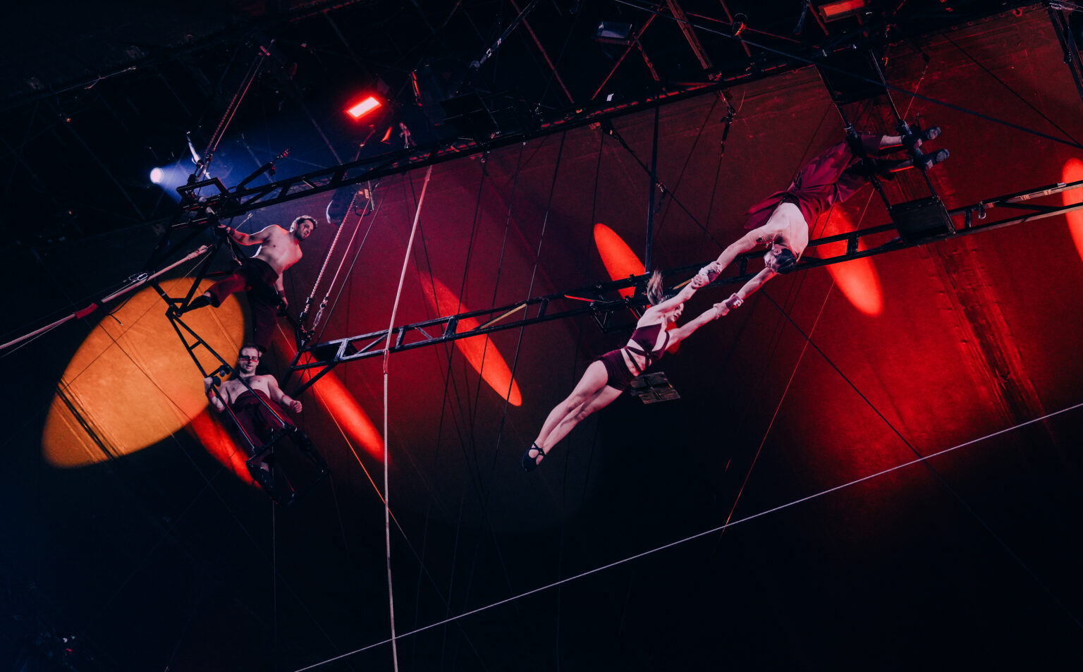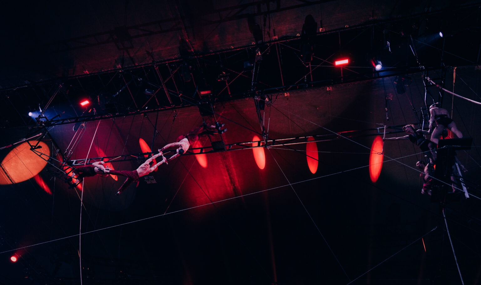 Gekleed in donkerrood met geschminkte rode strepen lijken ze mythische figuren. Er gebeurt constant iets: enorme sprongen van rechts naar links, trapezewerkers die omhoog worden getakeld door een ingenieus hijssysteem, anderen die langs een truss-constructie omhoog en omlaag klimmen. Van spectaculaire salto’s tot een adembenemend spel van flyers en catchers op verschillende plekken in de trapezeconstructie.