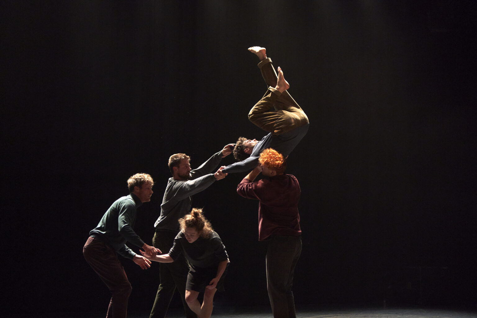 Het trio ‘Knot on Hands’ en het duo ‘Kim & Marta’ in de voorstelling ‘Meander’. (Foto door: Jona Harnischmacher)