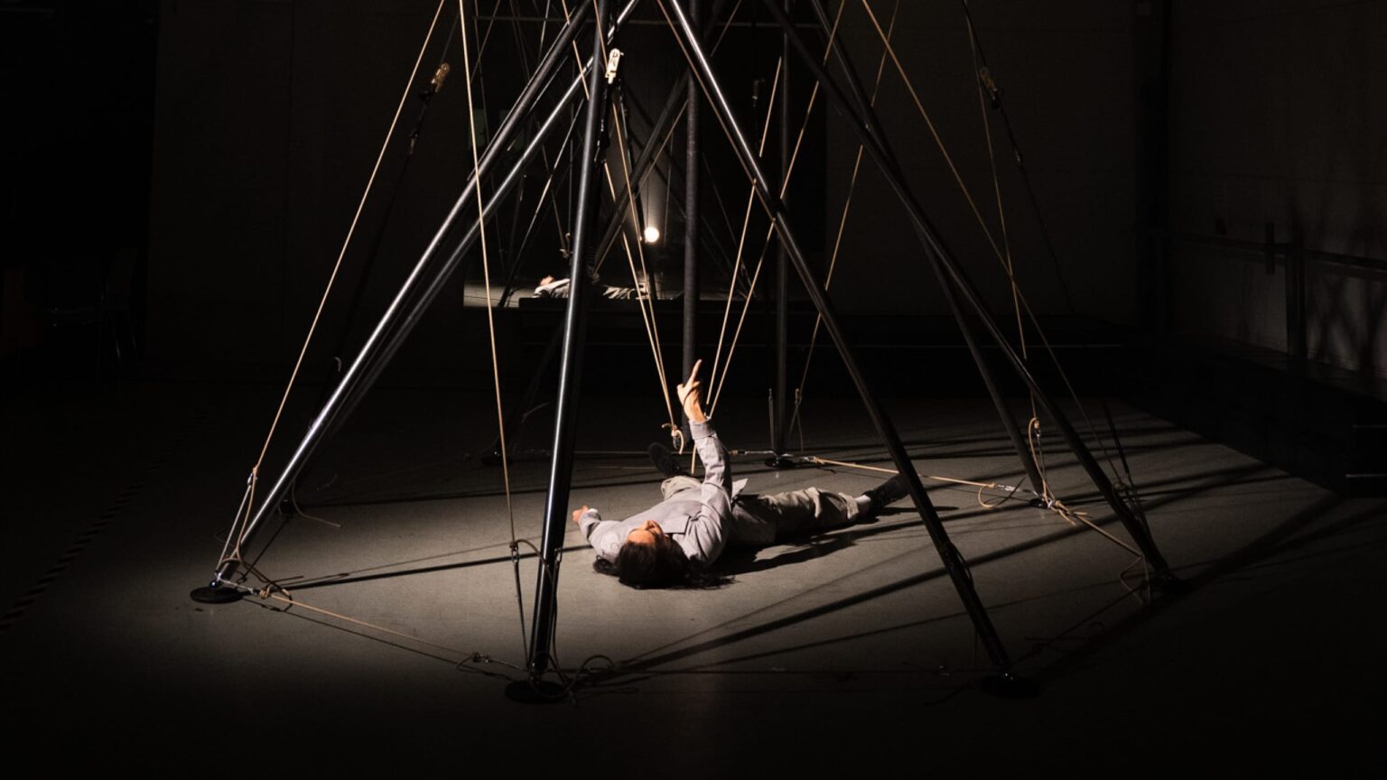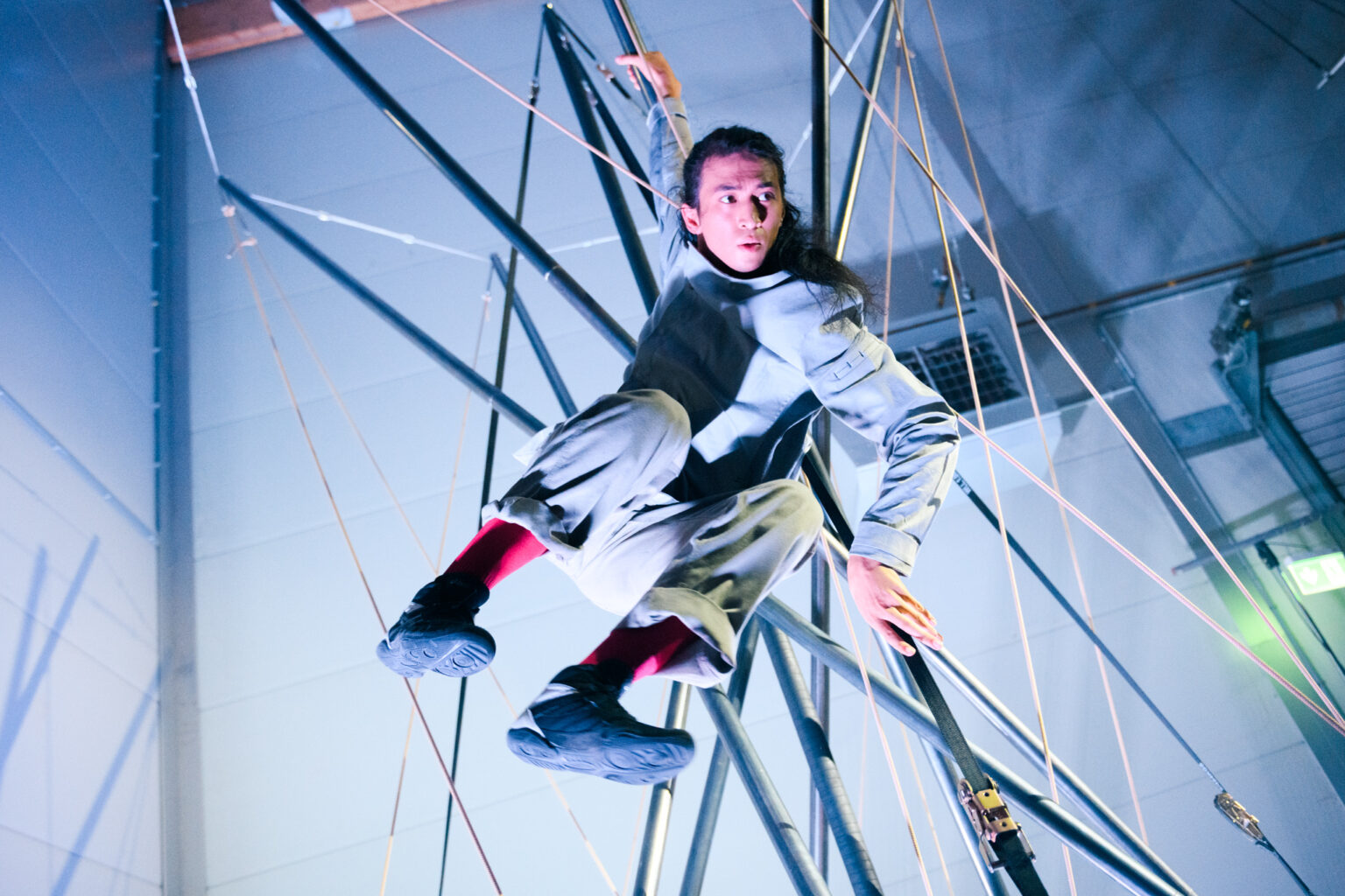 Een bloedhete zomerdag, juni 2023. De Tilburgse vierdejaars circusstudenten presenteren hun afstudeeracts in de tot theater omgebouwde circushal. Na de pauze gaan we niet direct terug naar onze plaatsen. We worden eerst naar een aparte hoek van de zaal geleid. Daar staat een opvallende vijf meter hoge constructie van palen en touwen.