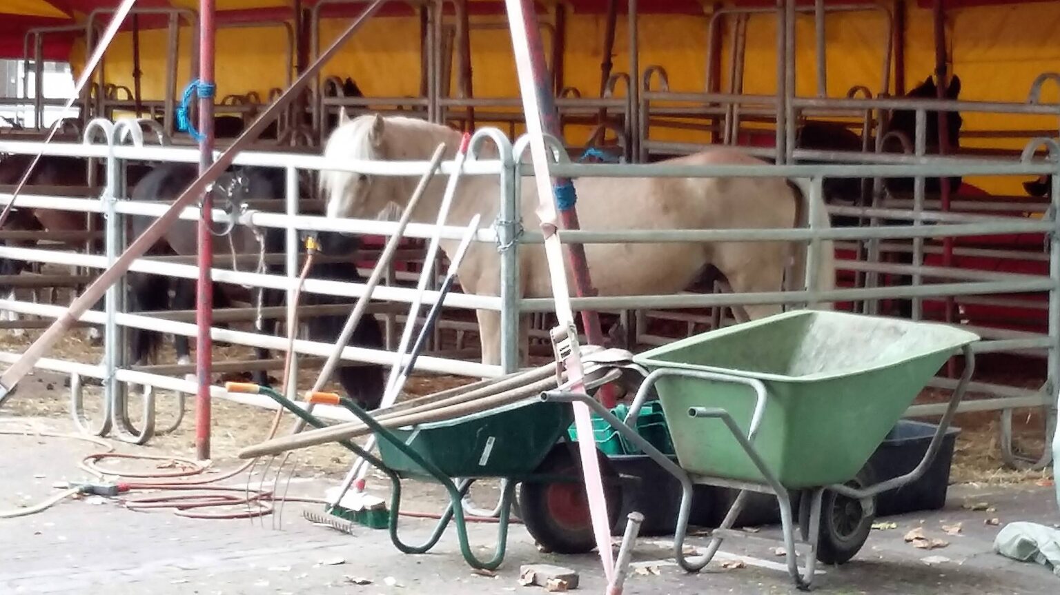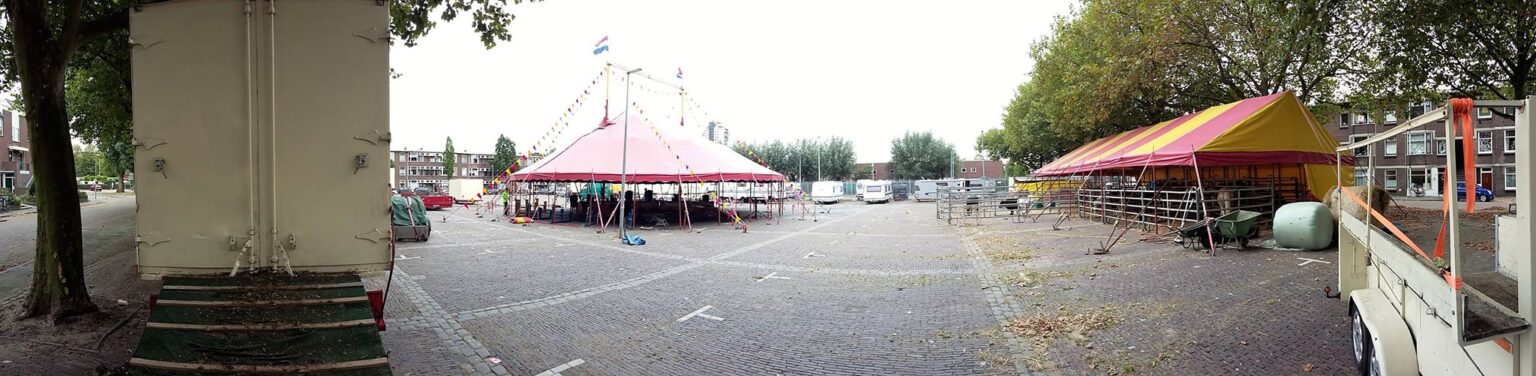 Een drietal opleggers, een vijftal woonwagens, de kassawagen en de staltenten zijn al gesteld… Vier mannen werkten vandaag aan de opbouw en inrichting van de kleine maar knusse en gezellig versierde circustent. De staven – om de tent te zekeren – worden met een moker in de grond geslagen… De vrouwen zorgen voor de dieren en het klaarmaken van de woonwagens. En… zij leren ook de allerkleinsten al vroeg de kneepjes uit het circusleven, zoals het meehelpen bij het opbouwen van de tent…