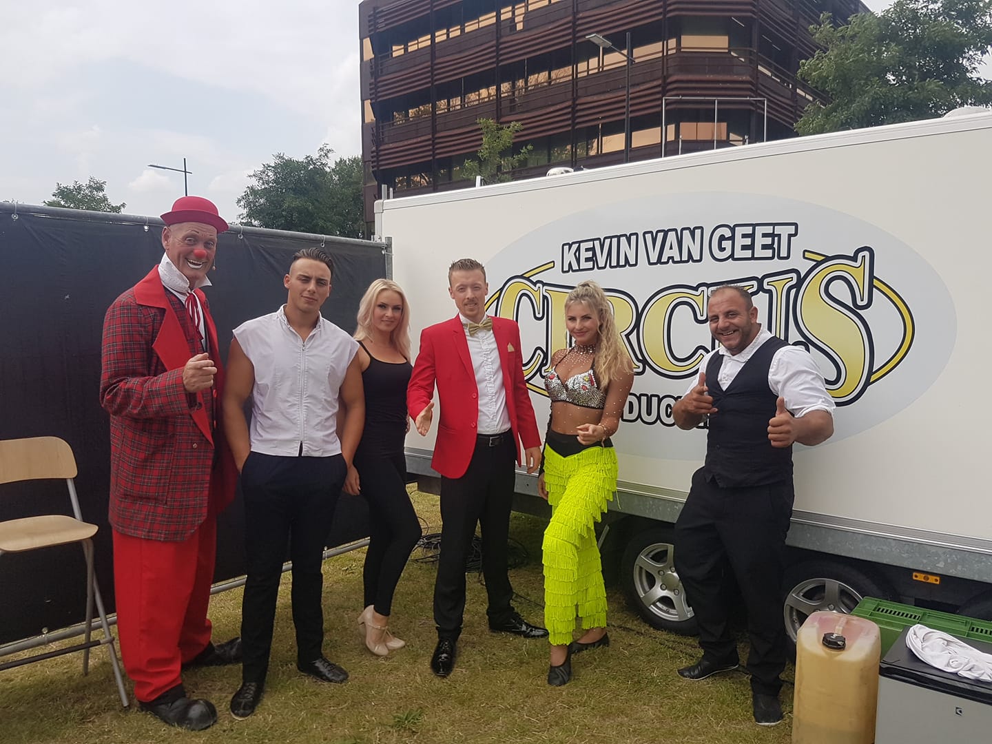 Het team van circus Carero met; Kevin van Geet Alfred en Rene Scholl, Clown Davey, Scarlett Renz en Jasmin Witter