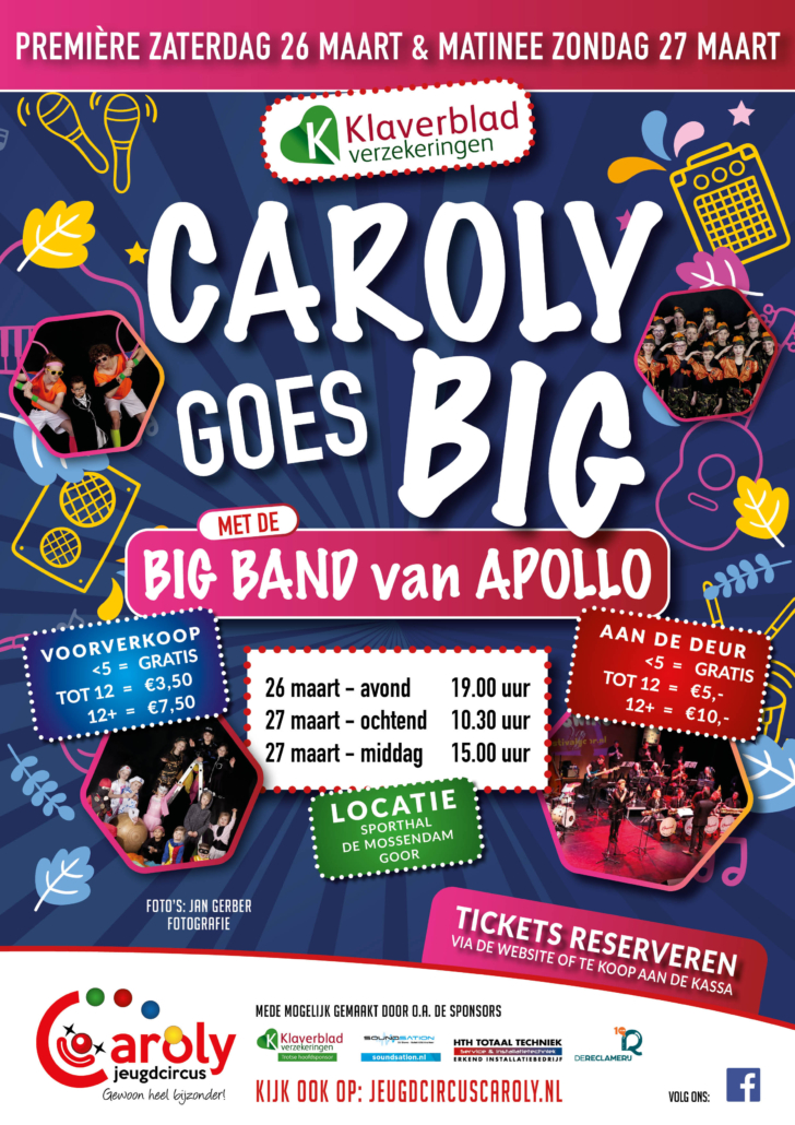 GOOR – Jeugdcircus Caroly treedt dit jaar tijdens haar jaarlijkse show in sporthal De Mossendam op met live muziek van The Apollo Bigband. Het 20 koppige orkest zal de jonge artiesten van het Goorse jeugdcircus bij hun nieuwste acts muzikaal begeleiden. Dit jaar verzorgt Caroly drie shows in de sporthal onder de titel ‘CAROLY goes BIG’.