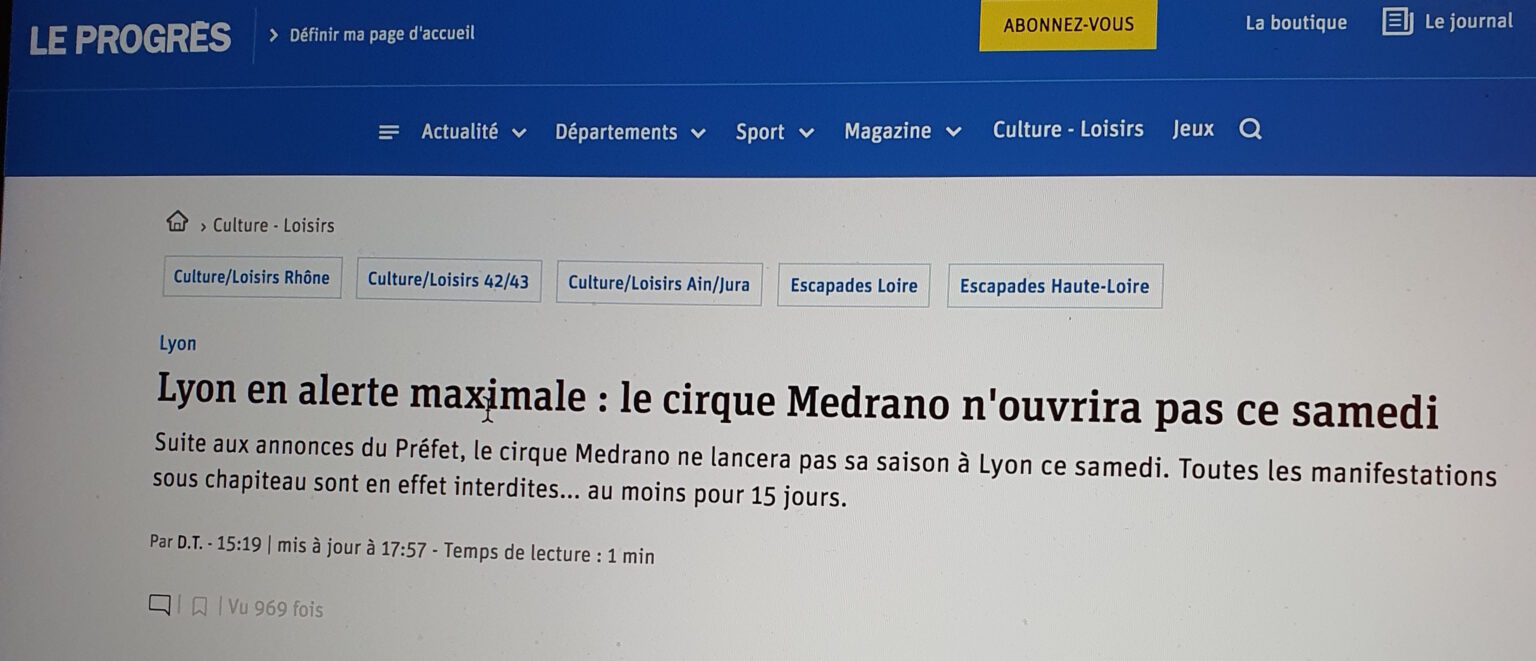 Following the Prefect’s announcements, the Medrano circus will not launch its season in Lyon this Saturday. All events under a marquee are indeed prohibited … at least for 15 days.