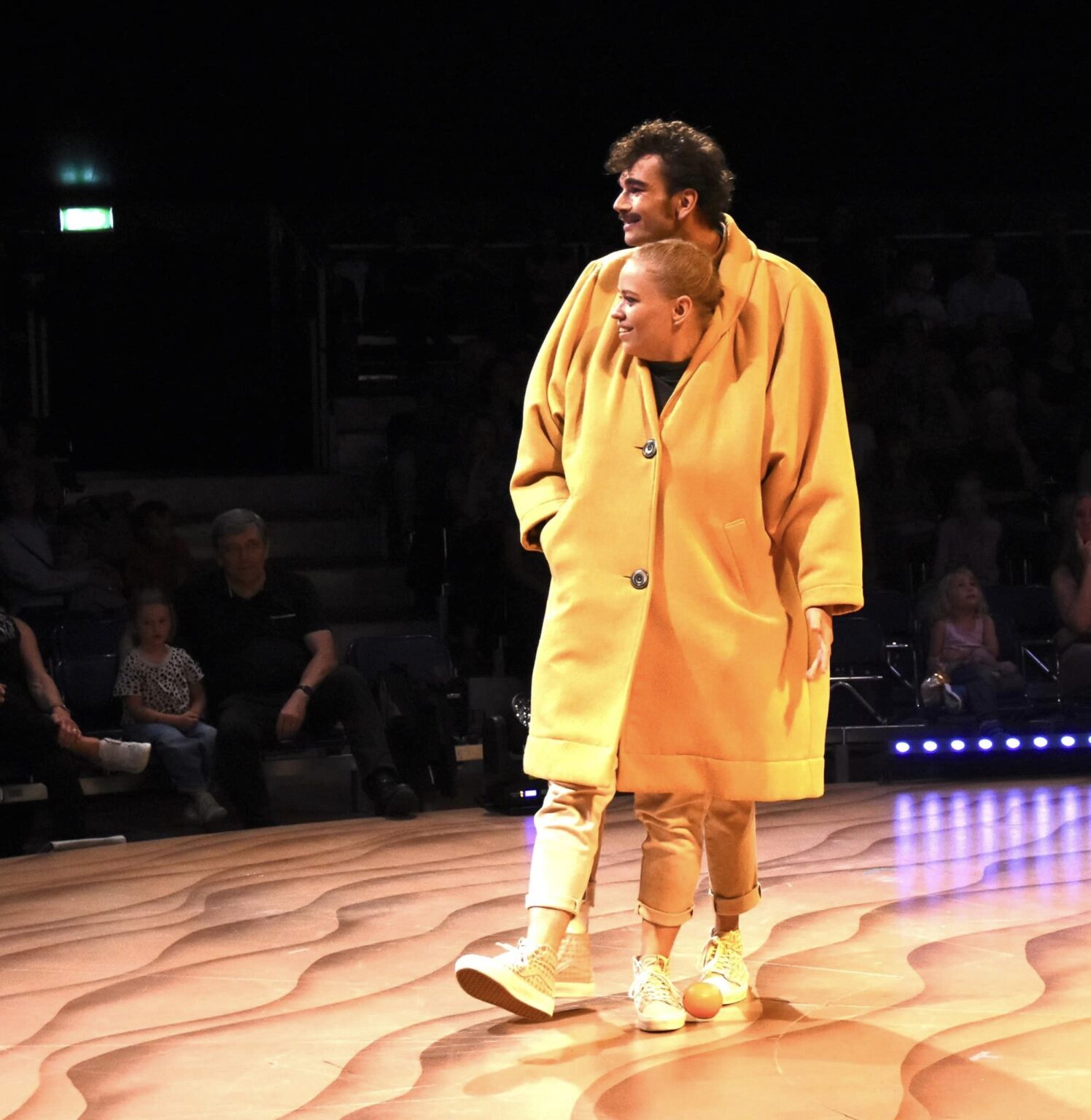 Een duo wat onafscheidelijk met elkaar verbonden is door een grote gele jas, geen schmink of grote schoenen maar erg sterk met mimiek, ze brengen verschillende originele reprise o.a.met diabolo’s en mandarijnen. Bijzondere handstanden, van top niveau is het duo trapeze werk en ook alles is tot in de details op elkaar afgestemd.