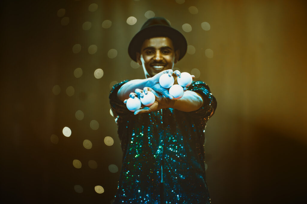 Een energieke jongleur die met razendsnel ritme en complexe patronen het publiek telkens opnieuw verrast. Jongleren zoals je het zelden ziet. - LED Juggling Group | LED-jongleercollectief