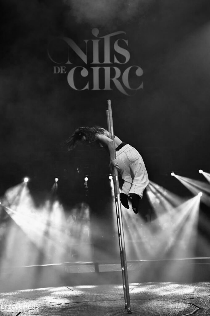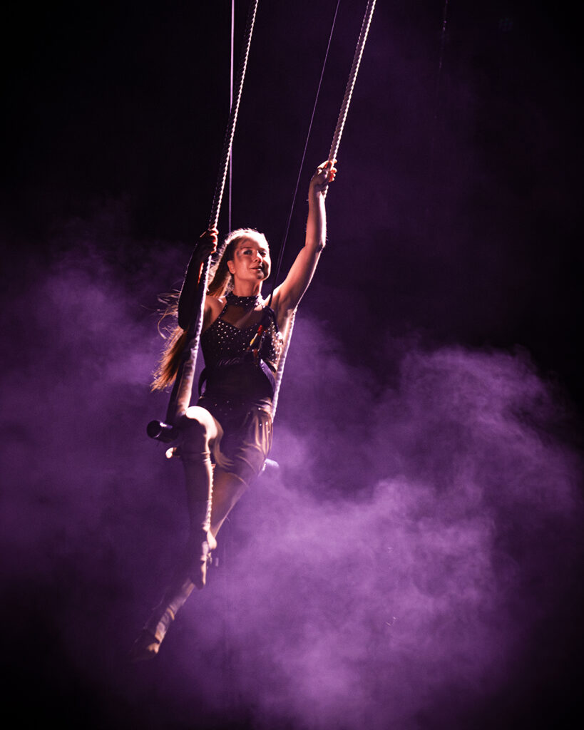Anna zweeft op elegante wijze door de tent aan het swinging trapeze en toont haar kracht en expressie op de aerial pole. Luchtacrobatiek op het hoogste niveau. - Angelo Chaves | Clownerie