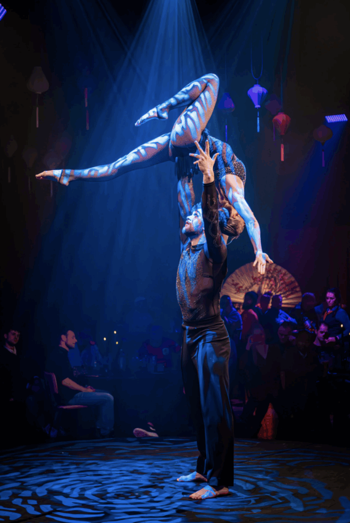 Het Hongaarse duo toont nog een meesterwerk: spectaculaire aerial tissu, vol vallen, vangmomenten en sierlijke bewegingen. Een ode aan kracht en totale overgave. - Low-Wire – Oswaldo Ramos