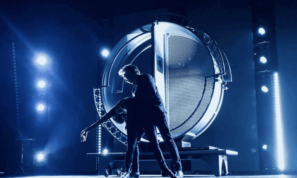 Dromerig, sierlijk en krachtig. Aan een schitterende kroonluchter toont Miss Raluka een luchtacrobatie-act waar je kippenvel van krijgt. - Laseract – The Green Laserman