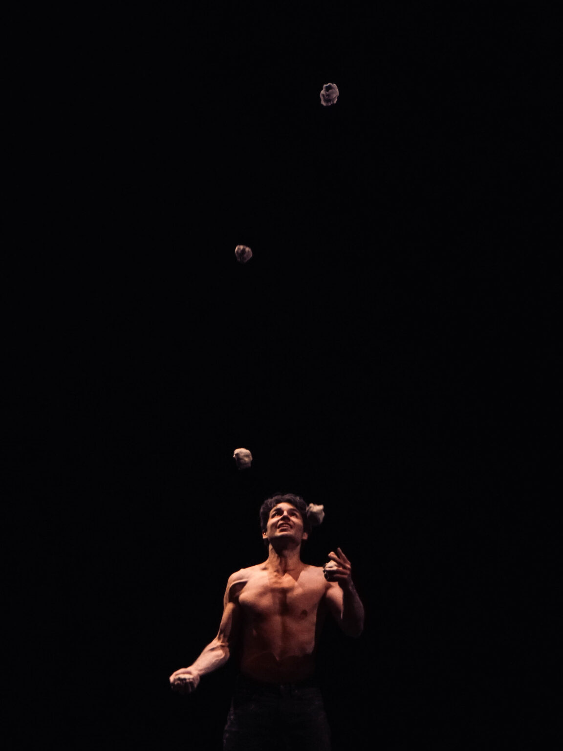 De absolute topper (tussen de andere toppers) van avond was Jimmy Gonzalez. De jongleur – in 2018 goed voor goud bij het Cirque de Demain – was te zien met zijn act ‘d’Argile’ (in het Frans: klei). Jimmy jongleerde in zijn act met klei. Een homp van dat materiaal werd verdeeld in kleinere porties en zo ontstonden zijn ‘jongleerballen’. En jongleren met klei in plaats van met ballen: daar zit qua gewicht nogal verschil in. Wat intens indrukwekkend was, was Gonzalez’ lichaam en de focus die hij gedurende de act daarop legde. Tijdens zijn uitvoering zag je als toeschouwer welke immense kracht Jimmy met zijn gespierde lichaam inzette voor zijn jongleerwerk. En dat was naast zijn gooiwerk eigenlijk al een act op zich.