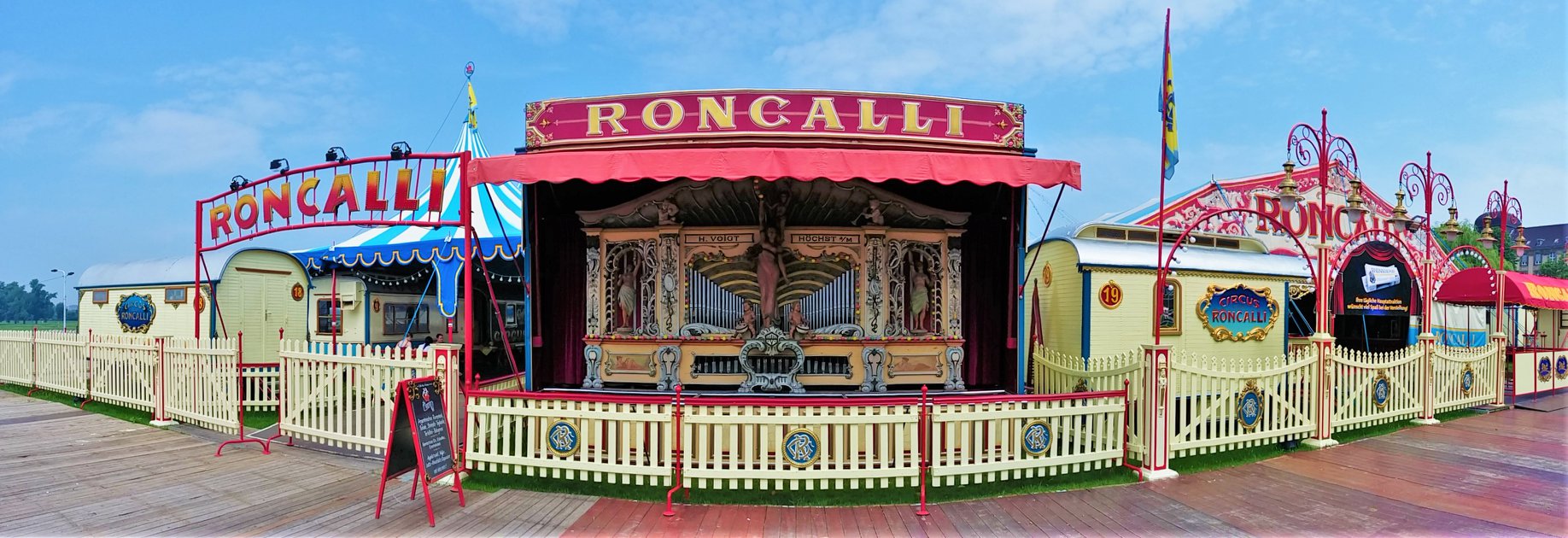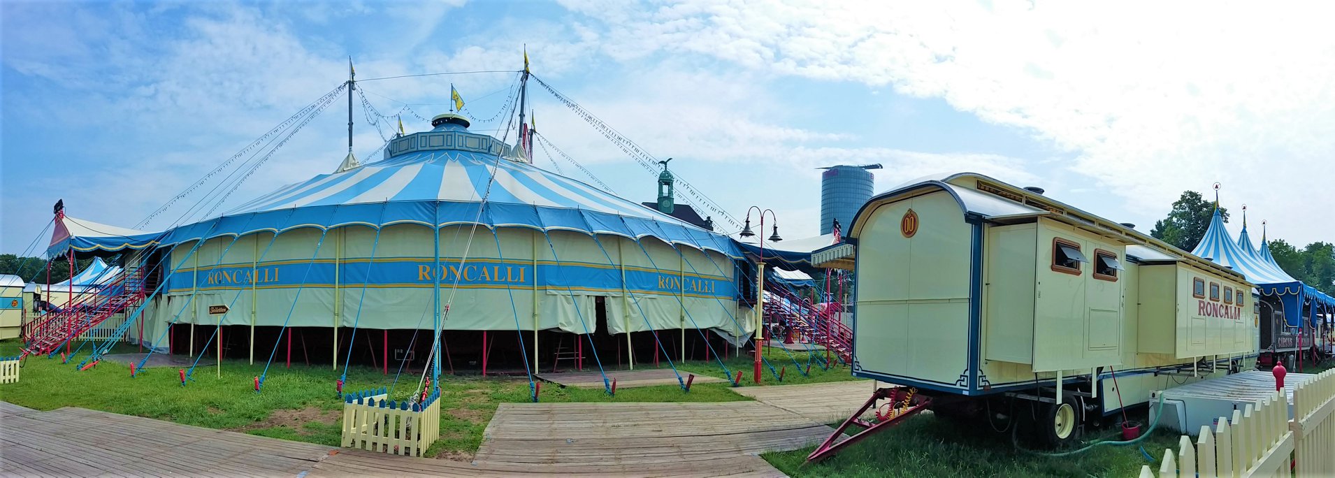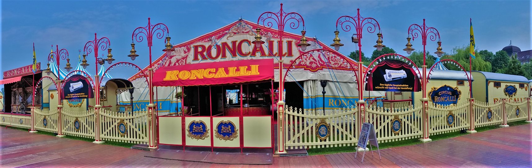 De circuswagens staan ter afscherming om het terrein heen opgesteld en is volledig afgezet met hekken. Aan de wagens valt op dat er tekst is toegevoegd aan het logo, namelijk ‘Theater’. Dit jaar besloot Circus Roncalli het circus te hernoemen naar ‘Circus Theater Roncalli’ en stopte men met het doen van kunsten door dieren en verdwenen dus ook de paarden uit de piste. Het eerste deel van het terrein – de voorzijde waar onder andere de wagens van het Persbureau, de Circuskassa, de hoofdingang, de Orgelwagen (Nr. 45), de ingang naar het ‘Café des Artistes’ en de toiletwagen zijn opgesteld – is  met hekken gescheiden van het achterste deel van het terrein waar de caravans en woonwagens van de artiesten en circusmedewerkers zijn opgesteld.