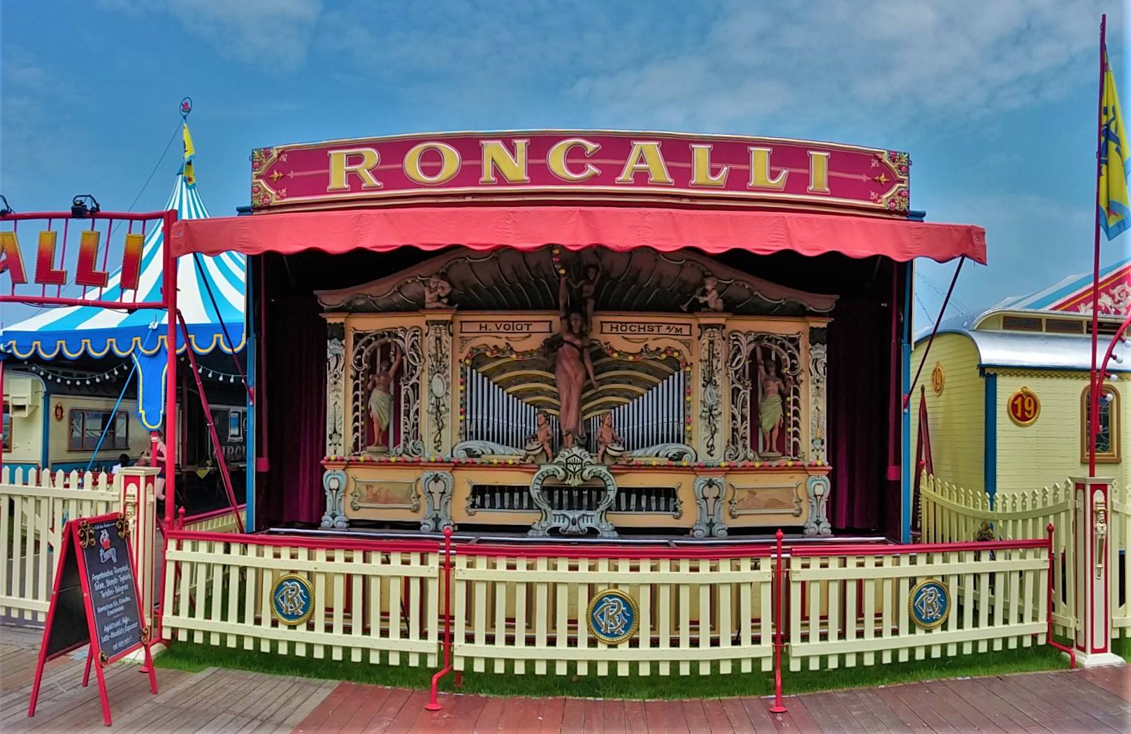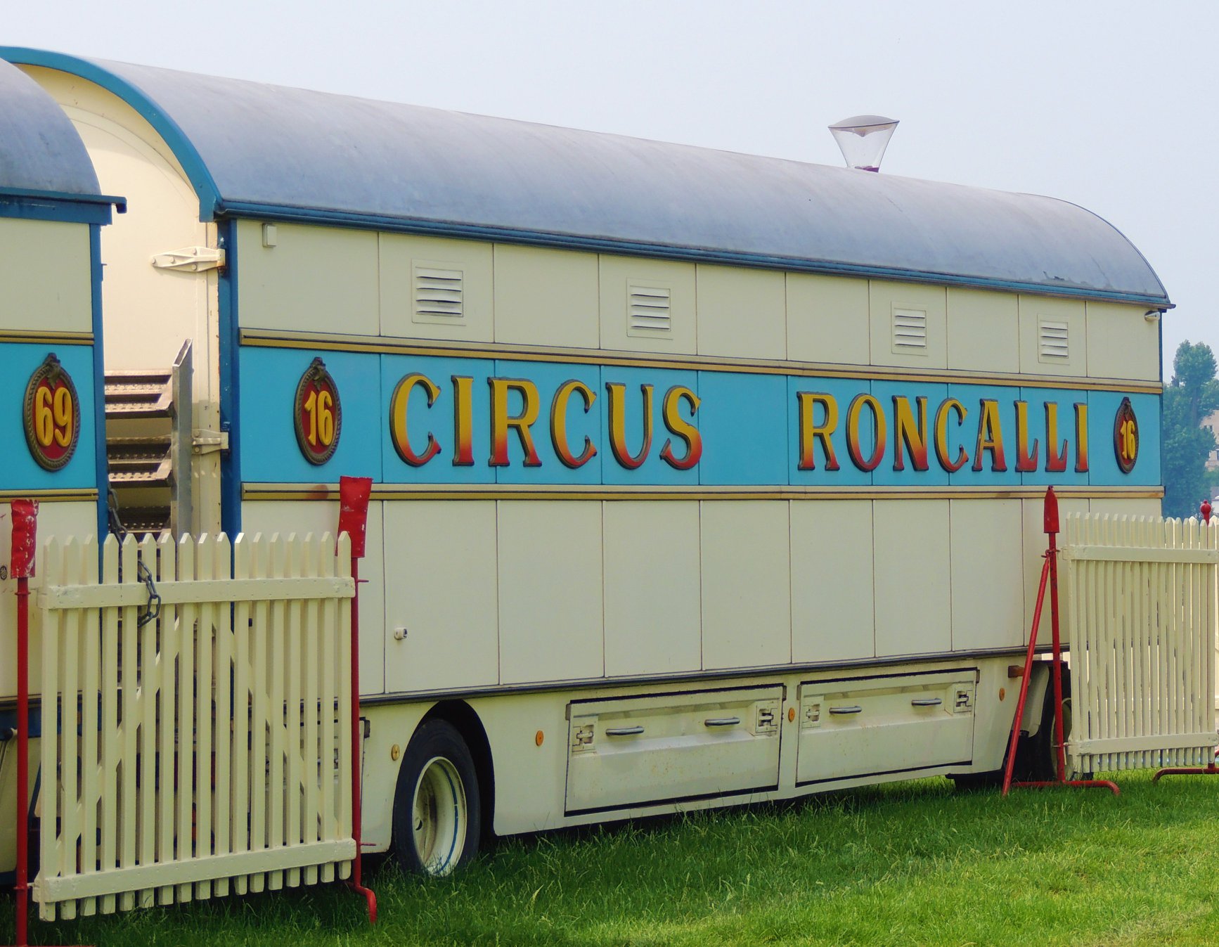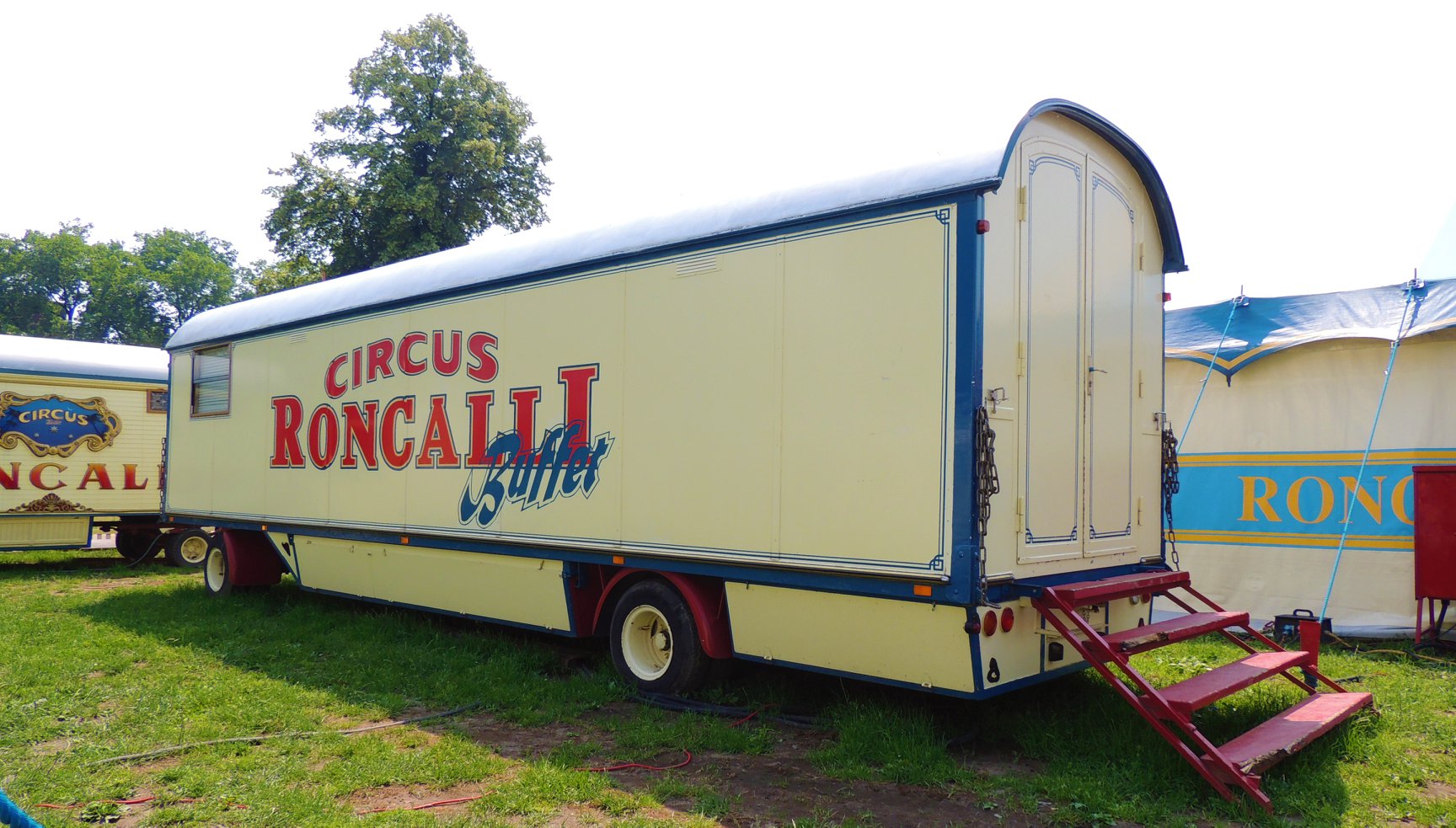 De circuswagens staan ter afscherming om het terrein heen opgesteld en is volledig afgezet met hekken. Aan de wagens valt op dat er tekst is toegevoegd aan het logo, namelijk ‘Theater’. Dit jaar besloot Circus Roncalli het circus te hernoemen naar ‘Circus Theater Roncalli’ en stopte men met het doen van kunsten door dieren en verdwenen dus ook de paarden uit de piste. Het eerste deel van het terrein – de voorzijde waar onder andere de wagens van het Persbureau, de Circuskassa, de hoofdingang, de Orgelwagen (Nr. 45), de ingang naar het ‘Café des Artistes’ en de toiletwagen zijn opgesteld – is  met hekken gescheiden van het achterste deel van het terrein waar de caravans en woonwagens van de artiesten en circusmedewerkers zijn opgesteld.