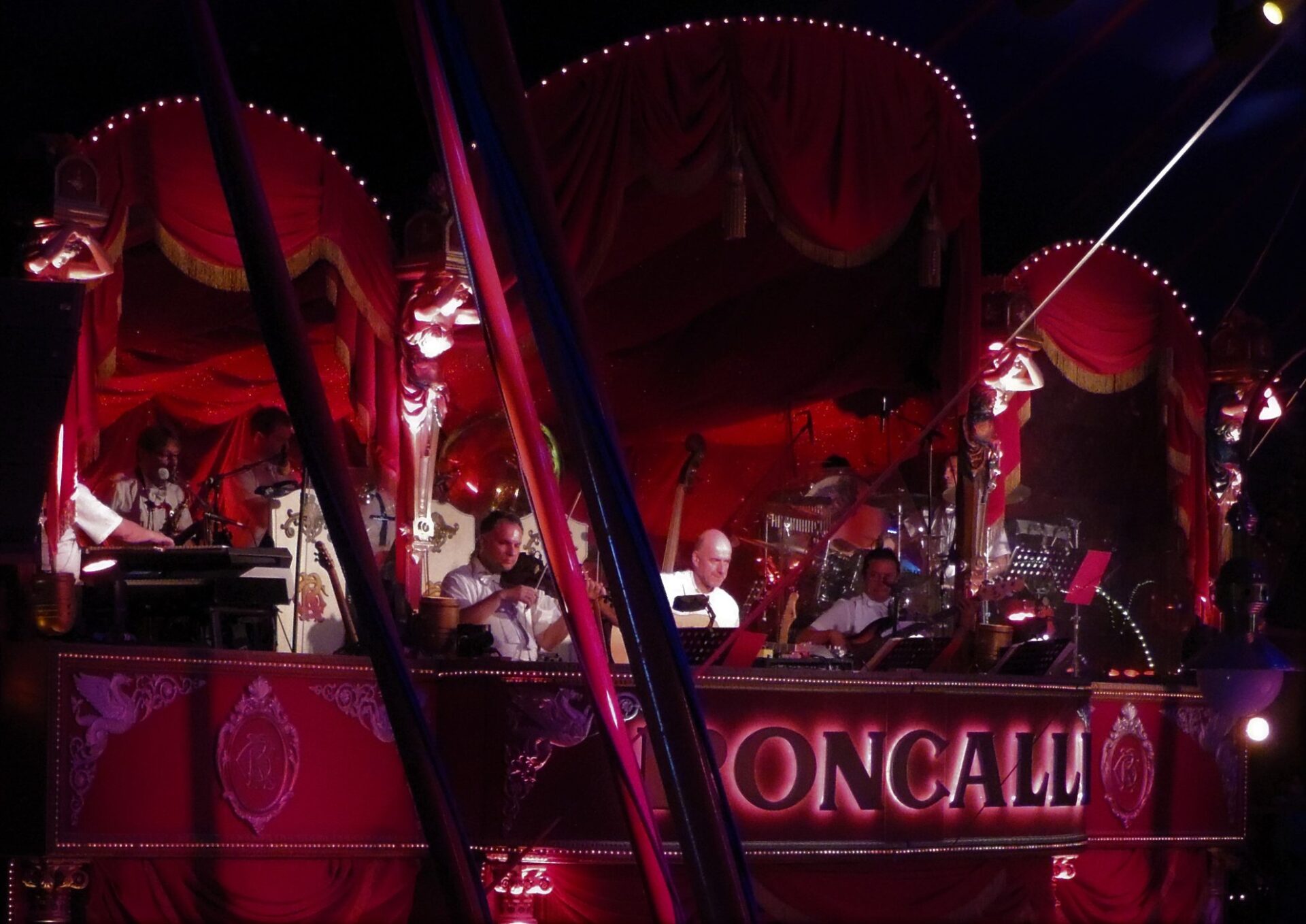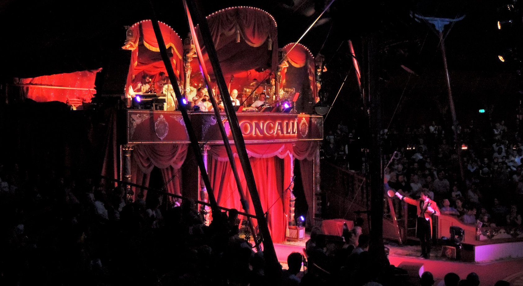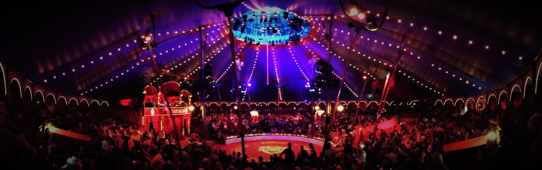 De circustent is sfeervol verlicht. Strengen lampjes leiden naar de koepel van de circustent waar een batterij aan ledverlichting is opgehangen. Boven de artiesteningang zit het 8-koppige circusorkest onder leiding van George Pommer al klaar, wat moet het daarboven warm zijn… Ik verheug me nu al op de live en met gevoel gespeelde circusmuziek.