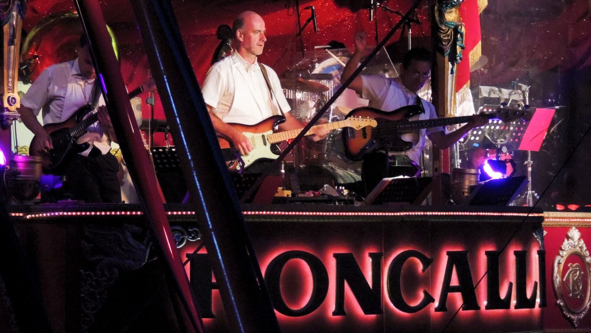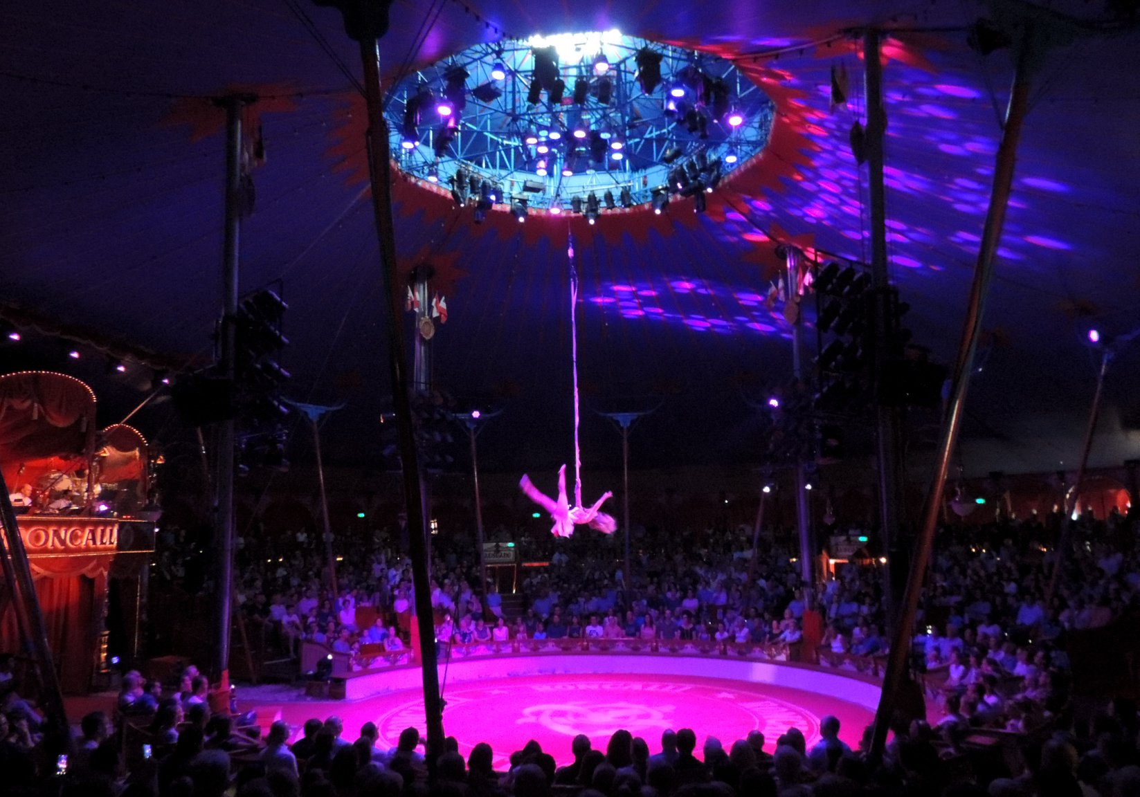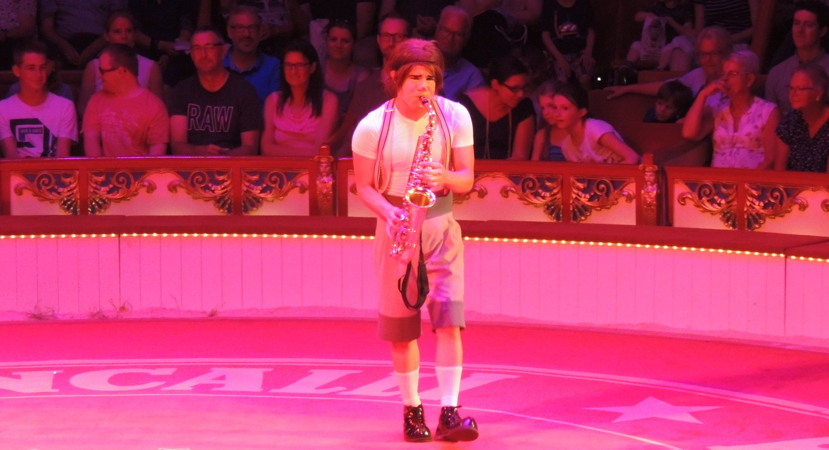 De circustent is sfeervol verlicht. Strengen lampjes leiden naar de koepel van de circustent waar een batterij aan ledverlichting is opgehangen. Boven de artiesteningang zit het 8-koppige circusorkest onder leiding van George Pommer al klaar, wat moet het daarboven warm zijn… Ik verheug me nu al op de live en met gevoel gespeelde circusmuziek.