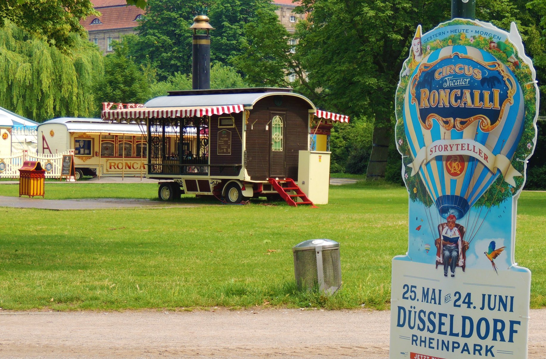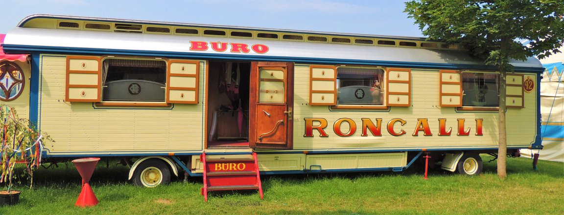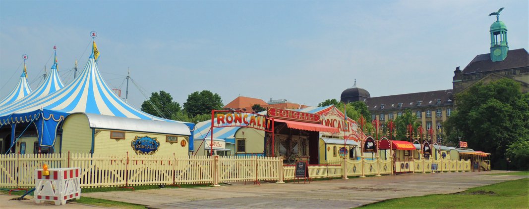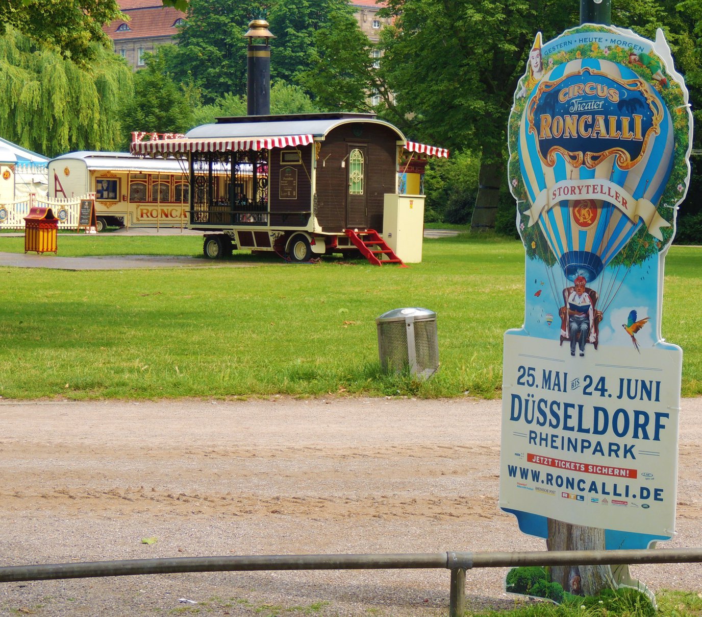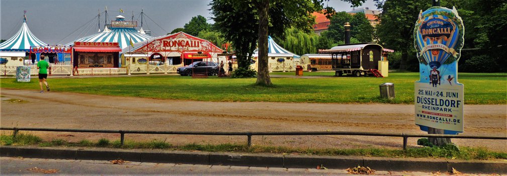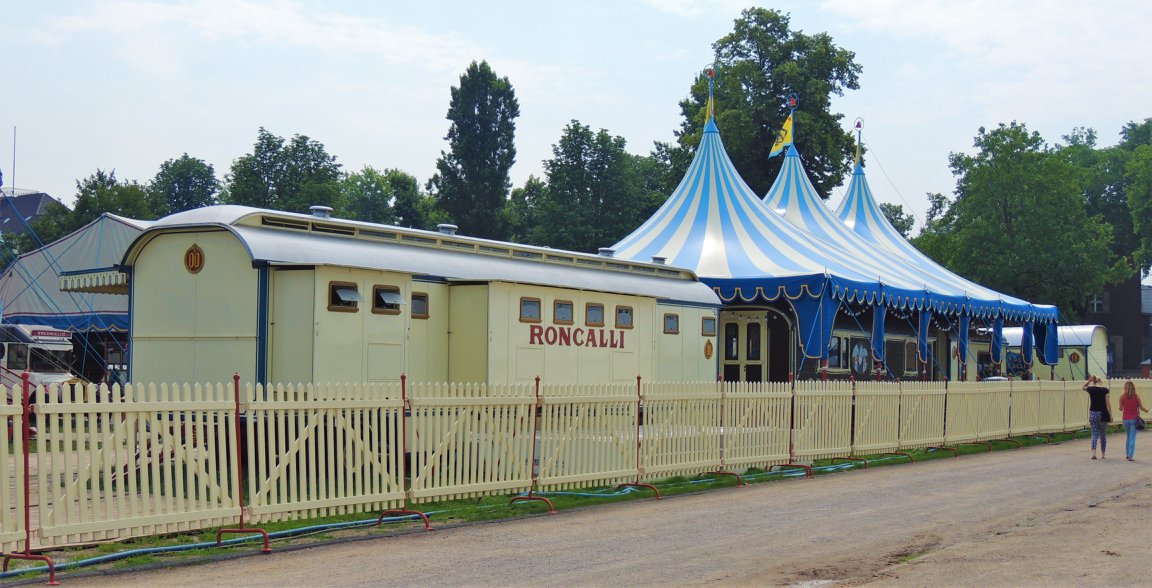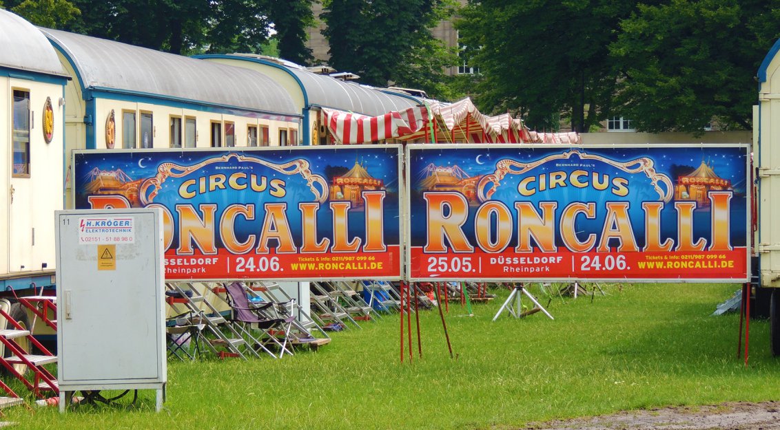 Düsseldorf, Duitsland – Onderweg doen de ballonvormige reclameborden vermoeden dat we in de buurt komen van het circus… Sierlijke circuswagens – van één van de laatste per trein reizende circussen in Europa – staat er aan de Robert-Lehr-Ufer in Düsseldorf: Bernhard Paul’s ‘Circus Theater Roncalli’ heeft van 25 mei t/m 24 juni de tenten opgeslagen.