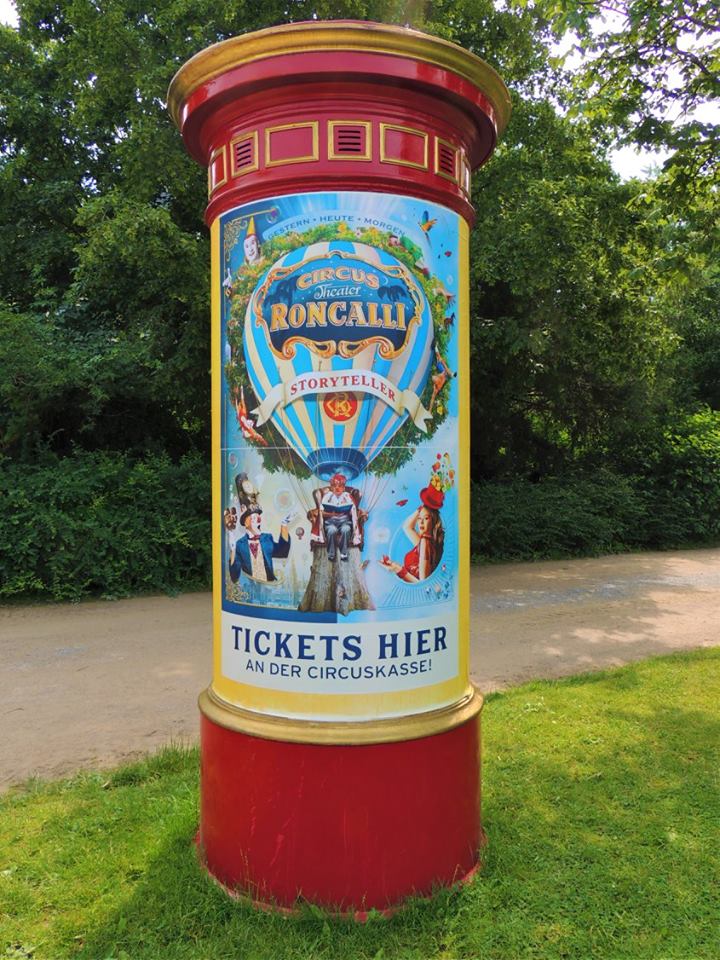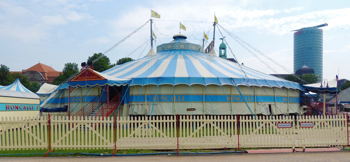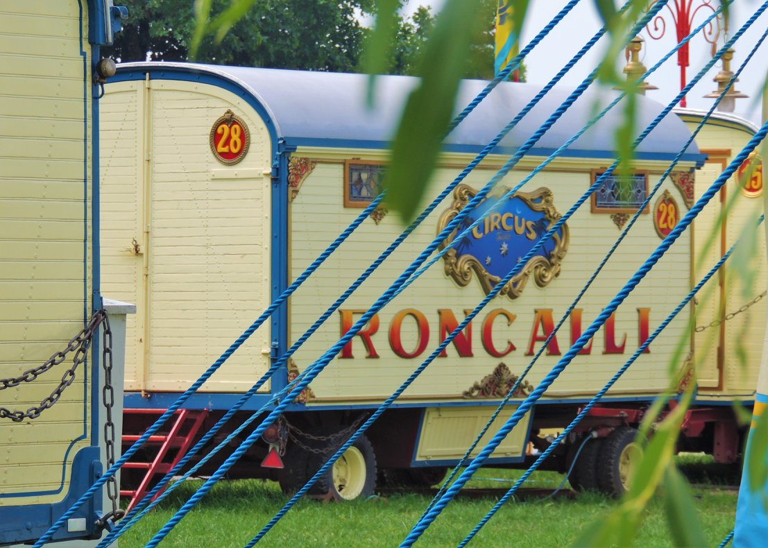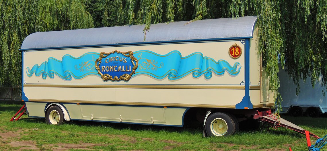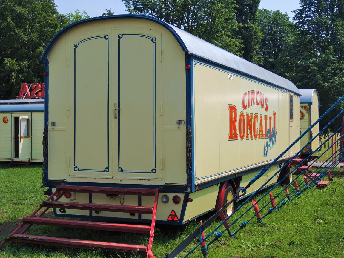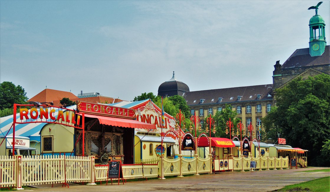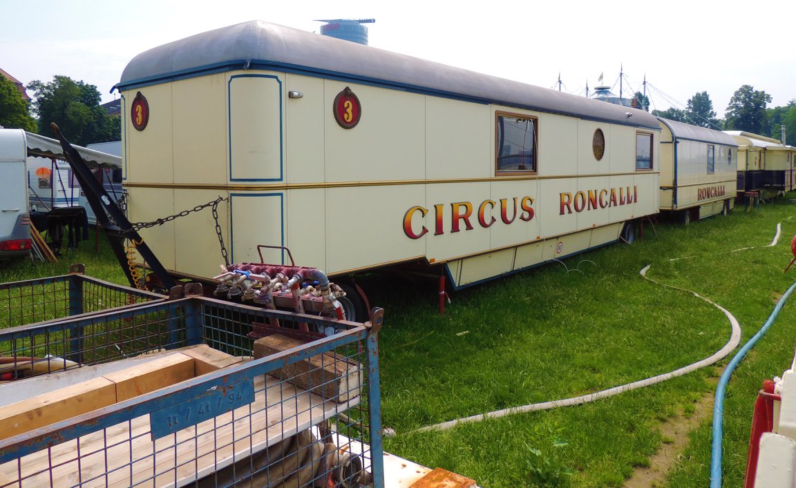 Düsseldorf, Duitsland – Onderweg doen de ballonvormige reclameborden vermoeden dat we in de buurt komen van het circus… Sierlijke circuswagens – van één van de laatste per trein reizende circussen in Europa – staat er aan de Robert-Lehr-Ufer in Düsseldorf: Bernhard Paul’s ‘Circus Theater Roncalli’ heeft van 25 mei t/m 24 juni de tenten opgeslagen.