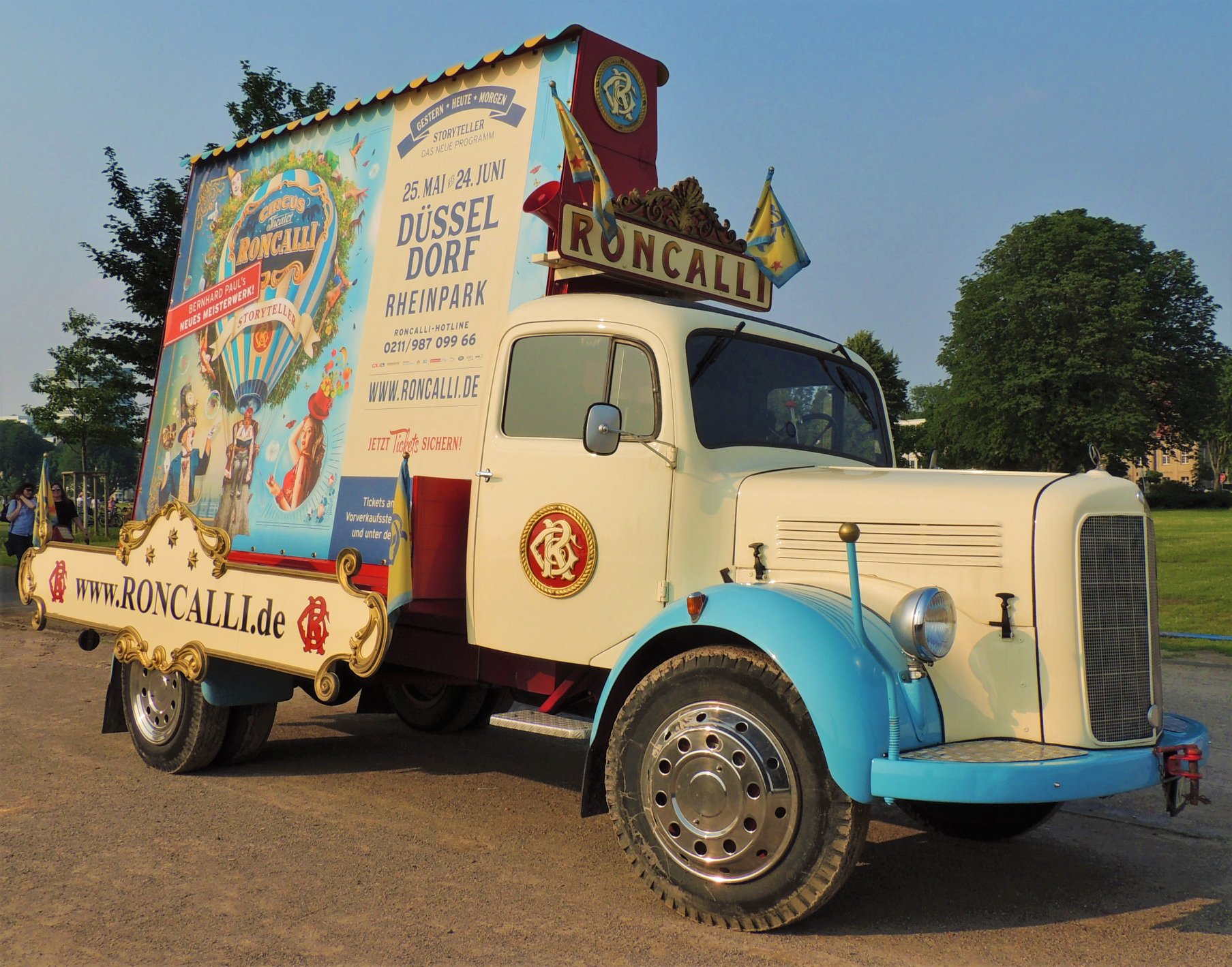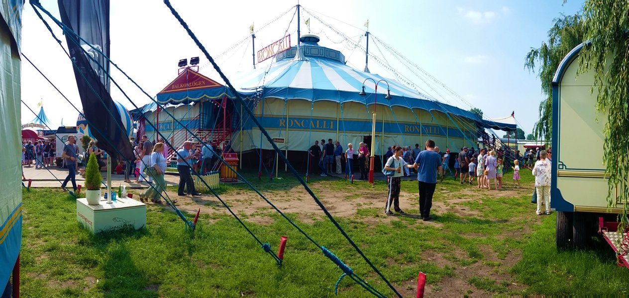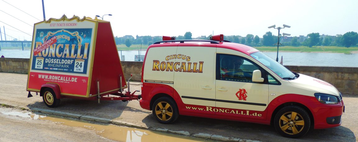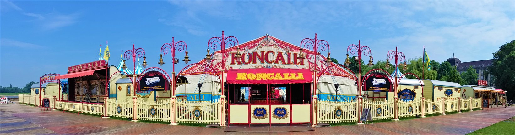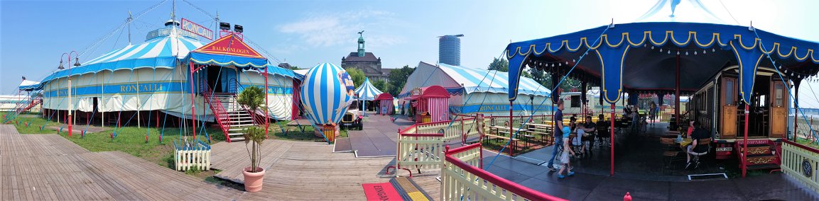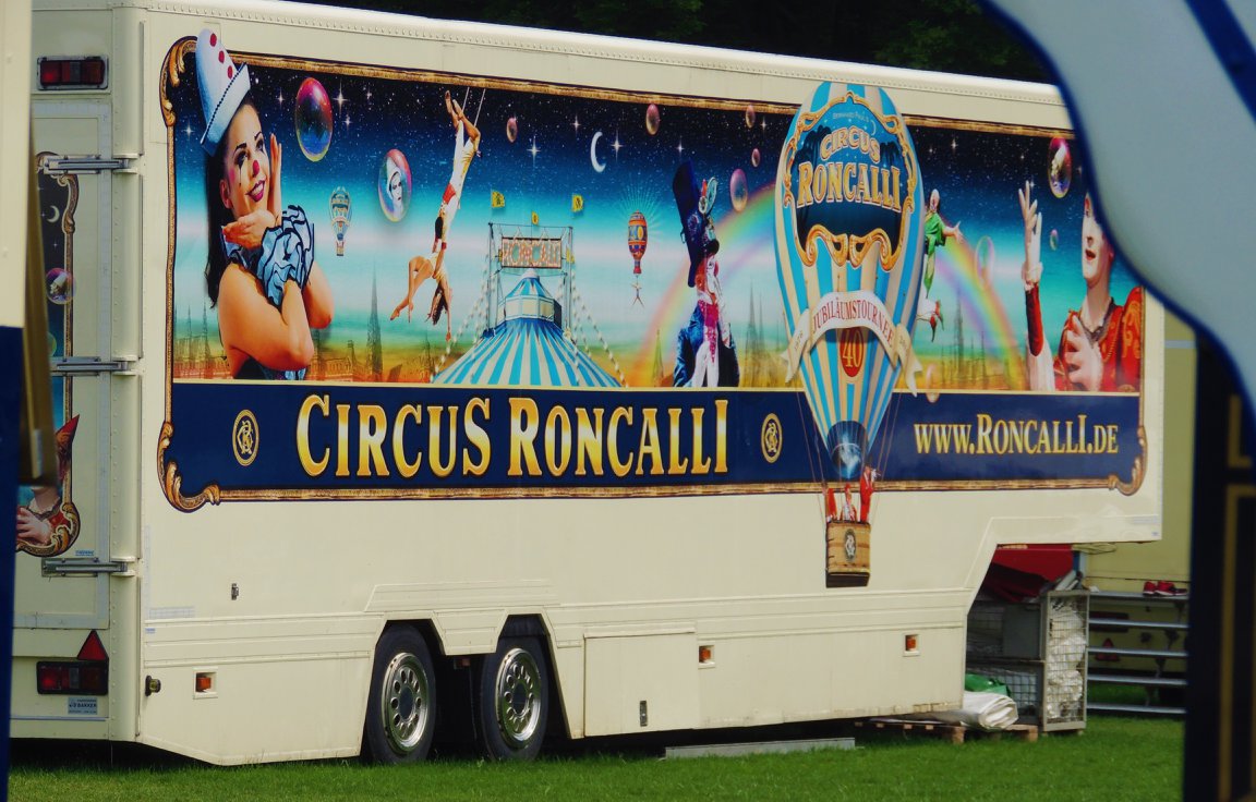Bij aankomst op de prachtige standplaats aan de rivier de ‘Rhein’, valt meteen op dat de circustrucks van Roncalli ditmaal ontbreken, waar ze zijn is onduidelijk: Eerder publiceerde Circusweb al een artikel met foto’s van Bastian Mertens dat bij hoge uitzondering het circustransport van de nostalgische circuswagens vanaf de standplaats Keulen naar de Robert-Lehr-Ufer in Düsseldorf – met behulp van de trucks van kermisondernemers – over de weg plaatsvond vanwege de beperkte afstand. Circus Theater Roncalli reist normaliter per trein door Europa.