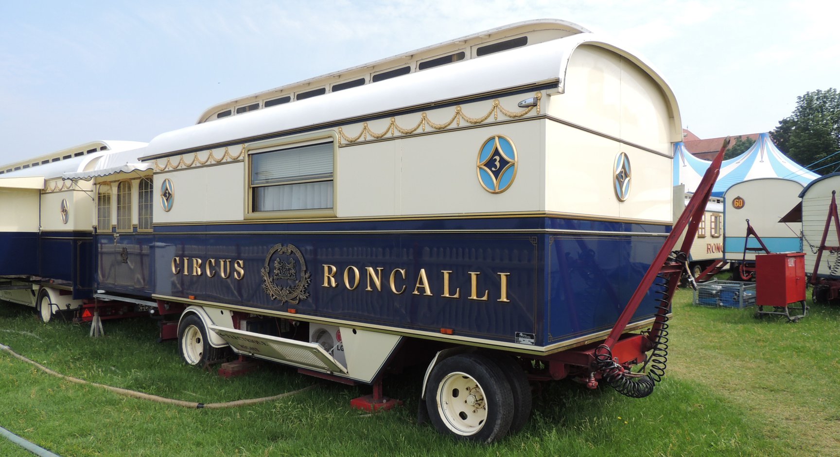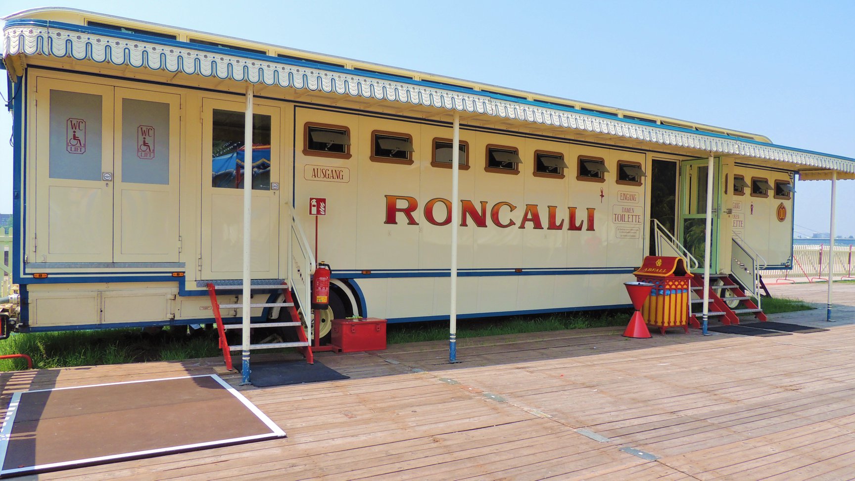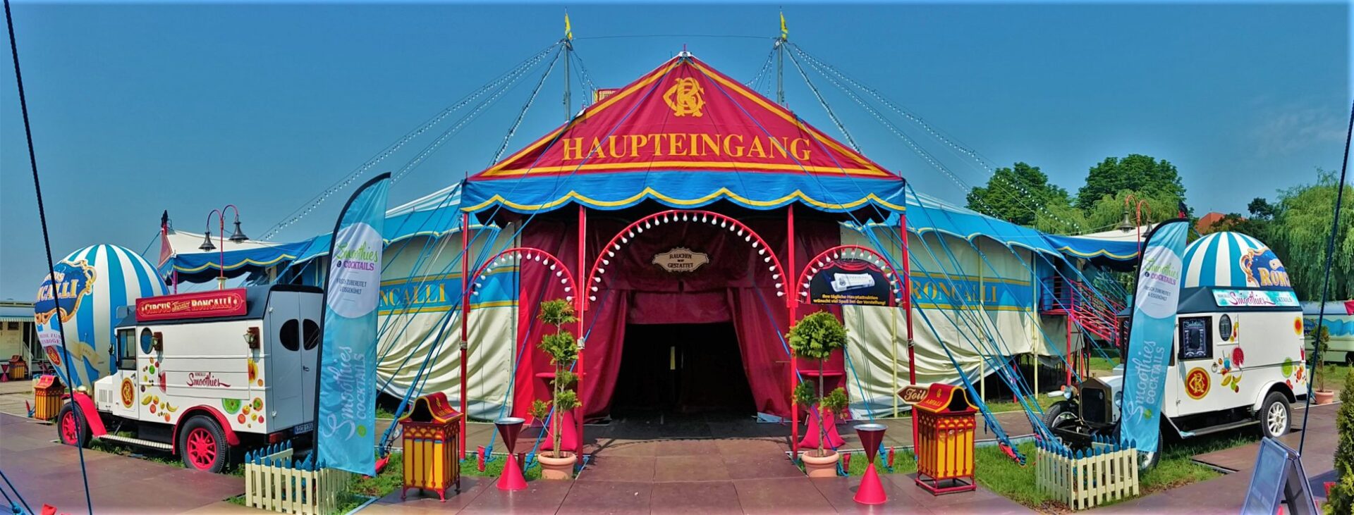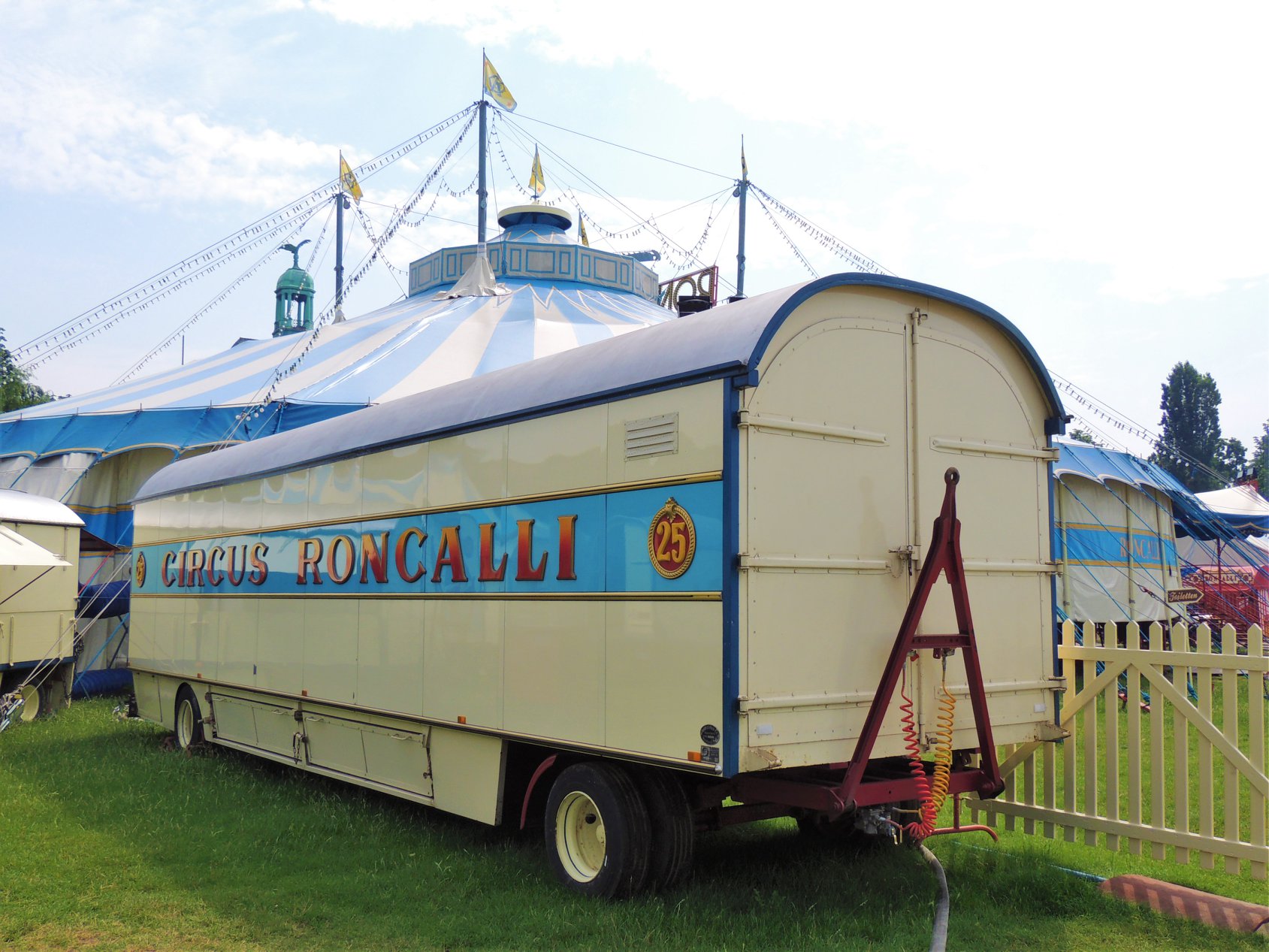 Bij aankomst op de prachtige standplaats aan de rivier de ‘Rhein’, valt meteen op dat de circustrucks van Roncalli ditmaal ontbreken, waar ze zijn is onduidelijk: Eerder publiceerde Circusweb al een artikel met foto’s van Bastian Mertens dat bij hoge uitzondering het circustransport van de nostalgische circuswagens vanaf de standplaats Keulen naar de Robert-Lehr-Ufer in Düsseldorf – met behulp van de trucks van kermisondernemers – over de weg plaatsvond vanwege de beperkte afstand. Circus Theater Roncalli reist normaliter per trein door Europa.