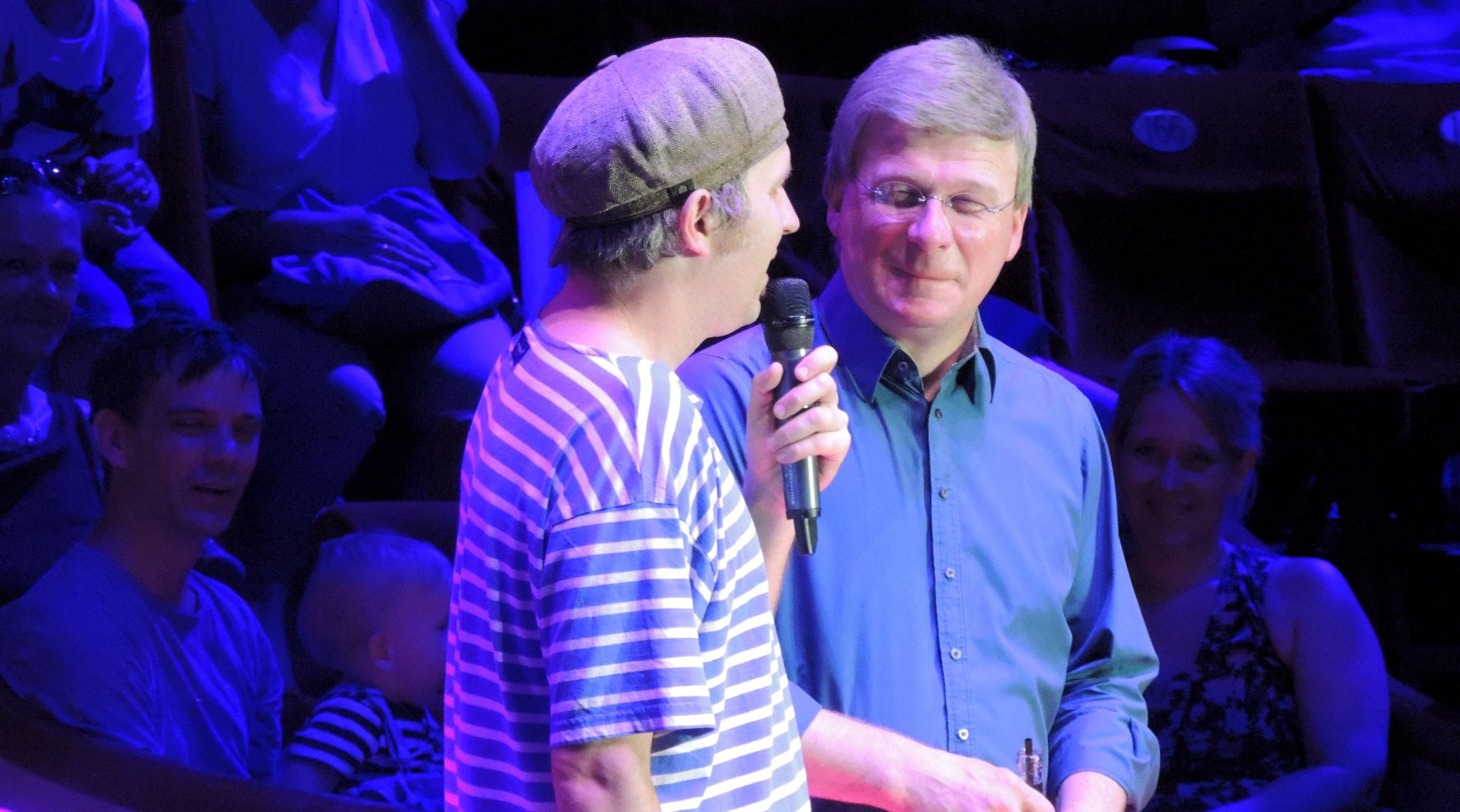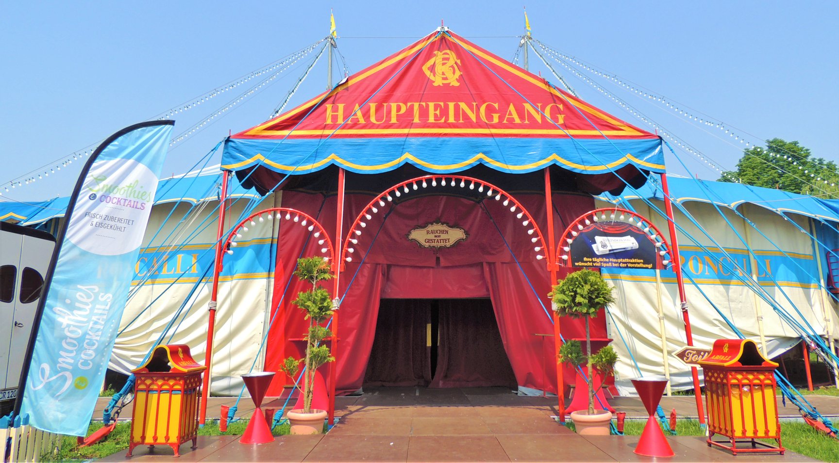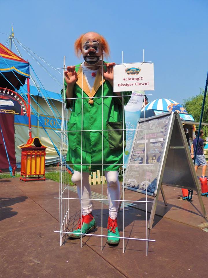 De rij voor de ingang van de circustent is al lang, het belooft een druk bezochte voorstelling te worden. Voor zover ik hoor en zie, zijn er deze keer niet zoveel Nederlanders naartoe gekomen. Dan slaat het pijporgel voor de ingang aan en stromen de bezoekers door de foyertent naar binnen. In de foyertent zijn versnaperingen zoals popcorn en limonade verkrijgbaar. Maar ook de speciaal door het speelgoedmerk Playmobil uitgebrachte Circus Roncalli auto’s en figuren zijn er te koop, naast de stickers, sleutelhangers, bekers, shirts, etc. Bij de oversteek van de foyertent naar de circustent komen we de clown Anatoli Akerman tegen.