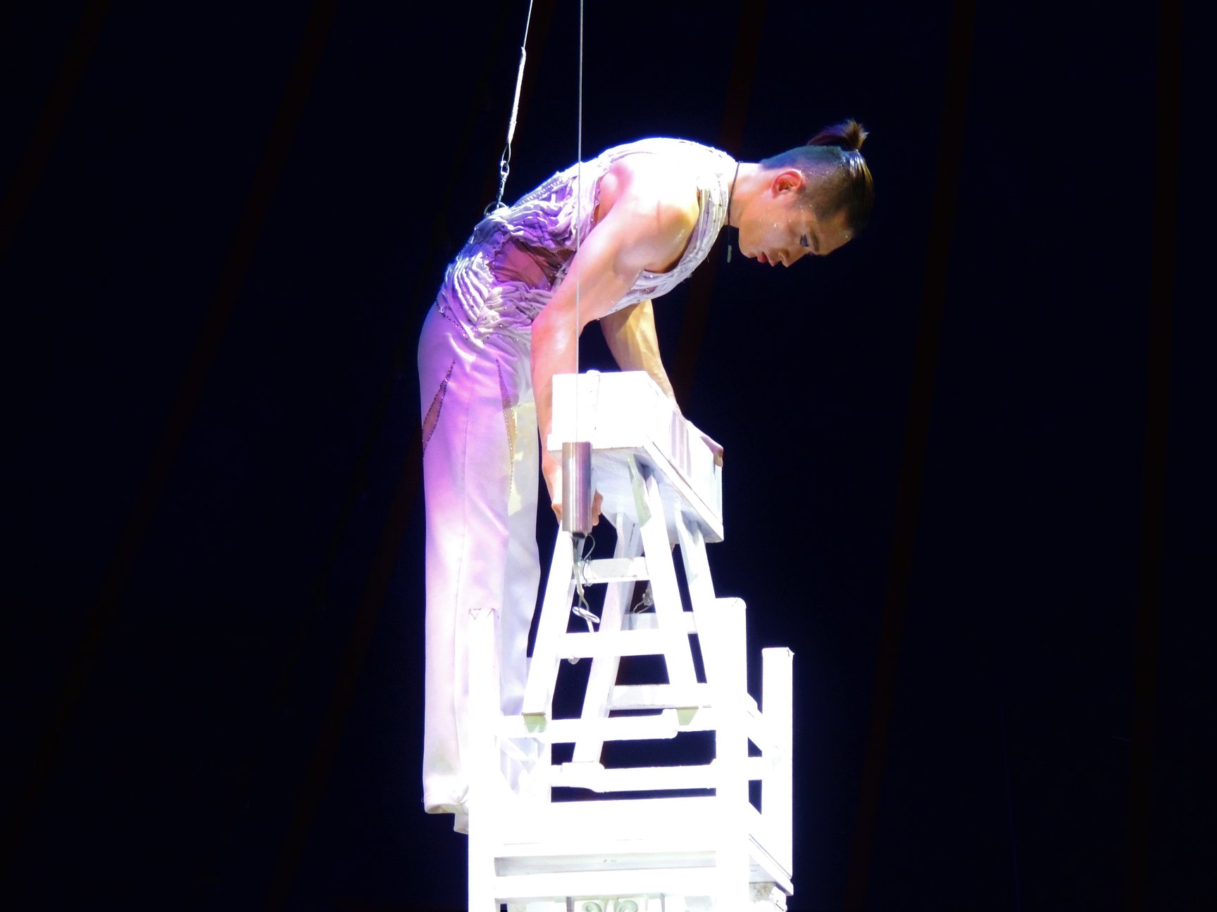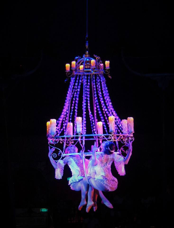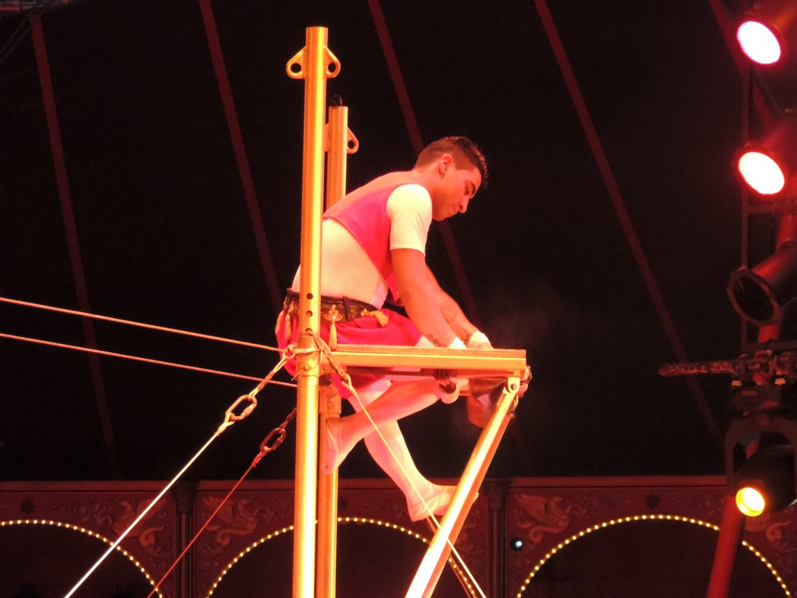 Een stellage verraadt dat de volgende act trapezewerk zal worden, uitgevoerd door The Flying Jalapenos en Chistirrin, die nog weleens misgrijpt en adembenemende, maar ook lachwekkende momenten oplevert. Het is duidelijk: deze act vraagt een goed vermogen en een goede beheersing van alles wat er in je lichaam zit. Bravo! Voor hen is een enorm applaus. En dan zijn voor even de olifanten terug in het circus! Onder leiding van Gensi en Anatoli Akerman komen Hamza Benini & Moustapha Niasse op hun olifanten het publiek vermaken. Wat mij betreft de allerbeste act kwam van Carillon, eigenlijk Paolo Casanova geheten en een ervaren auto en motorontwerper is die voor grote automerken prototypes bouwde. Met weinig rekwisieten, prachtige achtergrondmuziek en zijn beheerste mimiek, weet hij het publiek te beroeren. Circusdirecteur Bernhard Paul’s oudste dochter Vivian vormt samen met Natalia ‘The Queens of Baroque’. Onder een prachtige kroonluchter in de circuskoepel voeren zij allerlei lichaamskunsten uit, op de grond ondersteund door het Roncalli Ballet. De ballen worden in de lucht gehouden door Jemile Martinez, die goed kan jongleren. Clown Anatoli Akerman waakt over de veiligheid en weet een bezoeker te verleiden om een van de circusmasten overeind te houden als die dreigt om te vallen. Geholpen door Clown Eddy Neuman, tapen ze de arme bezoeker vast aan de circusmast als deze niet erg wil meewerken om de voorstelling overeind te houden.