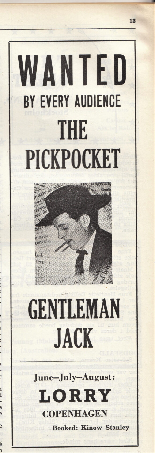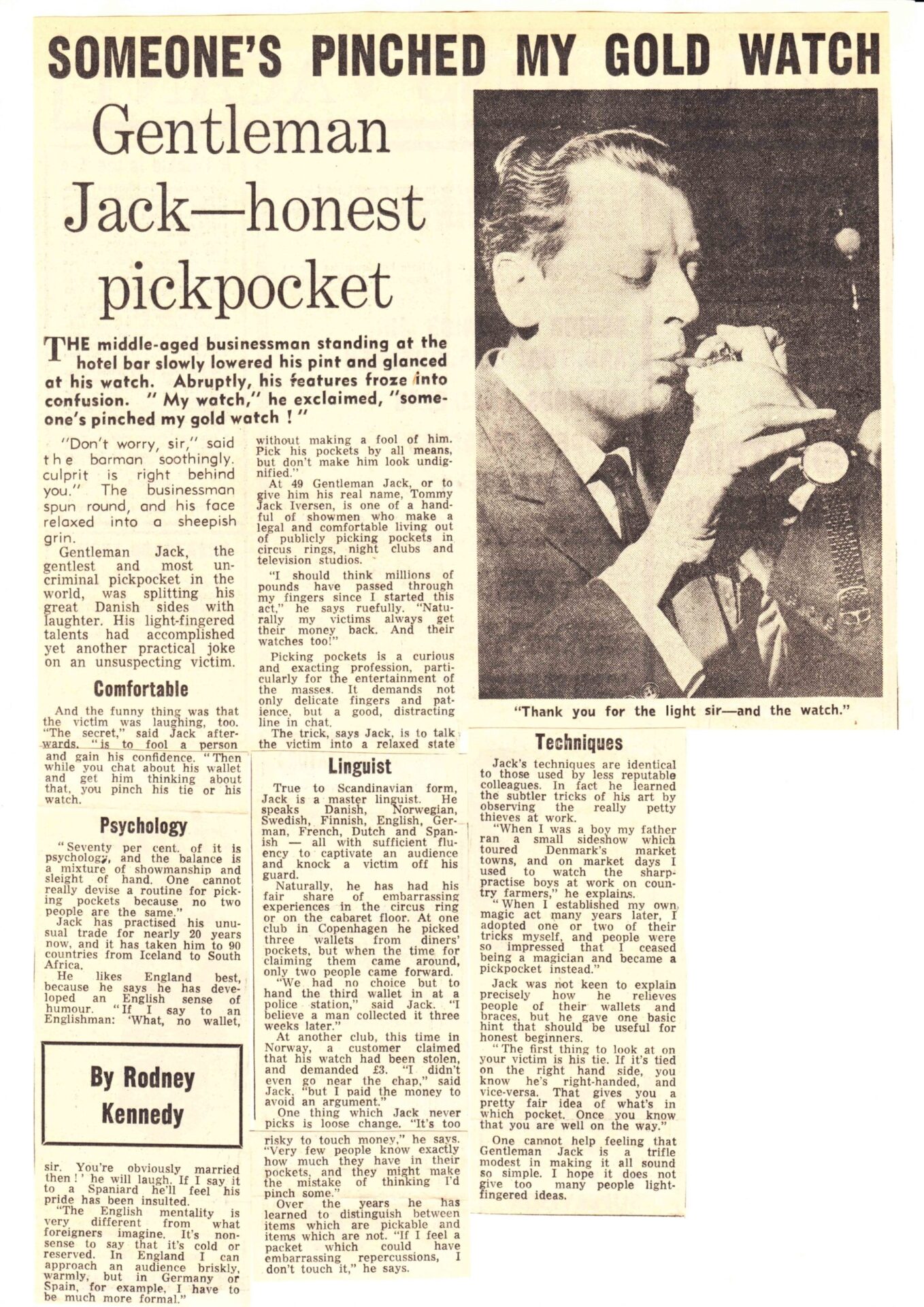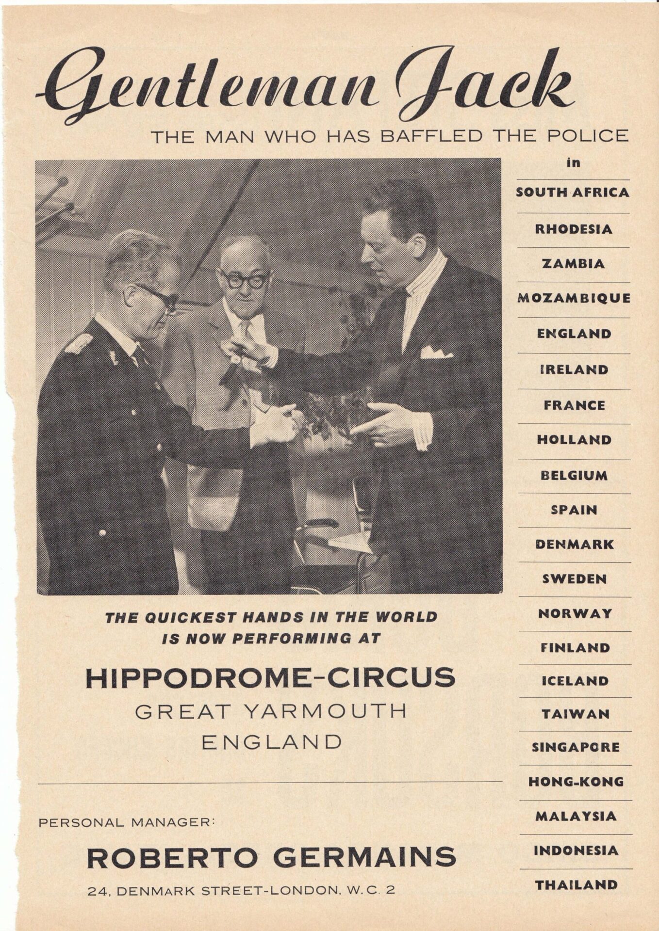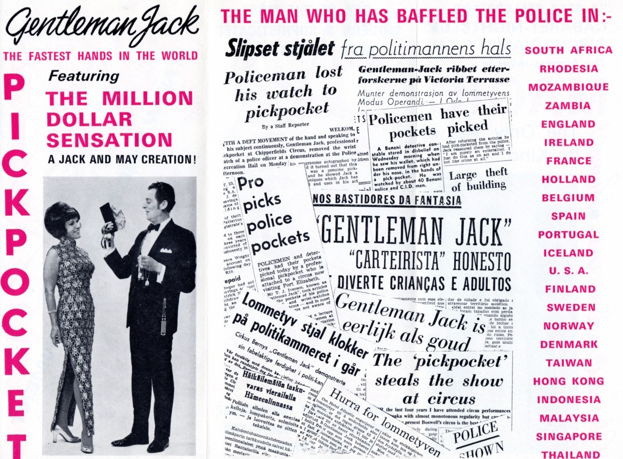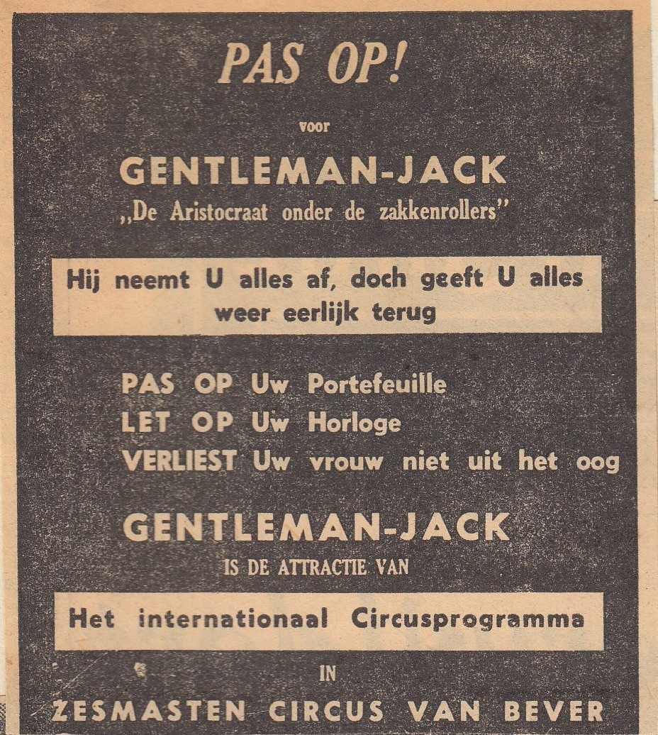 De in Denemarken geboren Gentleman Jack noemde zichzelf “The Aristocraat van het zakkenrollen” of “Gentleman Jack – De snelste handen ter wereld”. Hij kon toeschouwers manipuleren en sprak acht verschillende talen en reisde, samen met zijn vrouw Maj-lis, naar meer dan twintig verschillende landen op alle vijf de continenten, waar hij overal publiciteit kreeg met zijn elegante en gladde ‘Pick pocket’ Act. En hij verscheen in veel van de Scandinavische en Europese grote circussen en variététheaters van zijn tijd. Gentleman Jack was in Nederland te zien bij Circus van Bever in 1956.