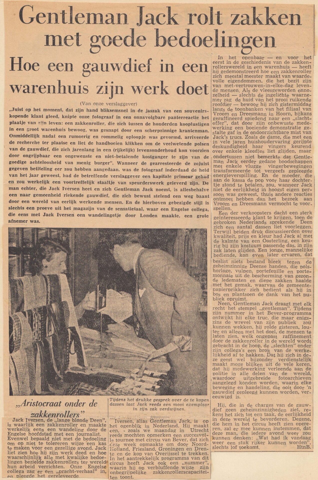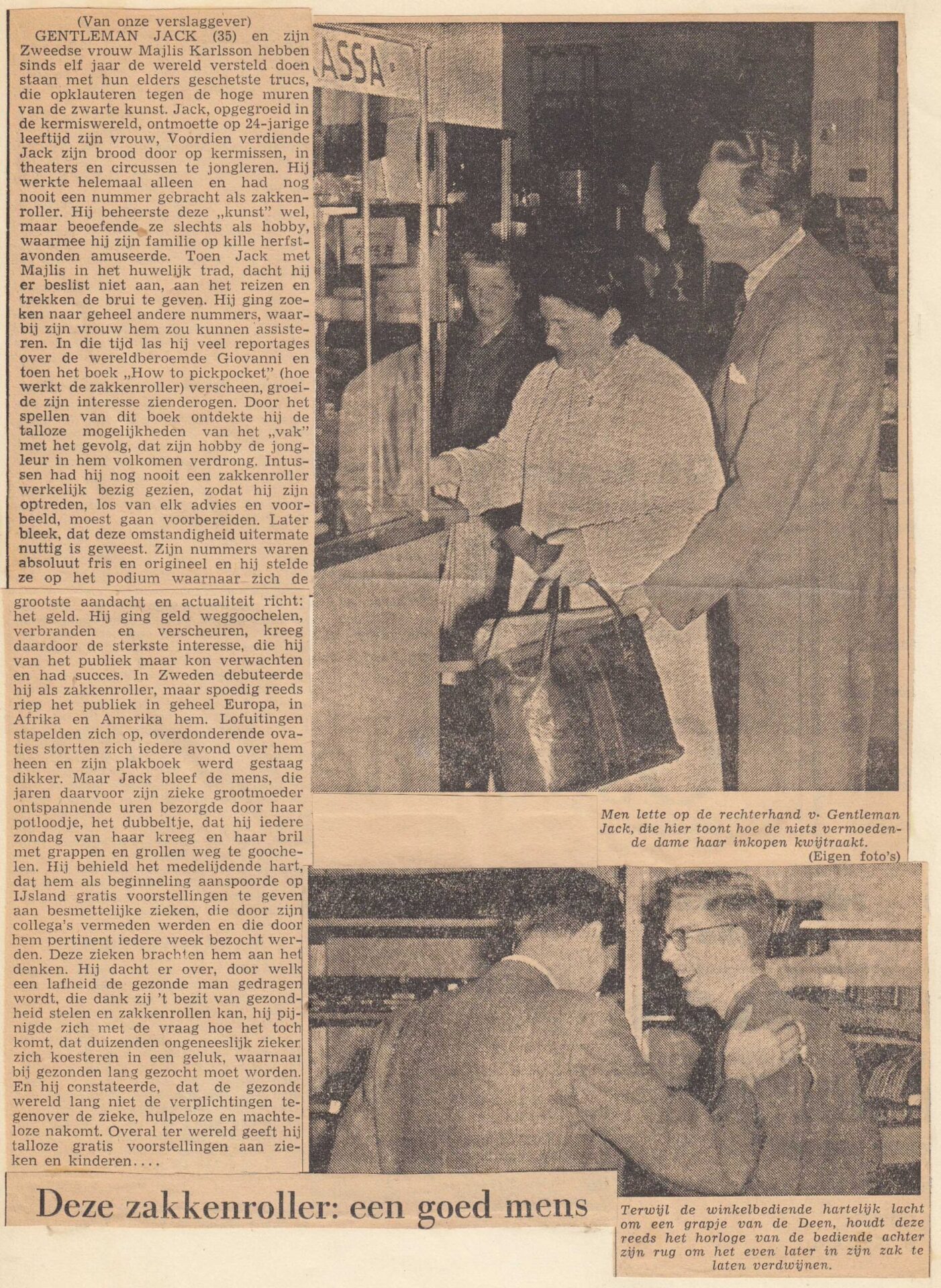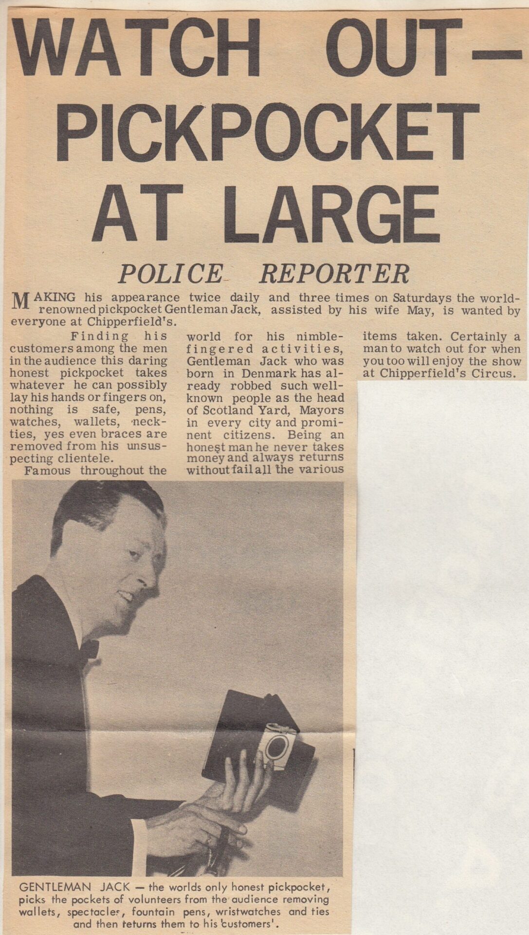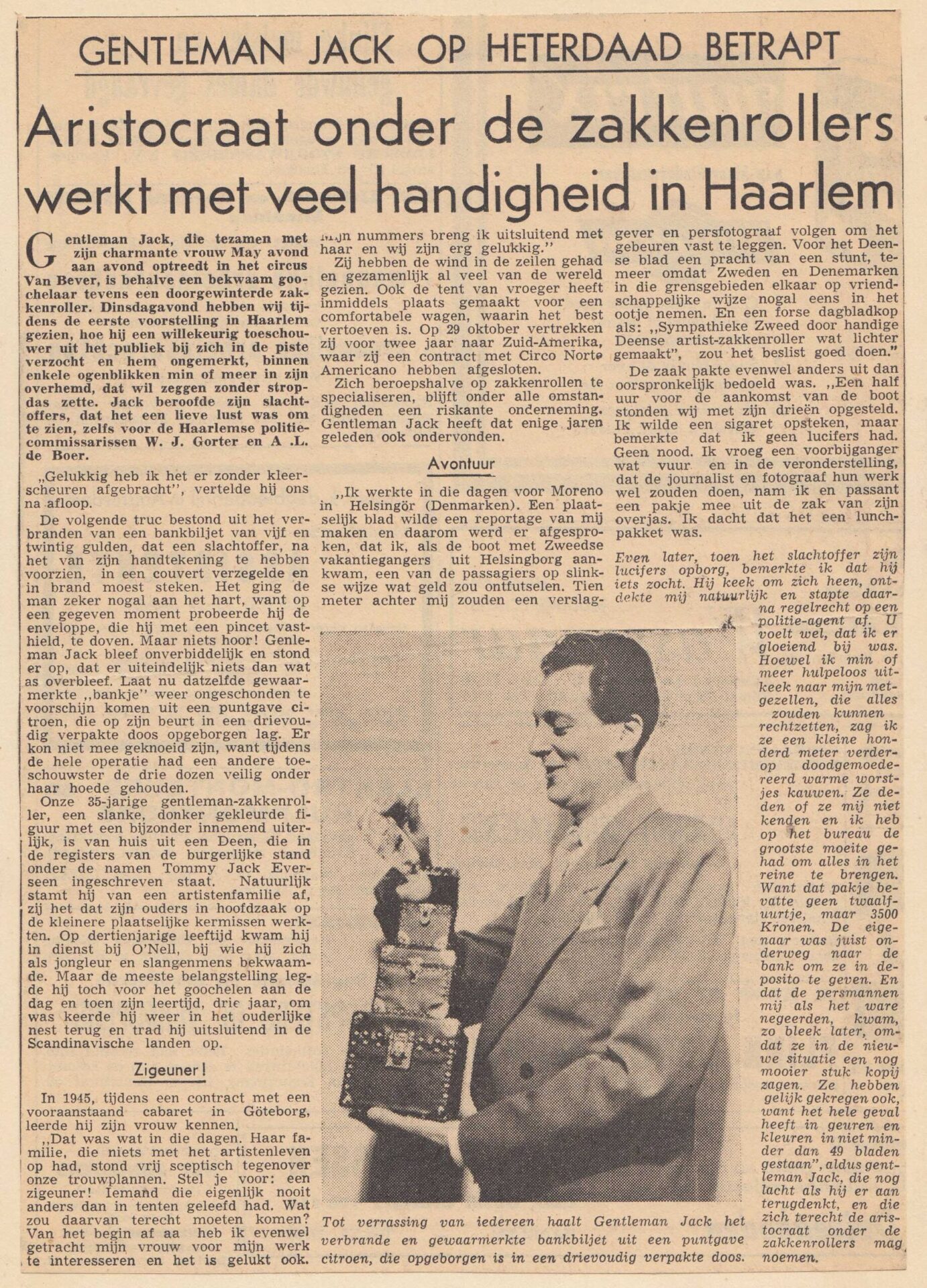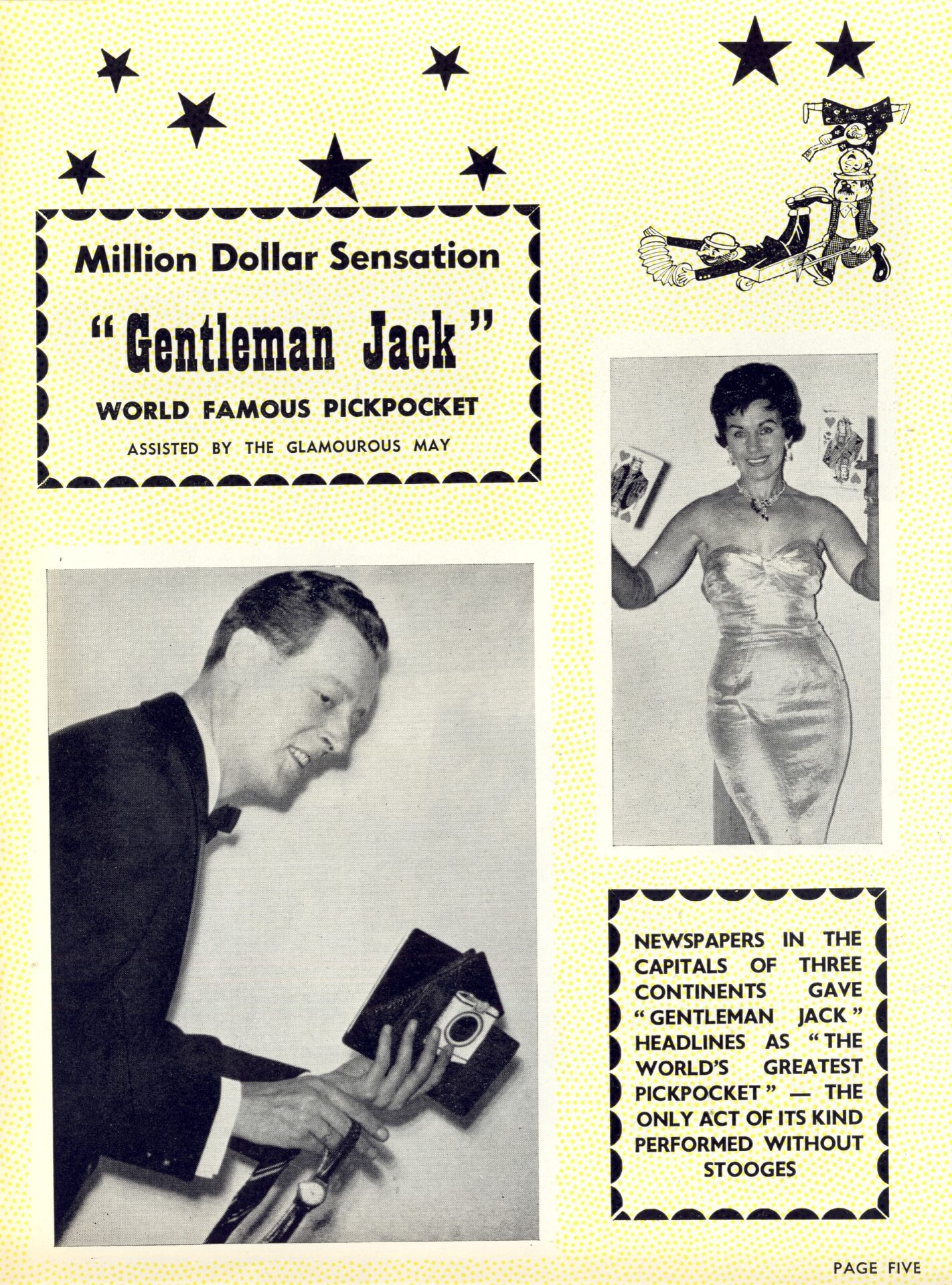 De in Denemarken geboren Gentleman Jack noemde zichzelf “The Aristocraat van het zakkenrollen” of “Gentleman Jack – De snelste handen ter wereld”. Hij kon toeschouwers manipuleren en sprak acht verschillende talen en reisde, samen met zijn vrouw Maj-lis, naar meer dan twintig verschillende landen op alle vijf de continenten, waar hij overal publiciteit kreeg met zijn elegante en gladde ‘Pick pocket’ Act. En hij verscheen in veel van de Scandinavische en Europese grote circussen en variététheaters van zijn tijd. Gentleman Jack was in Nederland te zien bij Circus van Bever in 1956.