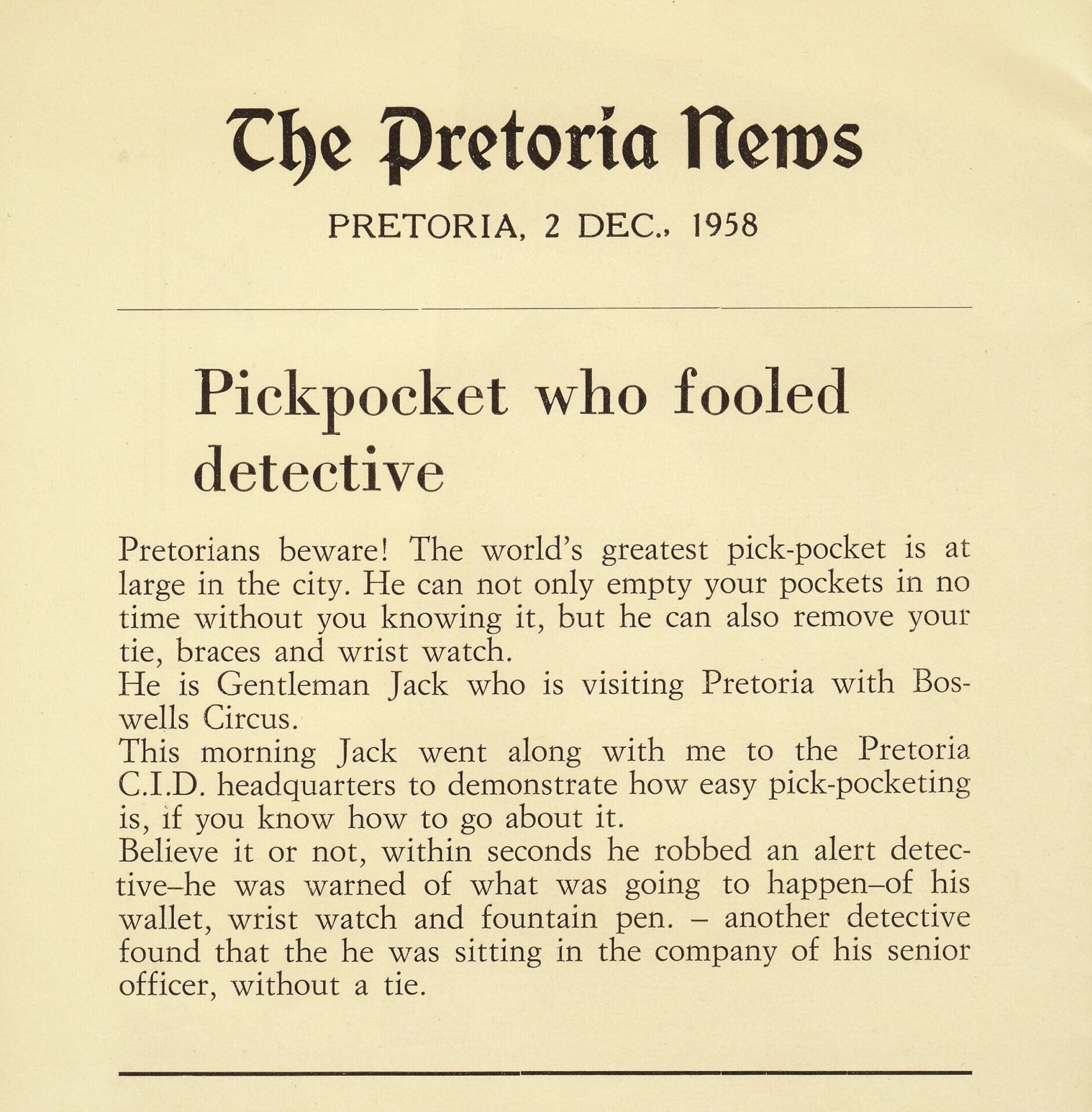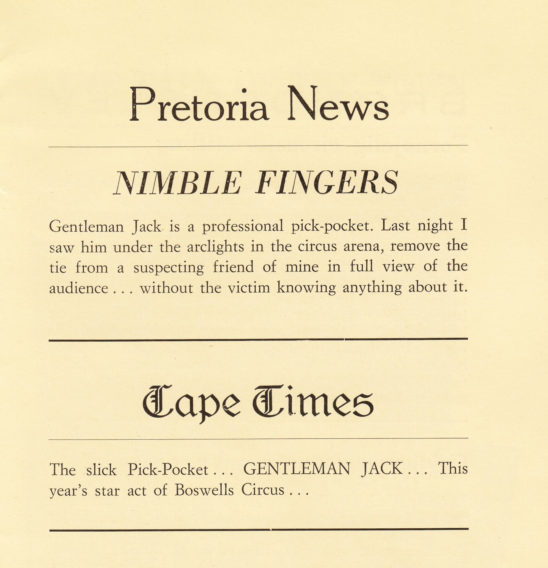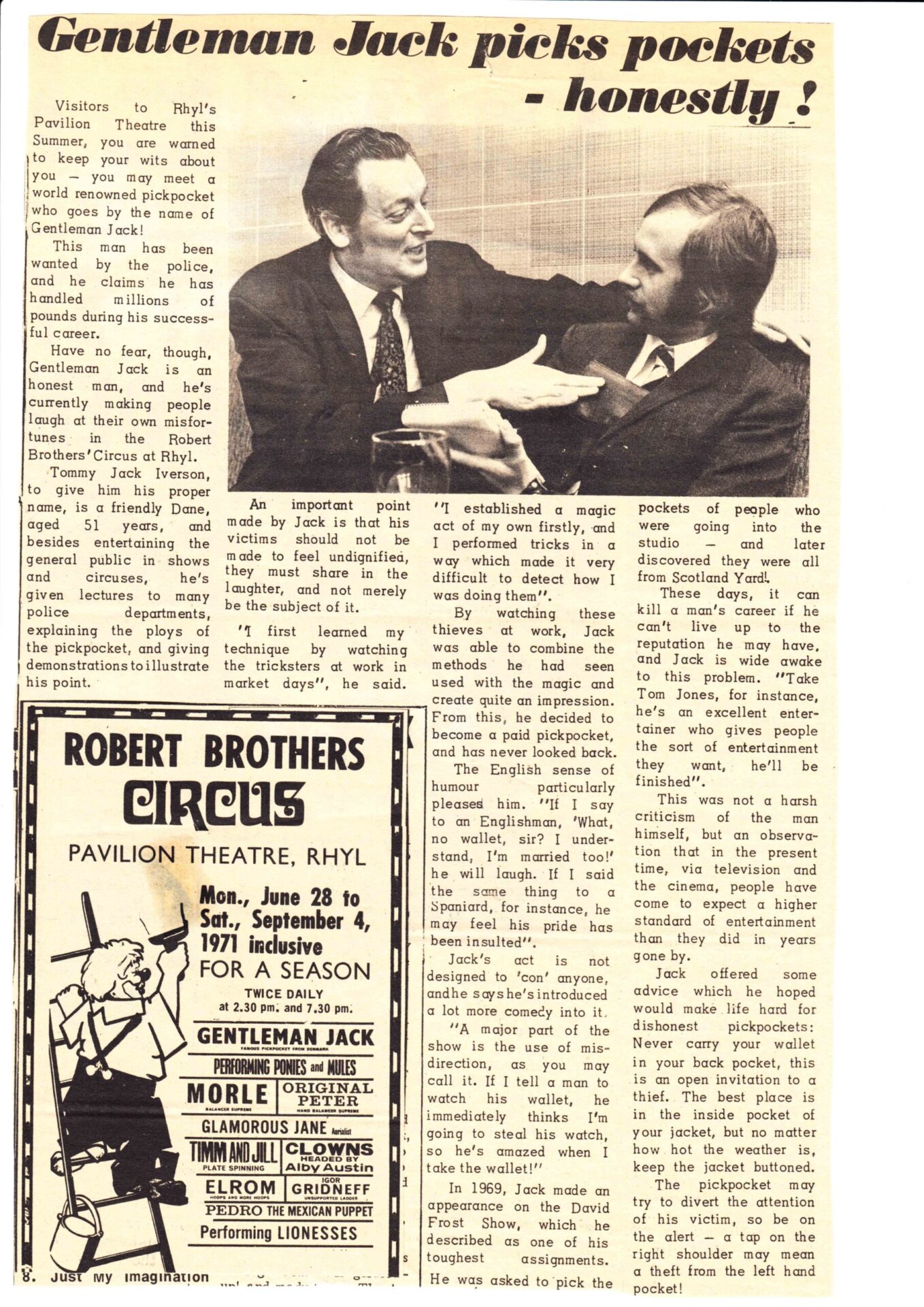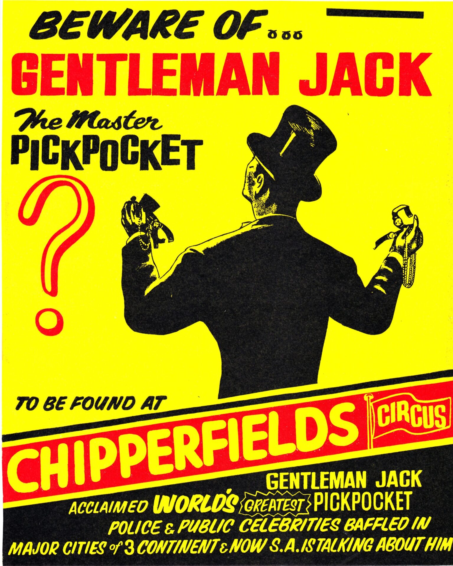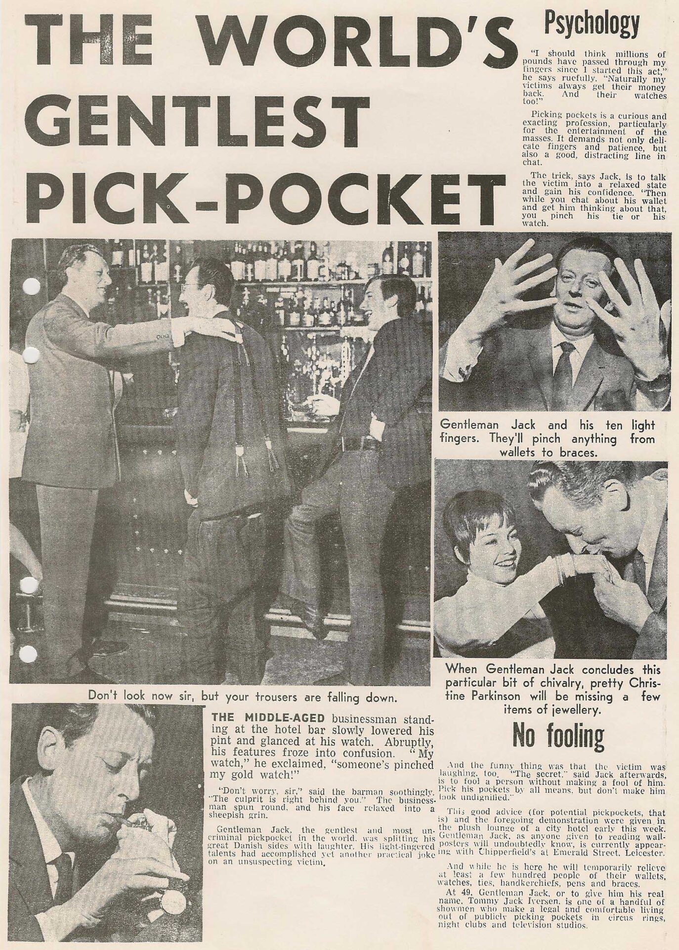 De in Denemarken geboren Gentleman Jack noemde zichzelf “The Aristocraat van het zakkenrollen” of “Gentleman Jack – De snelste handen ter wereld”. Hij kon toeschouwers manipuleren en sprak acht verschillende talen en reisde, samen met zijn vrouw Maj-lis, naar meer dan twintig verschillende landen op alle vijf de continenten, waar hij overal publiciteit kreeg met zijn elegante en gladde ‘Pick pocket’ Act. En hij verscheen in veel van de Scandinavische en Europese grote circussen en variététheaters van zijn tijd. Gentleman Jack was in Nederland te zien bij Circus van Bever in 1956.