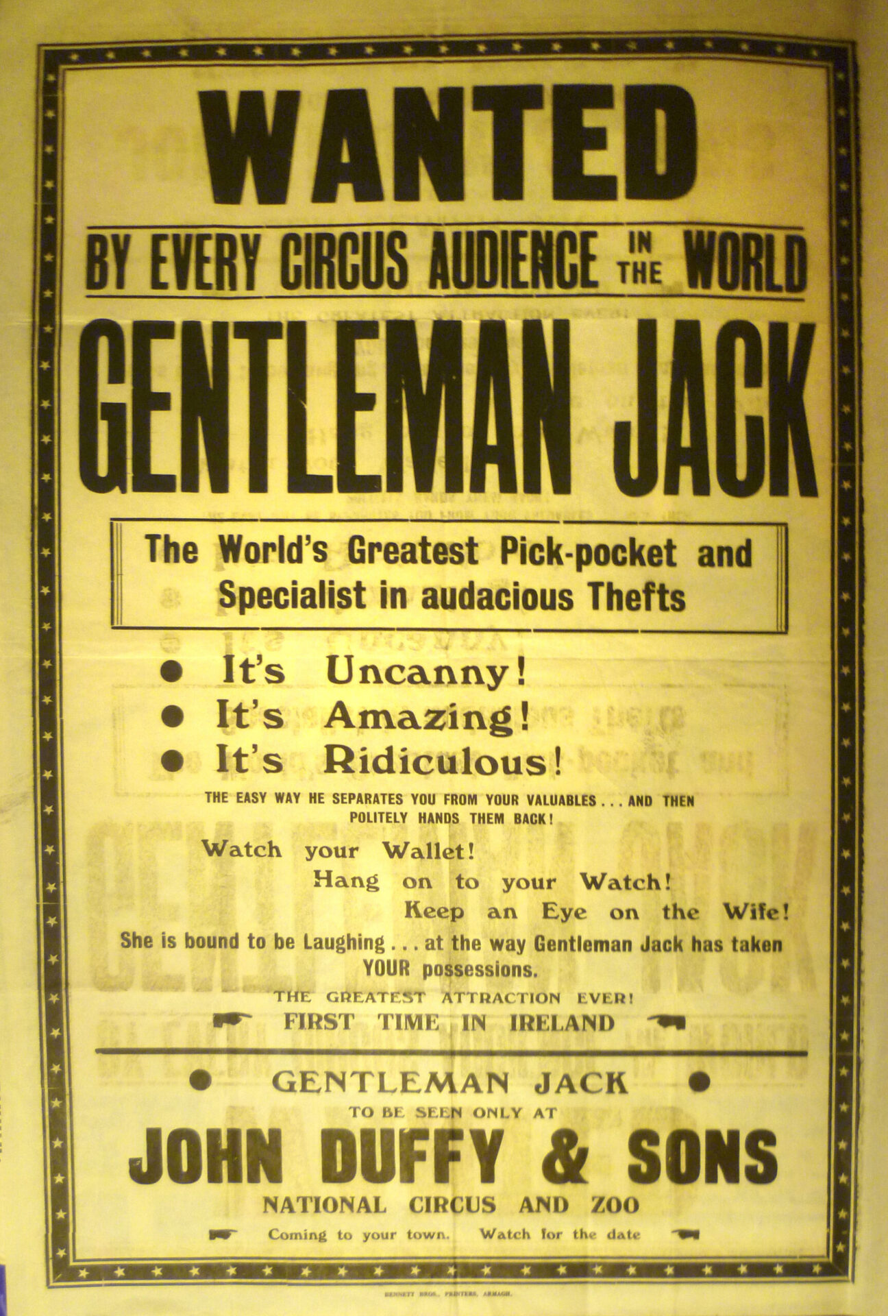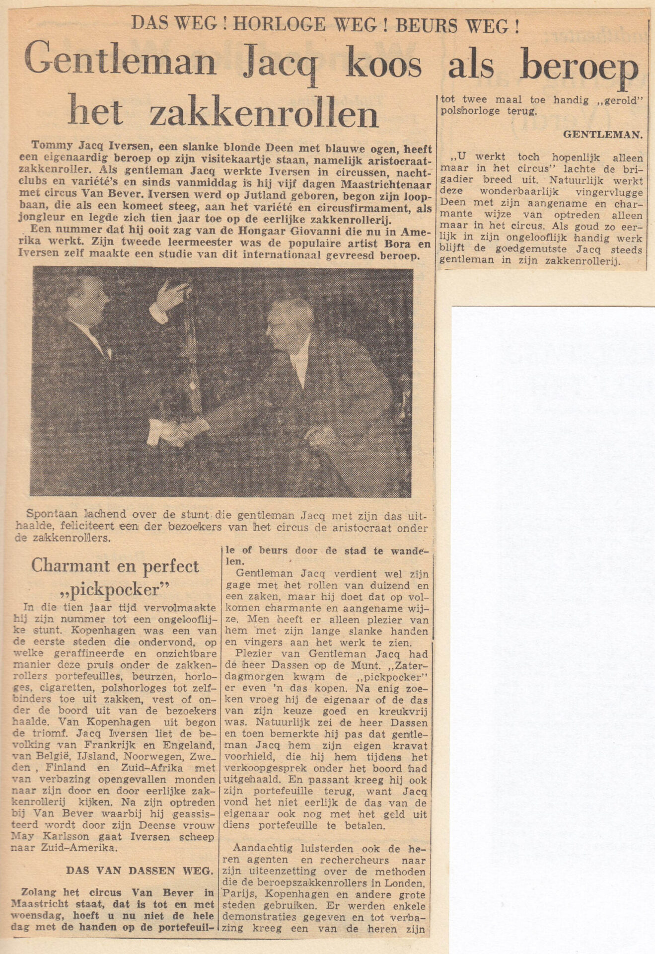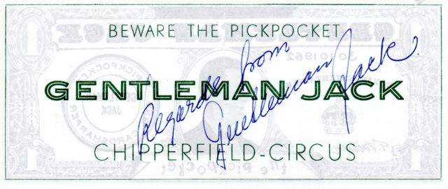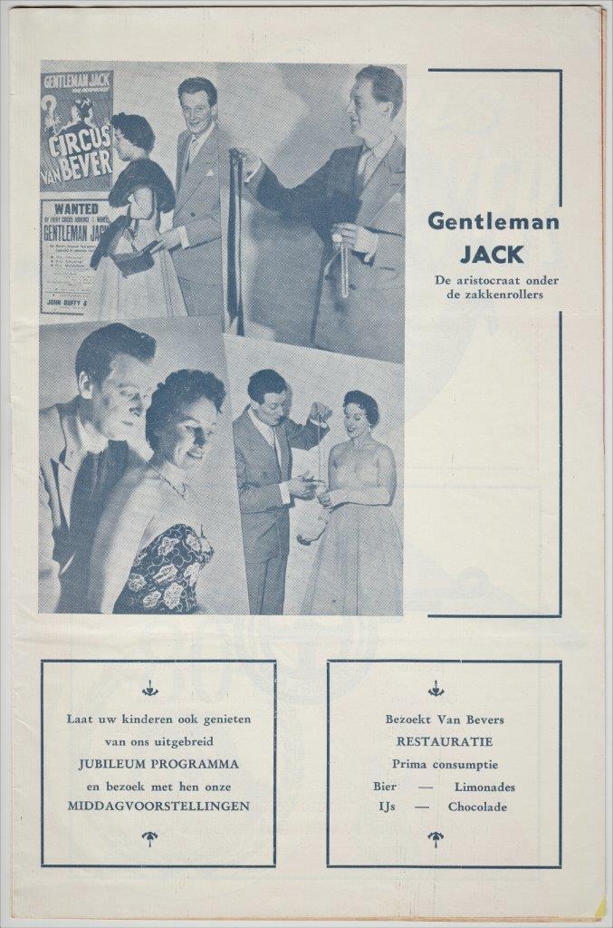 In zijn late jaar werd Gentleman Jack mentor van vele jonge goochelaars en zakkenrollers, waaronder de meester-zakkenroller Kenny Quinn. De vrijgevigheid van Gentleman Jack kwam velen ten goede in hun magische ontwikkeling. Kenny Quinn is deze winter te zien in Kerstcircus Haarlem, dan toont hij daar zijn zakkenrollers-kunsten. Vandaag tonen wij een deel uit zijn privé collectie, een unieke verzameling met foto’s, posters, krantenartikelen (ook in het Nederlands!) en curiosa over Gentleman Jack.