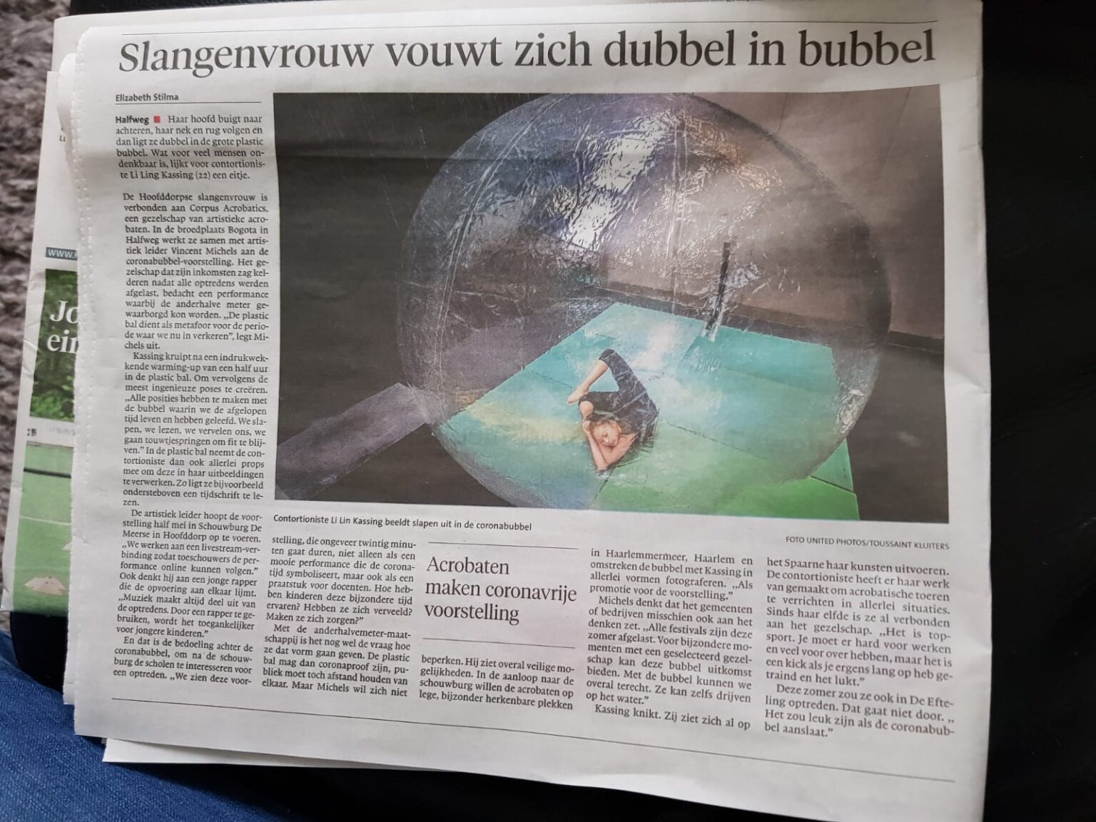 Het zijn bijzondere tijden met veel uitdagingen. Door het Covid 19 pandemie en de maatregelen van de overheid kan ook Corpus tot september geen optredens presenteren. Ze zijn genoodzaakt binnen de beperkingen naar nieuwe mogelijkheden te zoeken naar nieuwe mogelijkheden zoals Het online trainingen geven, het schrijven van nieuwe concepten en het ontwikkelen van nieuwe creaties. Zo hebben zij de afgelopen weken de Corona Bubbel gecreëerd.