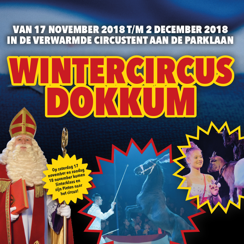 Van 17 november tot en met 2 december staat Circus Bossle in Dokkum aan de Parklaan. Alle zaterdagen voorstellingen om 16.30, alle zondagen om 14:00 uur. Op woensdag zijn er voorstellingen om 15:00 uur. Sinterklaas en zijn pieten zullen ook verschijnen in de shows op zaterdag 17 novemberen zondag 18 november.