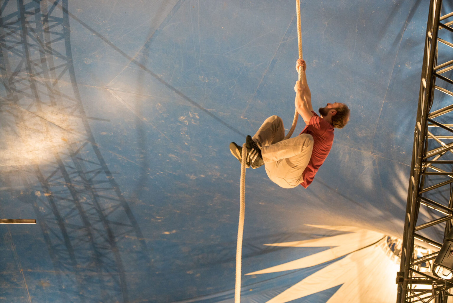 In het wondermooie Le Vide brengen een verticale-koord-danser en een muzikant De mythe van Sisyphus tot leven. In dat verhaal moet Sisyphus tot in de oneindigheid een rots een berg op duwen. In de voorstelling blijft Fragan touwklimmen. Een op-het-puntje-van-je-
