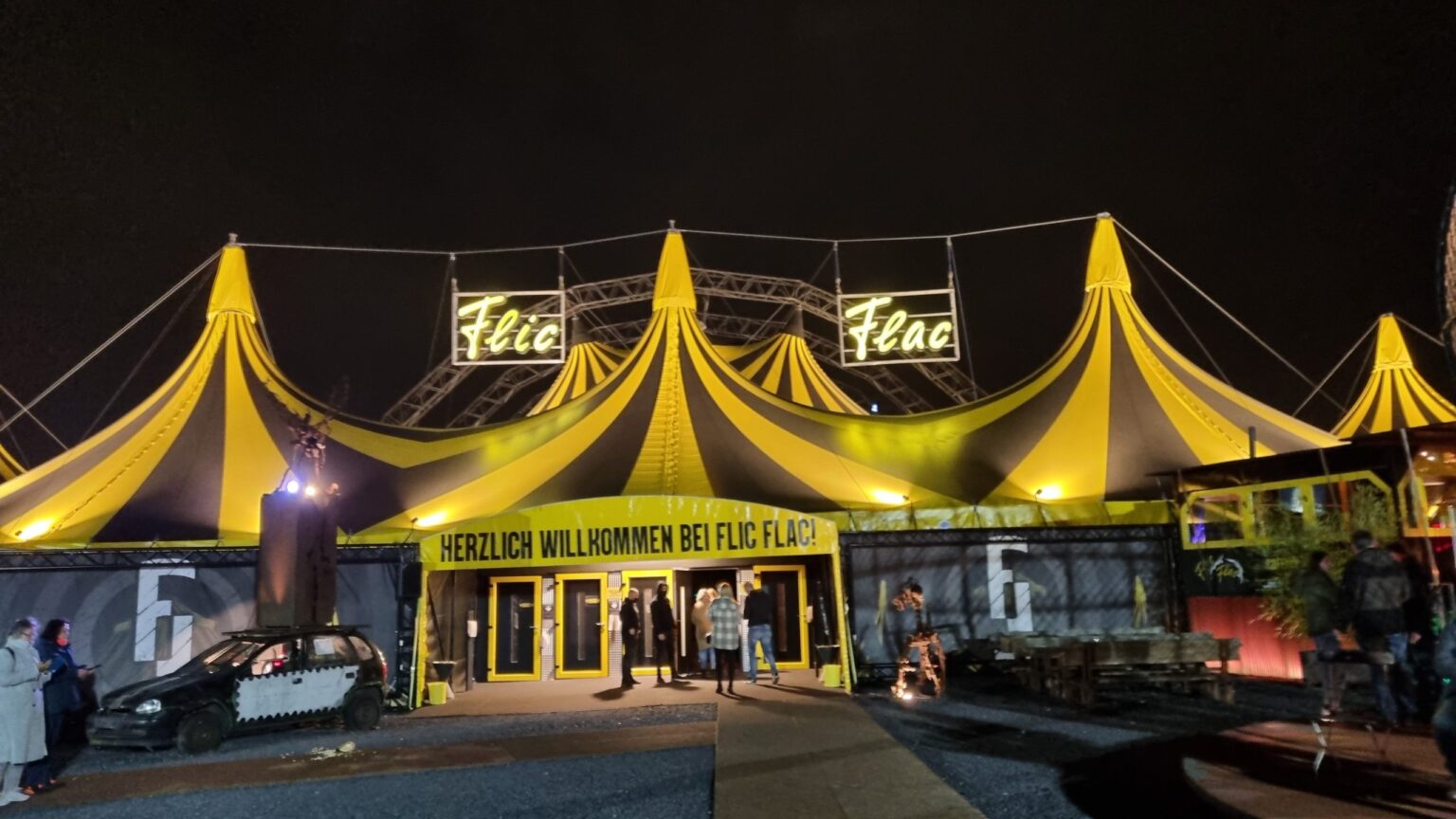 Duitsland-Duisburg, Sinds 5 oktober 2021 speelt Circus Flic Flac de show “Permanent” naast het station in Duisburg en ze spelen daar in ieder geval t/m maart 2022. Vooralsnog is het succes enorm er zijn nu al nauwelijks kaarten verkrijgbaar. Het tentencomplex is enorm, is het parkeerterrein nog behoorlijk hobbelig, de inrichting in de tent is perfect; overal vloeren met tapijt, zitjes, goede verwarming, keurige verkoopstands en vriendelijk personeel. En de show is spectaculair en fantastisch.