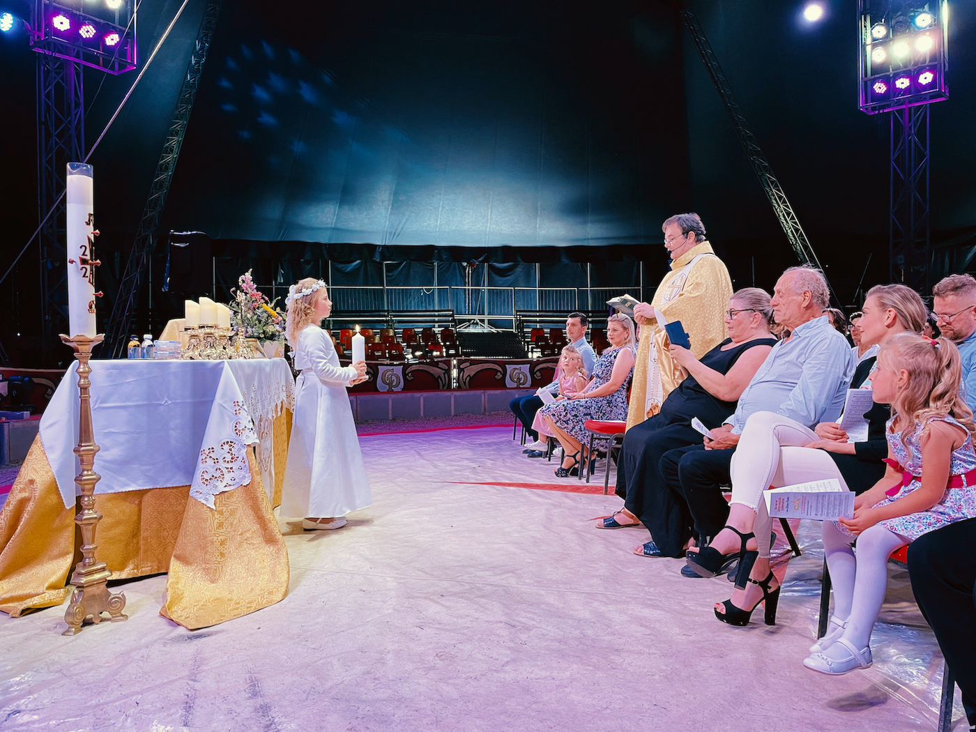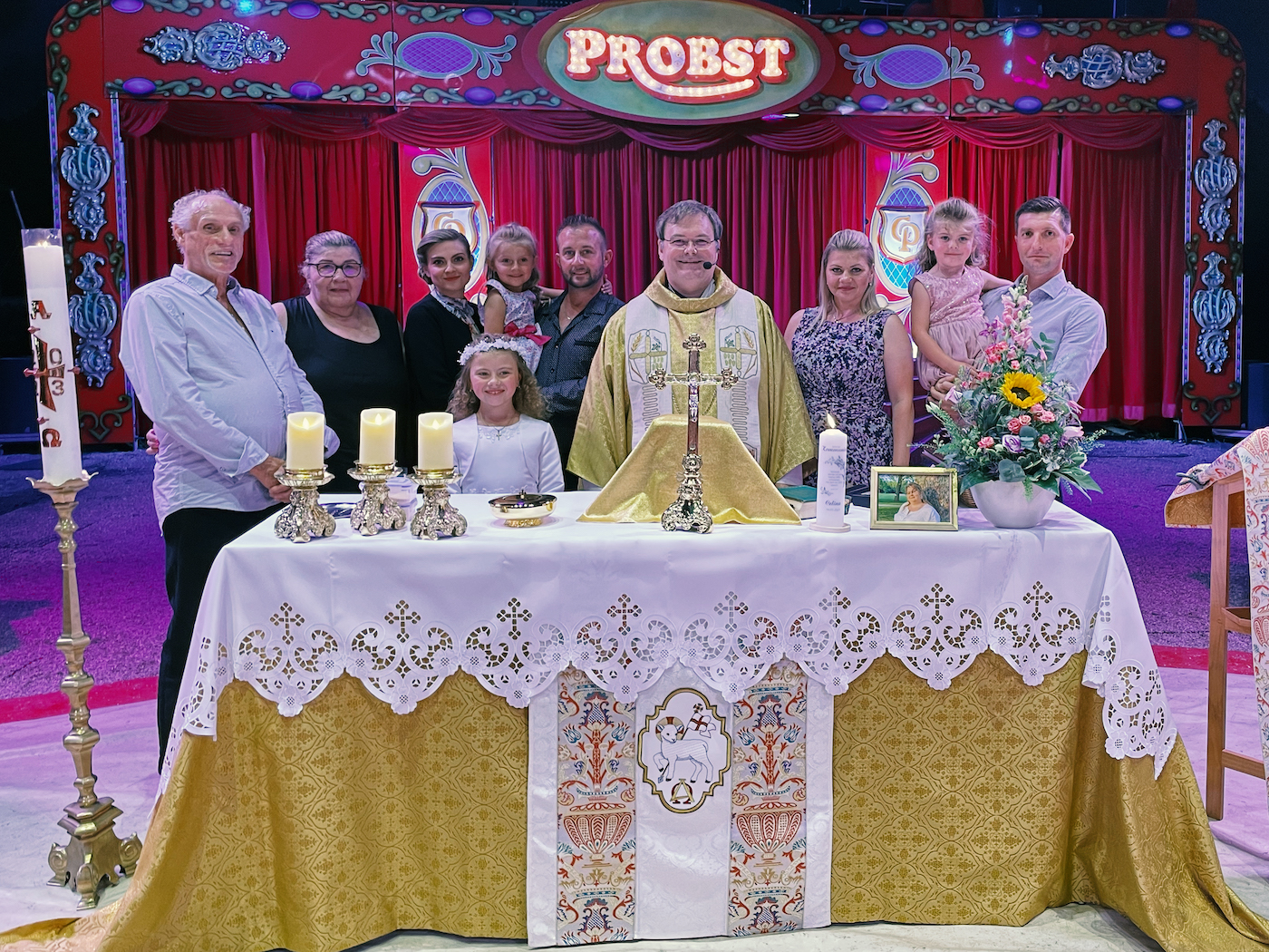 In het Duitse Magdeburg veranderde de circustent van Circus Probst in de bijzondere setting van een kerk. Want: afgelopen 4 juli 2023 deed Celina – dochter van Stephanie Probst en Sergiu Mosanu – daar haar haar ‘Heilige Communie’.