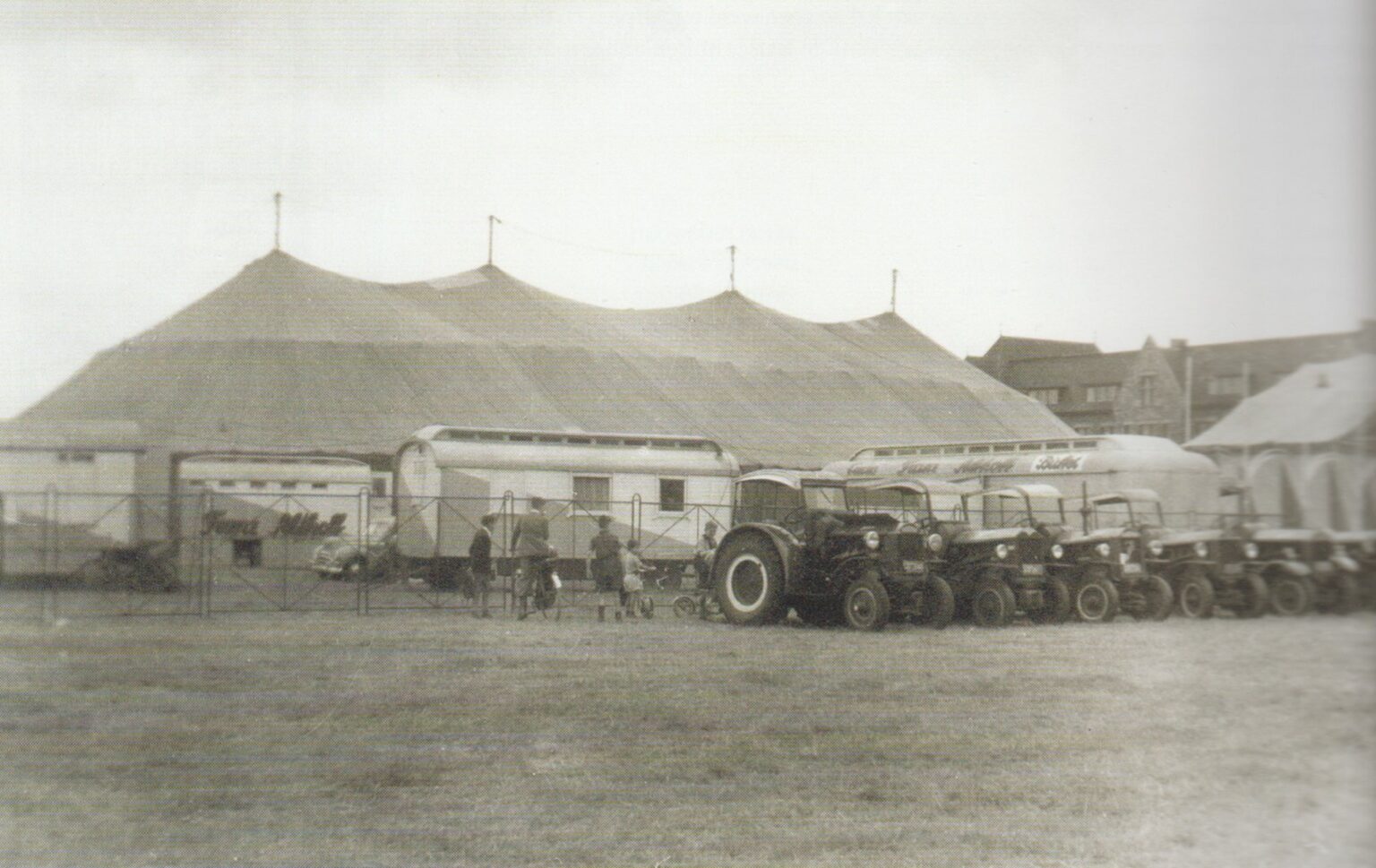 Een zee van blauw-witte wagens, verladen op platte spoorwagons, vulde het gehele emplacement. Het gigantische Duitse circus Franz Althoff was gearriveerd, en Heerlen zou het weten… Maar liefst 3 speciale lange treinen waren er nodig om alle wagens en dieren te vervoeren. Die kwamen uit Roermond, waar Althoff de avond tevoren nog een voorstelling had gegeven. Meteen werd begonnen met het ontladen van de wagens, die door zware Hanomag en Lanz Bulldog tractoren in pendeldienst naar het Bekkerveld gesleept werden. Het was een drukte van jewelste, en ik kon het allemaal van nabij volgen, want gezien mijn leeftijd, viereneenhalf jaar jong, hoefde ik nog niet naar school. Dankzij mijn redelijk fotografisch geheugen kan ik mij de beelden nog heel goed voor de geest halen.