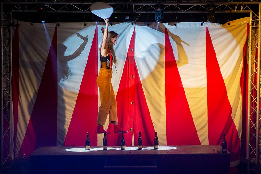 In de pauze doen we een aanval op de poffertjes, bereid in de circuspiste en een echte lekkernij. Na de pauze een onvervalste hogedraadact, zoals je al jaren in een circus ziet. Jofri komt met een leuke glasbalans, het valt me op dat dit toch een allround circusartiest is die bijna alles kan. Annemarie Platteschor, die na Circus Bongo haar debuut maakt als afgestudeerde van Acapa, zit als een echte slons op de achtergrond zich te bezatten aan wijn. Maar uiteindelijk mondt dit uit in een unieke balans op lege wijnflessen. Doe dat maar eens na. Ik heb het nog nooit gezien in een circus. Van die Annemarie willen we zeker meer weten, maar daar komen we later op terug.