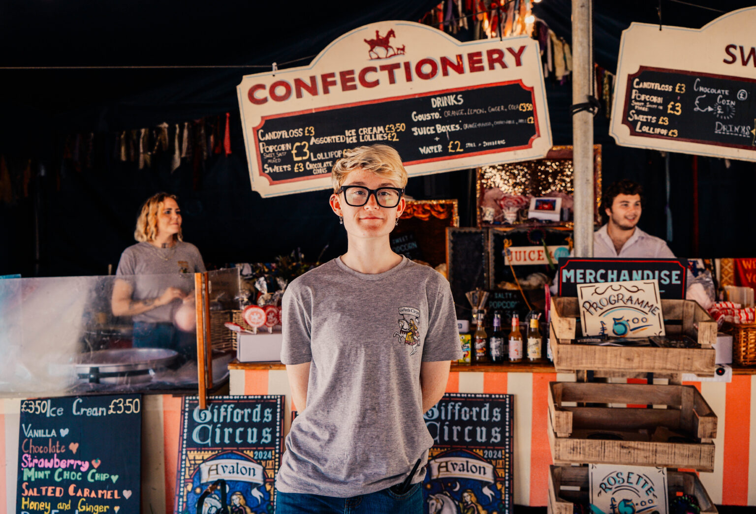 “Ik ben – zoals het voluit heet – ‘front of house supervisor’. Samengevat houd ik me bezig met alles wat de bezoekers qua bijvoorbeeld eten en drinken kunnen kopen én met het team dat daarvoor werkzaam is. Denk daarbij aan: degene die in de kassa zit en de meiden die het publiek welkom heten en naar hun plekken brengen. Samen zorgen we ervoor dat alles er piekfijn uitziet en een bezoek aan Giffords Circus voor het publiek als een warm bad aanvoelt.