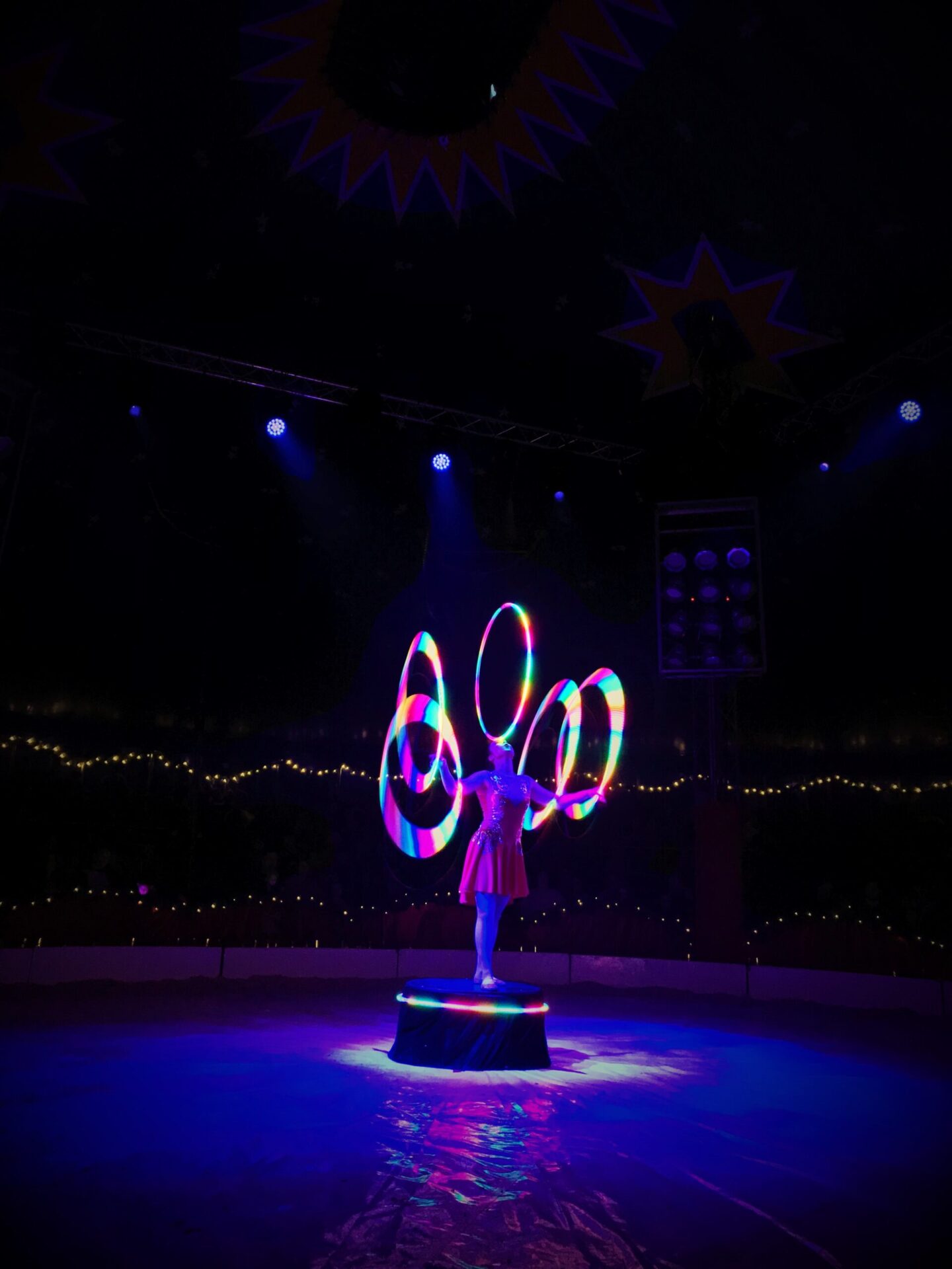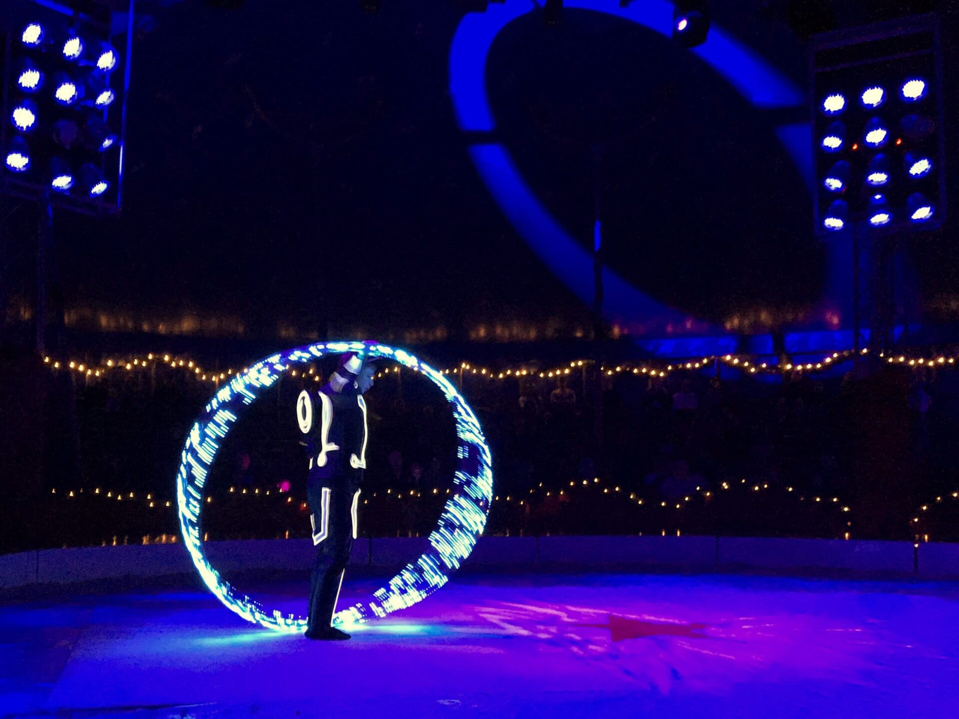 En dat ook het ‘Hoela Hoepen’ met de tijd mee verandert, dat laat de uit Oekraine afkomstige Ievgennia zien. Al draaiende in een mensgrote hoepel vol ledverlichting, laat Anton Lakubovskii, zien wat de kunst van het licht is…