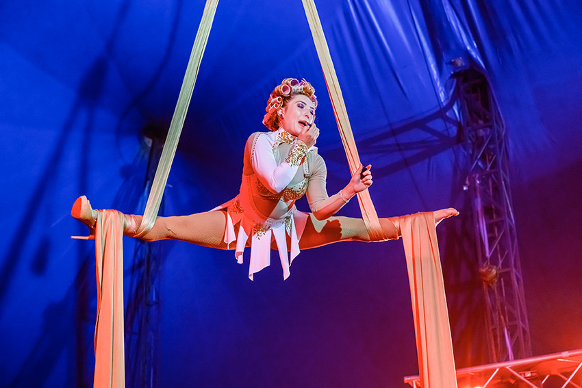 De intimiteit van de Magic Dome circustent zorgt dat publiek en artiesten elkaar niet kwijtraken. Zelfs op de achterste rij zit je met je neus nog bovenop deze unieke missing-link tussen traditioneel circus en elitair “nieuw” circus.
