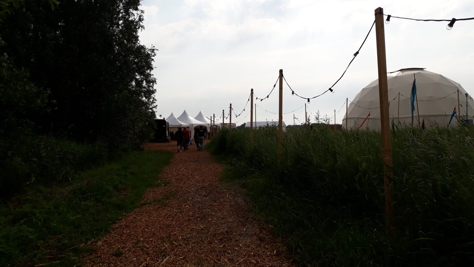 Wat een sfeervolle ambiance in zo’n bamboo tent die speciaal voor deze voorstelling is gebouwd. Het ziet er heel apart uit. Het publiek staat een tijdje buiten te wachten tot de tent open gaat en de artiesten komen al spelend en zingend ons tegemoet, en het publiek volgt de artiesten naar binnen. Het publiek stroomt vlot door want de kaartjescontrole is al achter de rug. En zodra iedereen zit merk je dat de voorstelling eigenlijk al begonnen is. De muziek speelt, de muzikanten lopen al spelend op het toneel. En vanaf dat moment kom je eigenlijk ogen te kort om alles te kunnen volgen, zoveel gebeurt er tegelijkertijd. Hoog boven het toneel hangen kegelvormige attributen, uit een van die attributen komt een acrobate tevoorschijn die na een partijtje schommelen gaat werken met paal-acrobatiek. Daarnaast is een luchtacrobate bezig om in een touw te klimmen, op een elegante manier vertoont zij haar kunsten. Andere artiesten lopen muziekspelend op het toneel rond. De kledij doet middeleeuws aan. Ach, kijk maar even naar het volgende filmpje, dan zie je een mooi fragment.