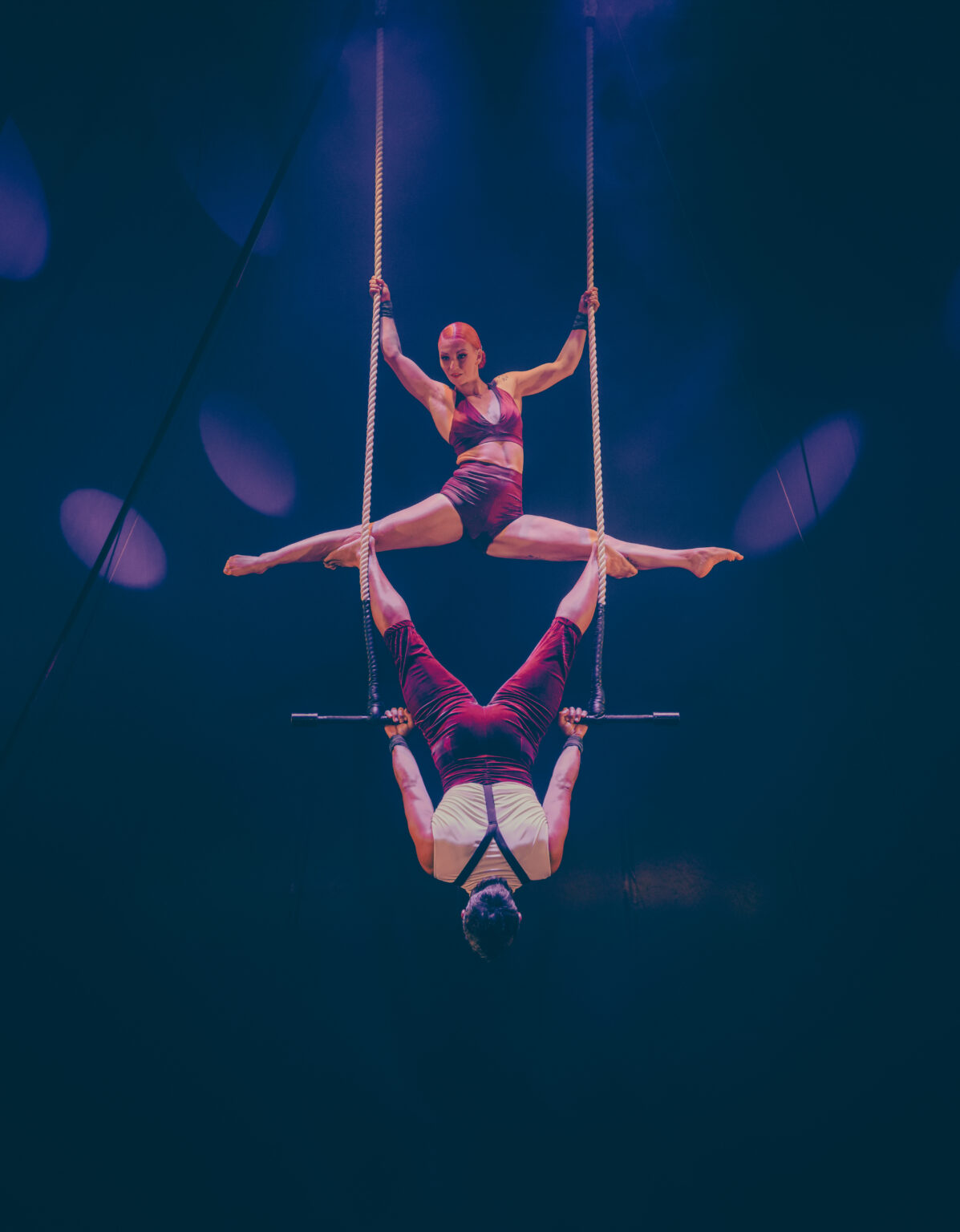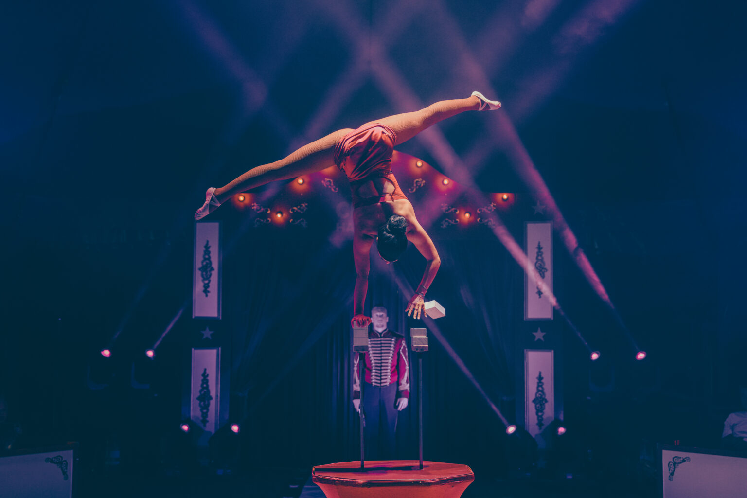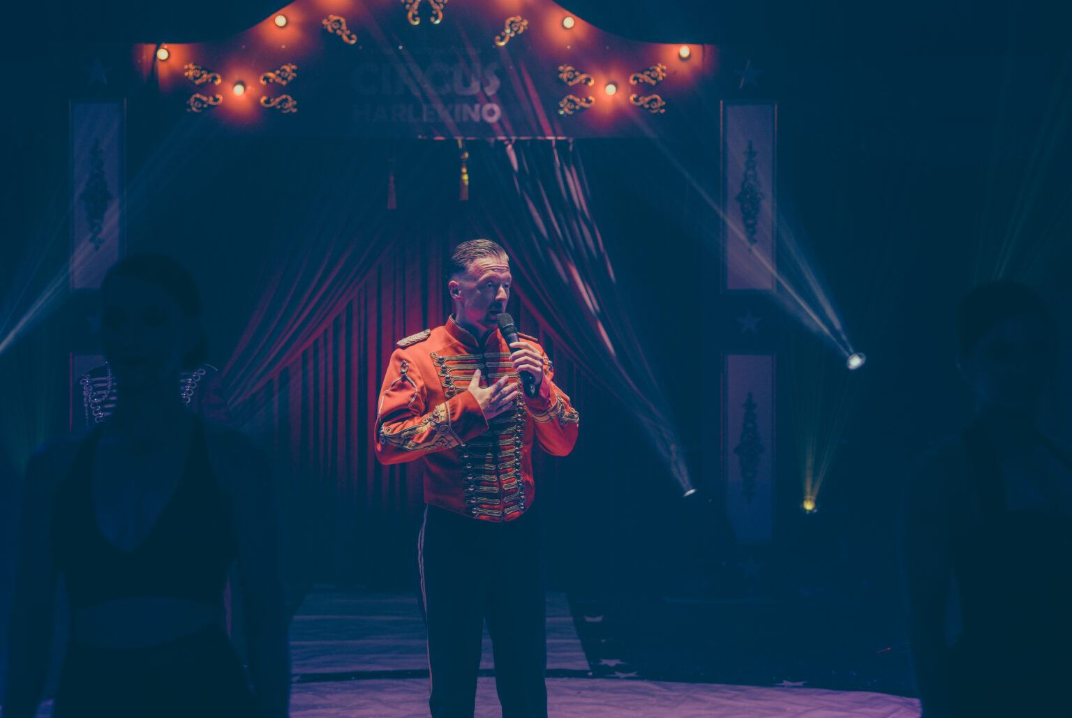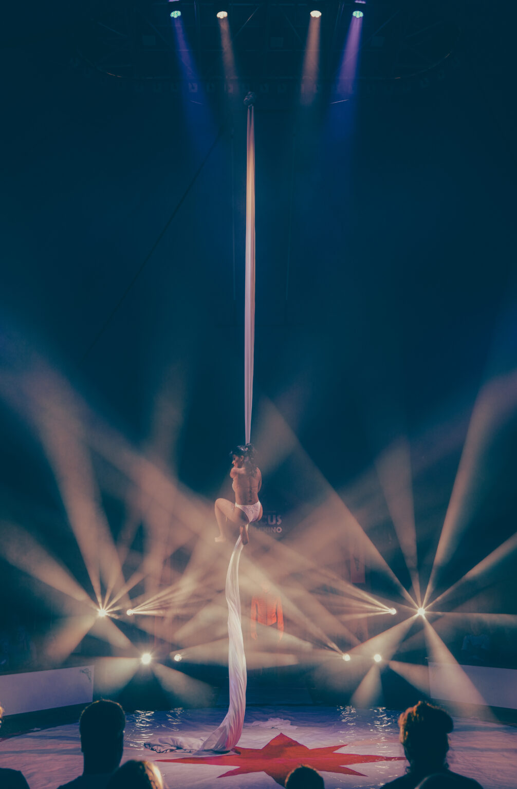 De voorstelling opent met artieste Emi Velkova aan de aerial tissue. Haar act wordt stijlvol belicht en maakt direct indruk. Wat opvalt: in de nieuwe tent, met het donkere zeil, komen zowel de verlichting als de artiesteningang veel beter en eleganter uit de verf. Het draagt bij aan de volwassen uitstraling van Harlekino anno 2025.