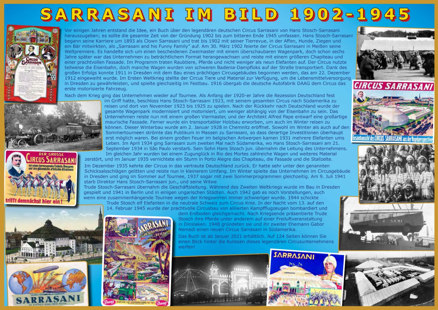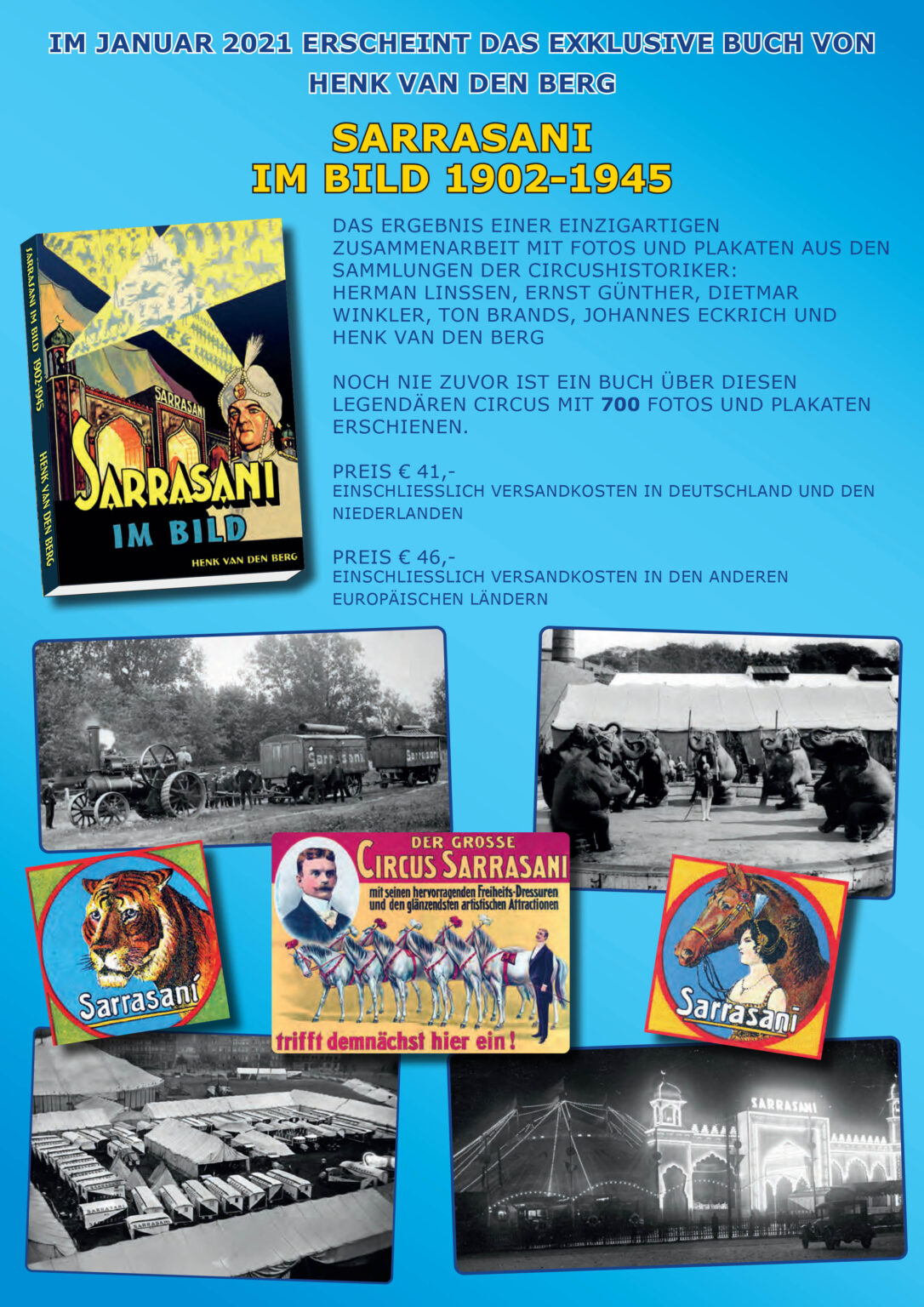 Vor einigen Jahren entstand die Idee, ein Buch über den legendären deutschen Circus Sarrasani von Hans Stosch-Sarrasani herauszugeben; es sollte die gesamte Zeit von der Gründung 1902 bis zum bitteren Ende 1945 umfassen. Hans Stosch-Sarrasani begann seine Karriere um 1893 als Clown Sarrasani und trat bis 1902 mit seiner Tierrevue, in der Affen, Hunde, Ziegen und ein Bär mitwirkten, als „Sarrasani and his Funny Family” auf. Am 30. März 1902 feierte der Circus Sarrasani in Meißen seine Weltpremiere. Es handelte sich um einen bescheidenen Zweimaster mit einem überschaubaren Wagenpark, doch schon sechs Jahre später war das Unternehmen zu beträchtlichem Format herangewachsen und reiste mit einem größeren Chapiteau und einer prachtvollen Fassade. Im Programm traten Raubtiere, Pferde und nicht weniger als neun Elefanten auf. Der Circus nutzte teilweise die Eisenbahn, doch manche Wagen wurden von schweren Badenia-Dampfloks auf der Straße transportiert. Dank des großen Erfolgs konnte 1911 in Dresden mit dem Bau eines prächtigen Circusgebäudes begonnen werden, das am 22. Dezember 1912 eingeweiht wurde. Im Ersten Weltkrieg stellte der Circus Tiere und Material zur Verfügung, um die Lebensmittelversorgung in Dresden zu gewährleisten, und spielte gleichzeitig im Festbau. 1916 übergab die deutsche Autofabrik DAAG dem Circus das erste motorisierte Fahrzeug. Nach dem Krieg ging das Unternehmen wieder auf Tournee. Als Anfang der 1920-er Jahre die Rezession Deutschland fest im Griff hatte, beschloss Hans Stosch-Sarrasani 1923, mit seinem gesamten Circus nach Südamerika zu reisen und dort von November 1923 bis 1925 zu spielen. Nach der Rückkehr nach Deutschland wurde der gesamte Wagenpark modernisiert und motorisiert, um weniger abhängig von der Eisenbahn zu sein. Das Unternehmen reiste nun mit einem großen Viermaster, und der Architekt Alfred Pape entwarf eine großartige maurische Fassade. Ferner wurde ein transportabler Holzbau erworben, um auch im Winter reisen zu können. Dieser Winterbau wurde am 2. Januar 1928 in Chemnitz eröffnet. Sowohl im Winter als auch auf den Sommertourneen strömte das Publikum in Massen zu Sarrasani, so dass derartige Investitionen überhaupt erst möglich waren. Bei einem großen Feuer im belgischen Antwerpen kamen 1931 mehrere Elefanten ums Leben. Im April 1934 ging Sarrasani zum zweiten Mal nach Südamerika, wo Hans Stosch-Sarrasani am 21. September 1934 in São Paulo verstarb. Sein Sohn Hans Stosch jun. übernahm die Leitung des Unternehmens. Im gleichen Jahr wurden bei einem Zugunglück in Rio des Mortes zahlreiche Wagen und weiteres Material zerstört, und im Januar 1935 vernichtete ein Sturm in Porto Alegre das Chapiteau, die Fassade und die Stallzelte. Im Dezember 1935 kehrte der Circus in das vertraute Deutschland zurück. Er hatte sehr unter den genanntenSchicksalsschlägen gelitten und reiste nun in kleinerem Umfang. Im Winter spielte das Unternehmen im Circusgebäude in Dresden und ging im Sommer auf Tournee, 1937 sogar mit zwei Sommerprogrammen gleichzeitig. Am 9. Juli 1941 starb Direktor Hans Stosch-Sarrasani jun., und seine Witwe Trude Stosch-Sarrasani übernahm die Geschäftsleitung. Während des Zweiten Weltkriegs wurde im Bau in Dresden gespielt und 1941 in Berlin und in einigen ungarischen Städten. Auch 1942 gab es noch Vorstellungen, auch wenn eine zusammenhängende Tournee wegen der Kriegswirren immer schwieriger wurde. 1944 schickte Trude Stosch elf Elefanten in die neutrale Schweiz zum Circus Knie. In der Nacht vom 13. auf den 14. Februar 1945 wurde der prachtvolle Circusbau von alliierten Kampfflugzeugen bombardiert und dem Erdboden gleichgemacht. Nach Kriegsende präsentierte Trude Stosch ihre Pferde unter anderem auf einer Freiluftveranstaltung in Dinslaken. 1948 gründeten sie und ihr zweiter Ehemann Gabor Nemedi einen neuen Circus Sarrasani in Südamerika. Das Buch ist ab Januar 2021 erhältlich. Auf 124 Seiten können Sie einen Blick hinter die Kulissen dieses legendären Circusunternehmens werfen!