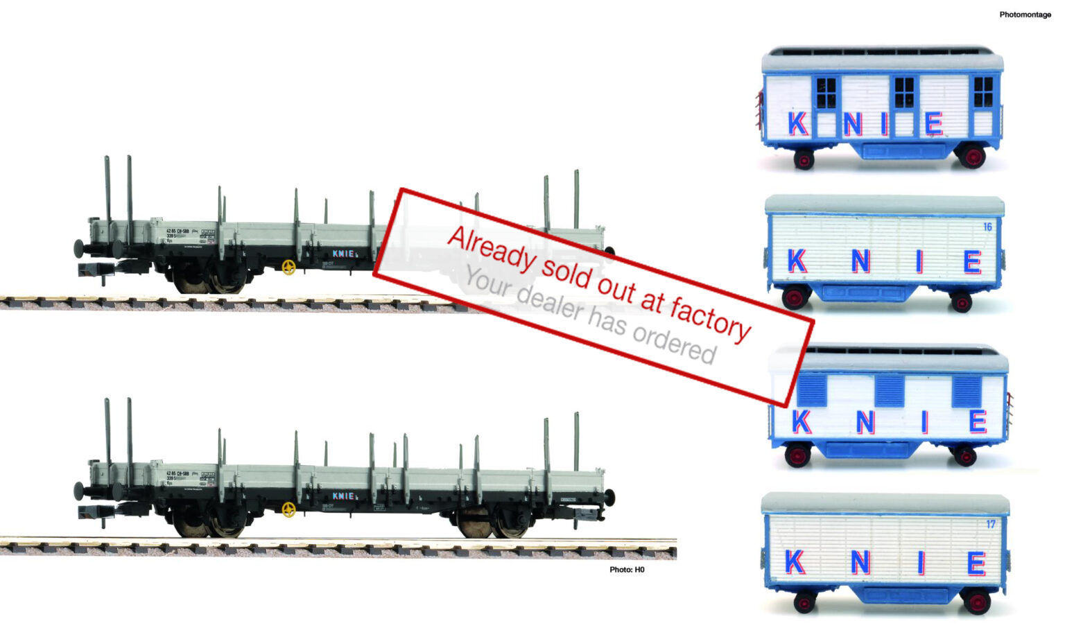 Van modelspoorfabrikant Fleischmann (www.fleischmann.de) verschijnt de komende weken in spoor N. item-no.825732 een Rungenwagen SBB set “100 jaar Zwitsers Nationaal Circus KNIE”