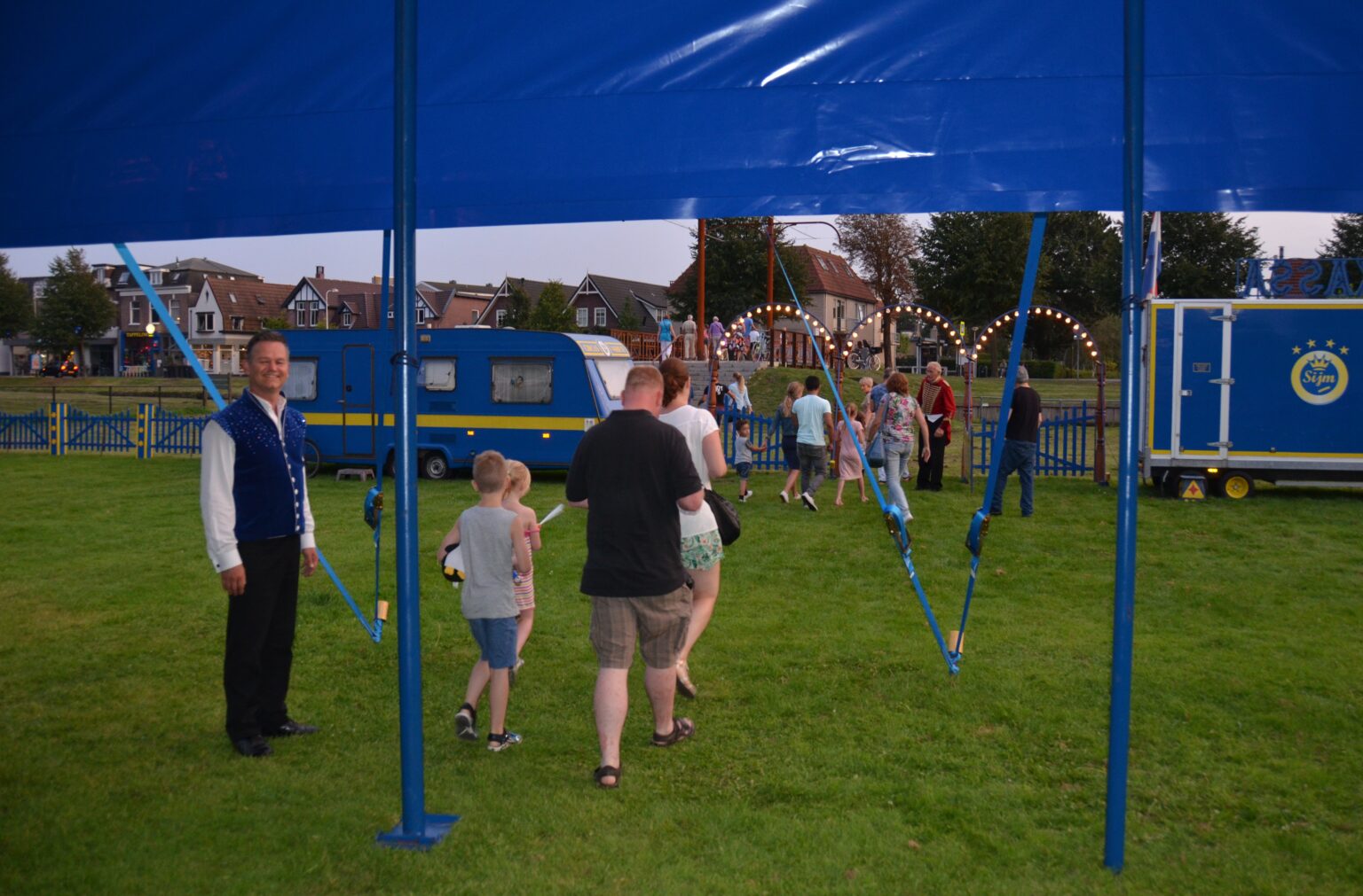 Kort voor de première in Bennebroek arriveerde de nieuwe voortent van Circus Sijm. Dat wil zeggen Circus Sijm 1 want Sijm 2 is inmiddels van start gegaan in Ede. Het was even hard werken in Bennebroek maar ’s avonds stond hij er te blinken in de zomeravondzon. Na de goed bezochte première werden de rondzeilen aangebracht want de weersverwachting was regen, veel regen.