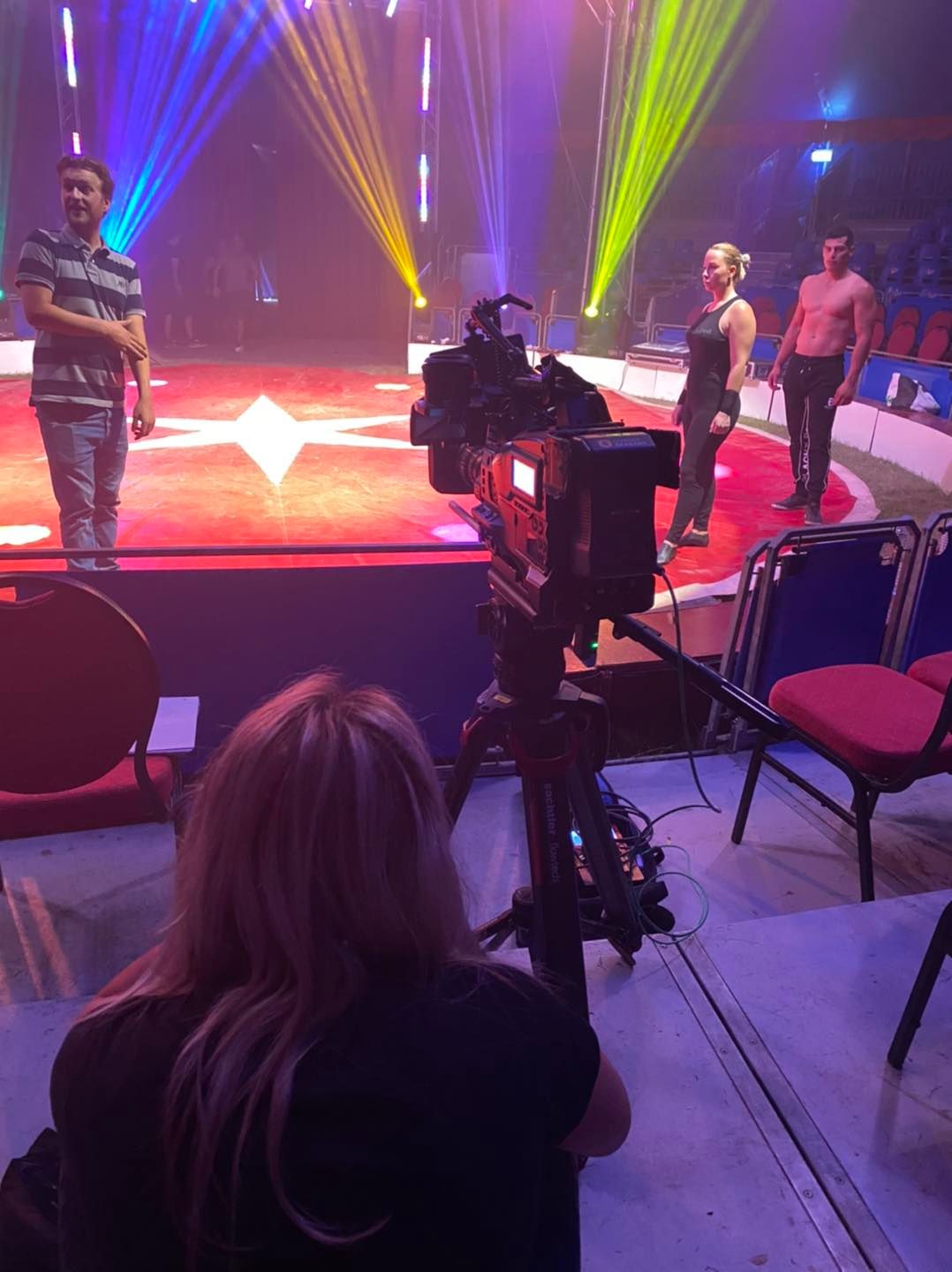 Sandor Donnert is de circusdirecteur van het succesvolle circus in Nederland The Magical World of Circus. Dankzij zijn eigen perfecte circusprogramma is hij de uitgelezen kandidaat om bij Circus Hollandia de regie te doen. Er wordt niets aan het toeval overgelaten en hij is echt een pietje precies merk ik. Klopt het belichtingsplan, wordt de muziek op tijd ingezet, elke seconde van de show wordt onder de loep genomen, de lat ligt bij Sandor erg hoog en dat is ook nodig als je een productie als dat van Circus Hollandia wilt. Op dee foto is hij aan het werk met het duo dat een romantische act in de tissu gaat doen, de techniek boven de ingang krijgt nog een laatste correctie te horen van Donnert terwijl de regionale televisie alvast een opname maakt van de repetities.