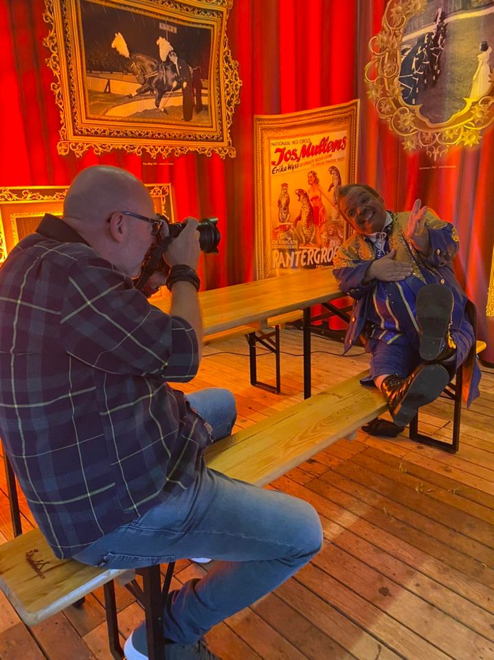 Leendert en Milko nemen even de tijd voor een mooi plaatje in de foyertent, waar aan de zijkant prachtige schilderijtjes zijn opgehangen met een verwijzing uit een roemrijk verleden van het circus in Nederland.