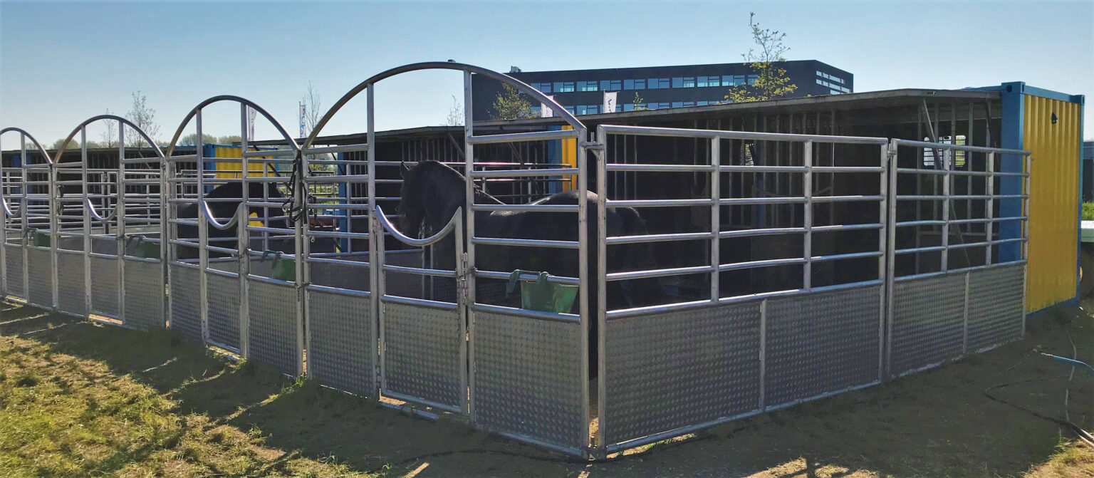 Alle paarden huizen in containerboxen met minimaal 35 vierkante stalruimte, doorgaans meer als in menig manage. De 8 zwarte Friese paarden staan per duo samen in een grote stalbox, de 4 arabieren, hebben elk hun eigen stalbox. De paarden kunnen contact met elkaar hebben. ‘In sommige speelplaatsen, hebben de paarden nog een groter weidegebied’, zo legt Kevin van Geet uit. ‘Elke ochtend gaan de paarden de piste in om daarin lekker rond te rennen en de spieren op te warmen’, aldus Kevin van Geet. Regelmatig wordt ook met de dieren getraind: dat gebeurd door hun natuurlijke gedragingen te versterken door middel van beloning. Inmiddels hebben zich nog enkele belangstellenden zich bij de rondleiding door Kevin van Geet aangesloten.