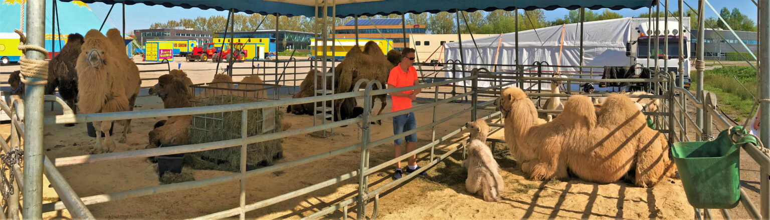 Nadat we Tussen de verblijfswagens en caravans van het circus lopen we verder. We passeren de opvallende circuswagen van paarden dresseur Marlon Zinneker, op weg naar het achter terrein. Op het achter terrein huizen de dieren die het circus rijk is: honden, 2 prachtige witte paarden, 8 diepzwarte Friese paarden 4 witte Arabieren, 2 lama’s, pony’s en de kamelen.