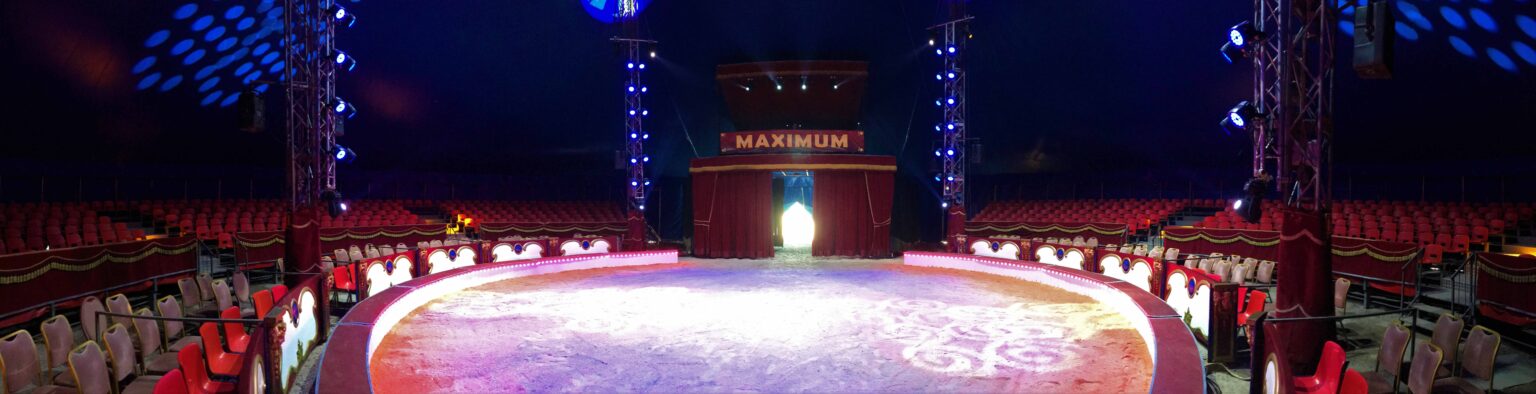 Nu mogen wij ook eens tussen die prachtige showgordijnen door en dan… Jawel! Staan we in de piste van het Circus Maximum. Helaas worden we niet aangekondigd, maar dat fantaseren we er wel bij… De ronde piste is gevuld met een mengsel van zaagsel en zand, wat zorgt voor een aangename zachte ondergrond. De pisterand is omringd door een 4-tal circa 12 meter hoge masten, die alle 4 voorzien zijn van hypermoderne computergestuurde LED-spots. Dit biedt de mogelijkheid om de circusvoorstellingen van allerlei passende lichteffecten te voorzien. Vanuit de piste hebben we zicht op de dan nog lege tribuneplaatsen: 900 zitplaatsen zijn er, allen voorzien van rugleuningen voor voldoende zitcomfort tijdens het bijna 2 uur durende circusprogramma. Hopelijk zijn vanmiddag, vanavond en ook morgen alle zitplaatsen gevuld!